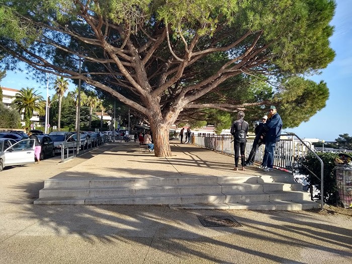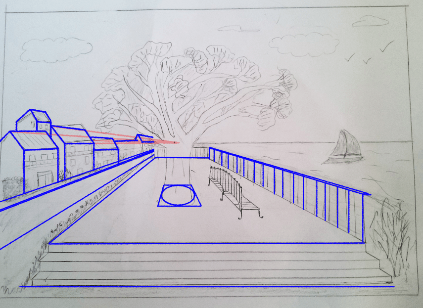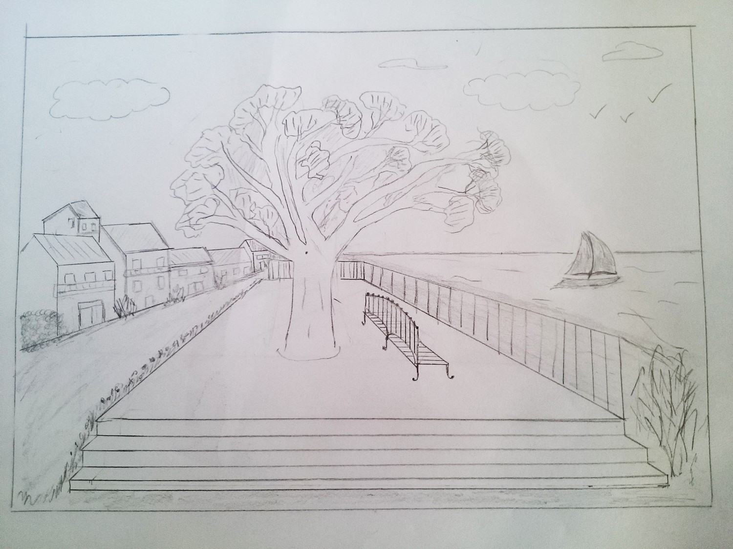 Ensuite, certains éléments de ton dessin manquent un peu de volume. L'arbre par exemple fait très plat, et commencer par construire sa base en perspective pour avoir une base qui semble plus ronde est un bon début. Le barrière fait très "fil de fer" aussi, lui donner un peu d'épaisseur apporterait un peu plus de profondeur.