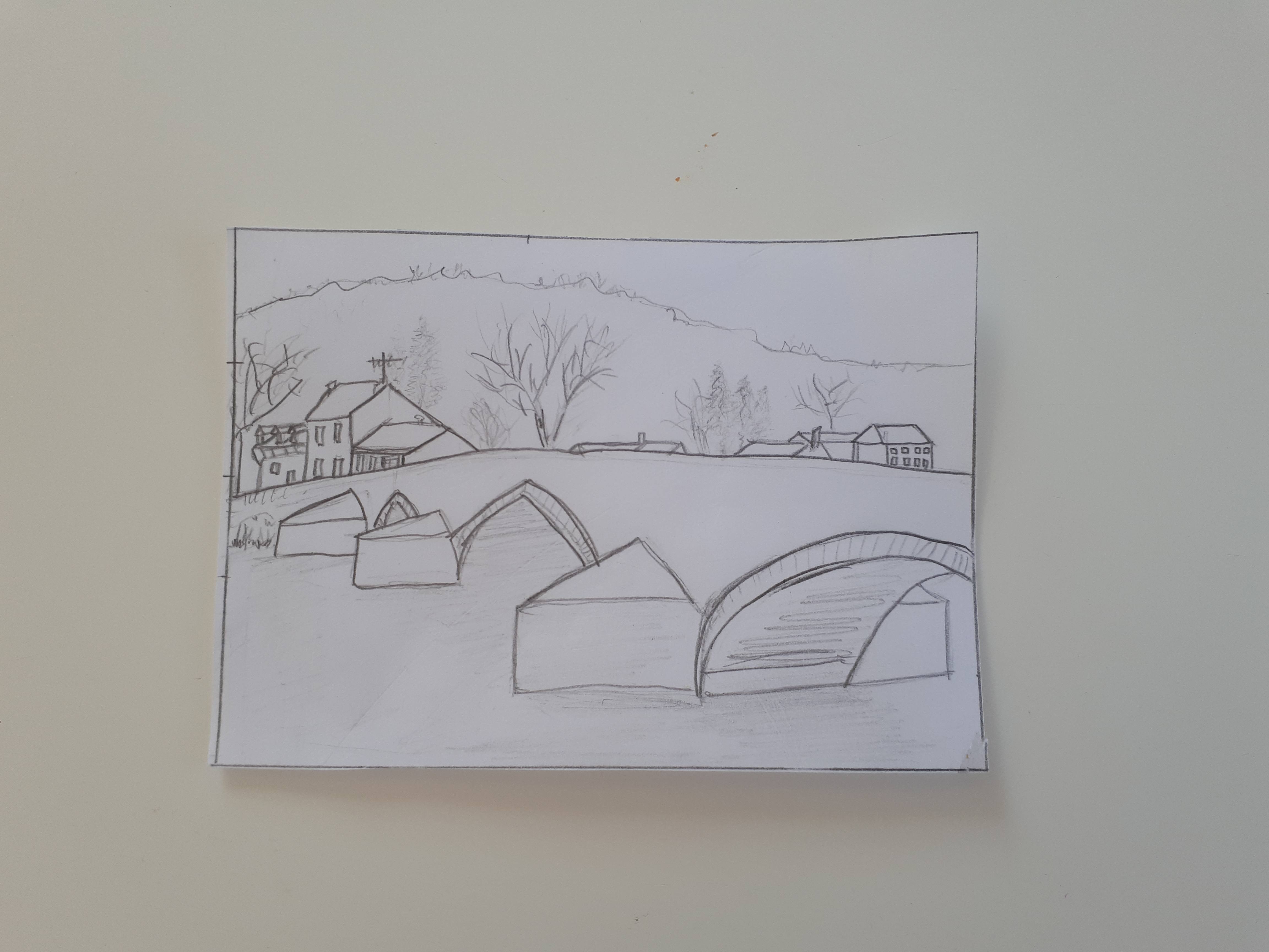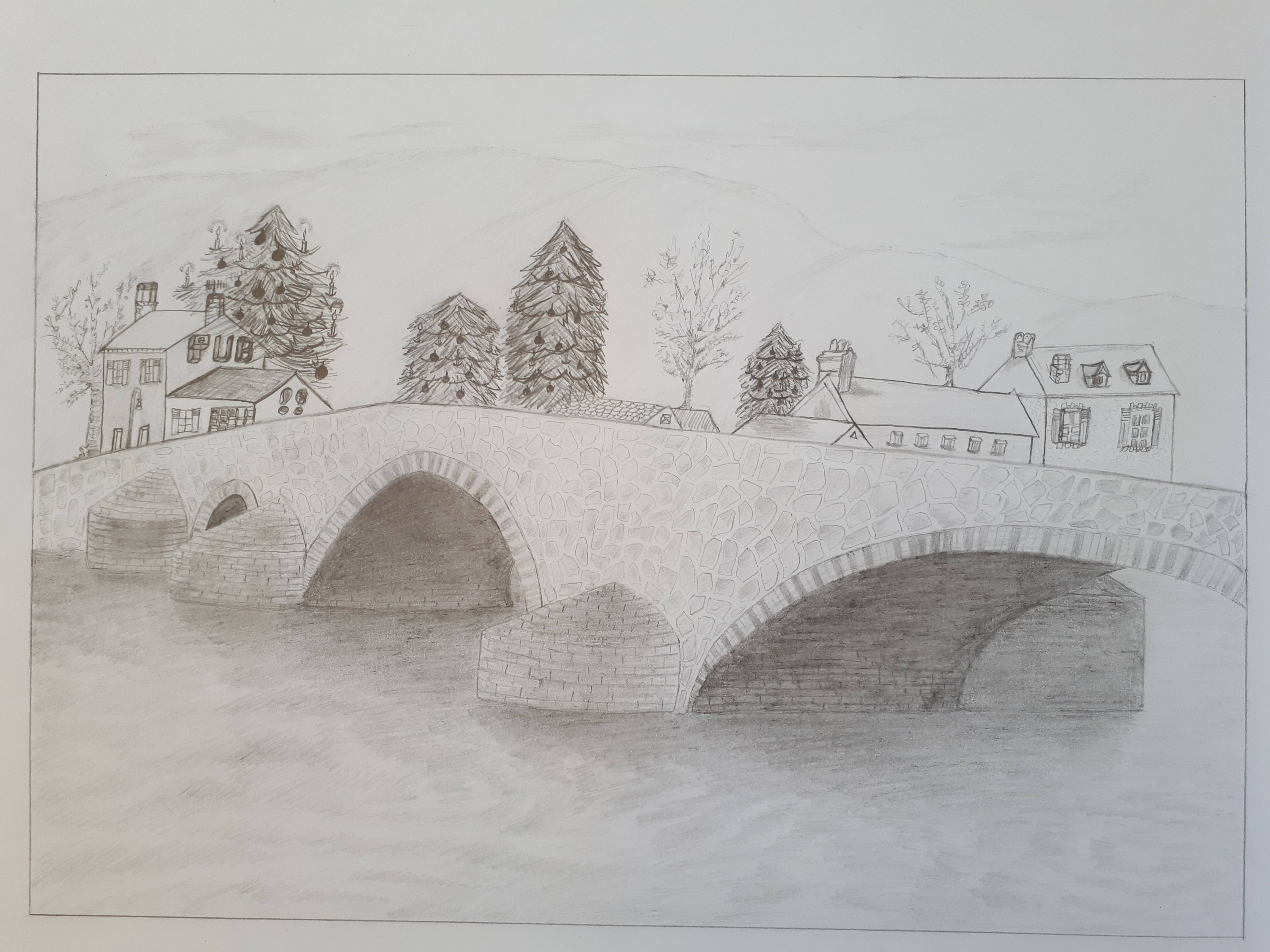 C'est vraiment pas mal ! Mais tu es allé dans le détail avant de corriger ta construction et perspective, c'est dommage ! Une chose un peu étrange égalemen tdans ton dessin, c'est qu'on à l'impression que tes maisons sont posées sur le pont. Alors qu'on doit peut-être pouvoir voir la berge pour que ce soit moins étrange.