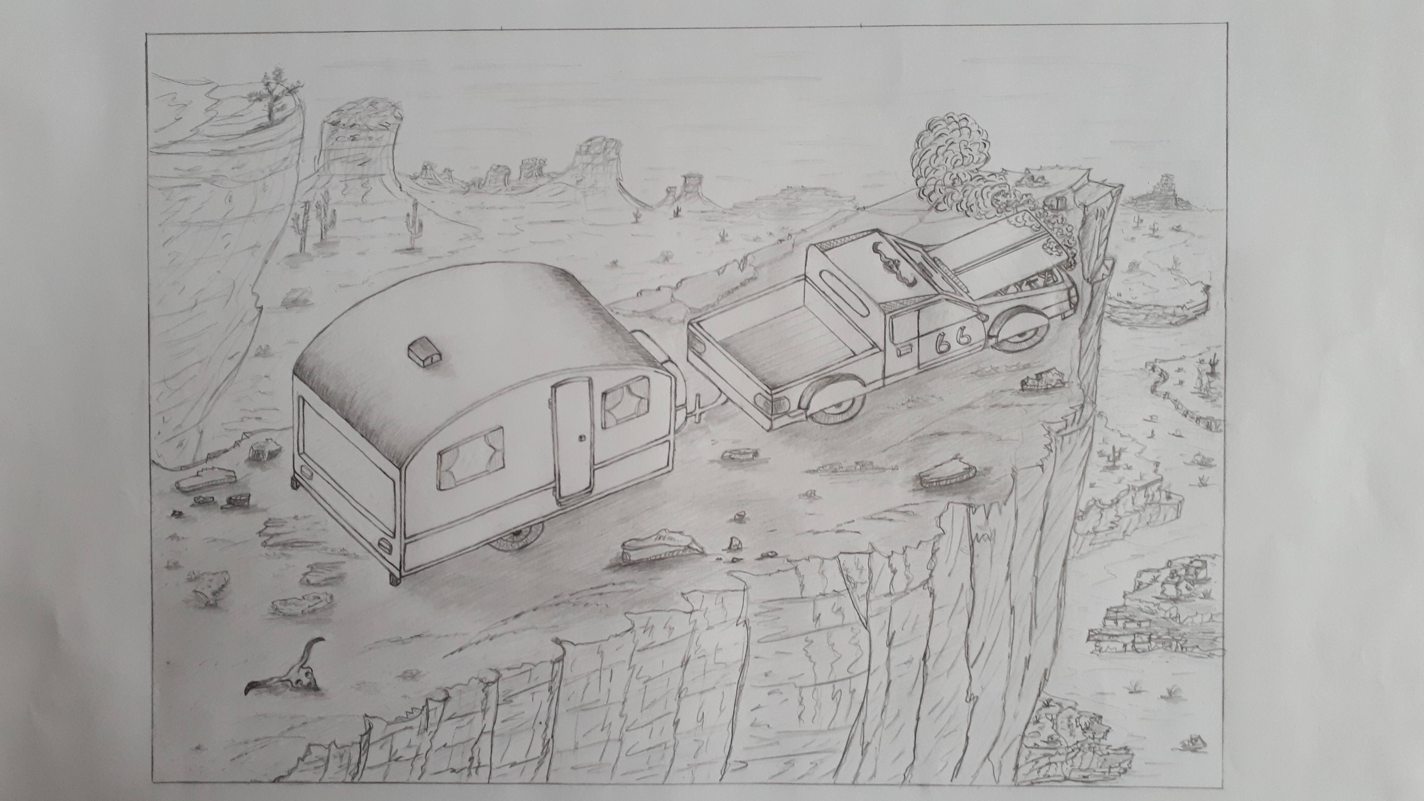 Ton dessin est vraiment top ! Ta caravane et ta voiture sont très propres ! En revanche, ta composition est vraiment très centrée. C'est sommage, car ta première proposition était plus aérée je trouve. Pour ce qu est de la perspective, vraiment pense à bien construire ton image avant d'aller dans le détail. Plus tes "montagnes" sont proches de l'horizon, moins on doit voir le dessus. Même rincipe pour les petits monticules au sol. Plus ils s'éloignent de la ligne d'horizon, plus ils sont vus de dessus.