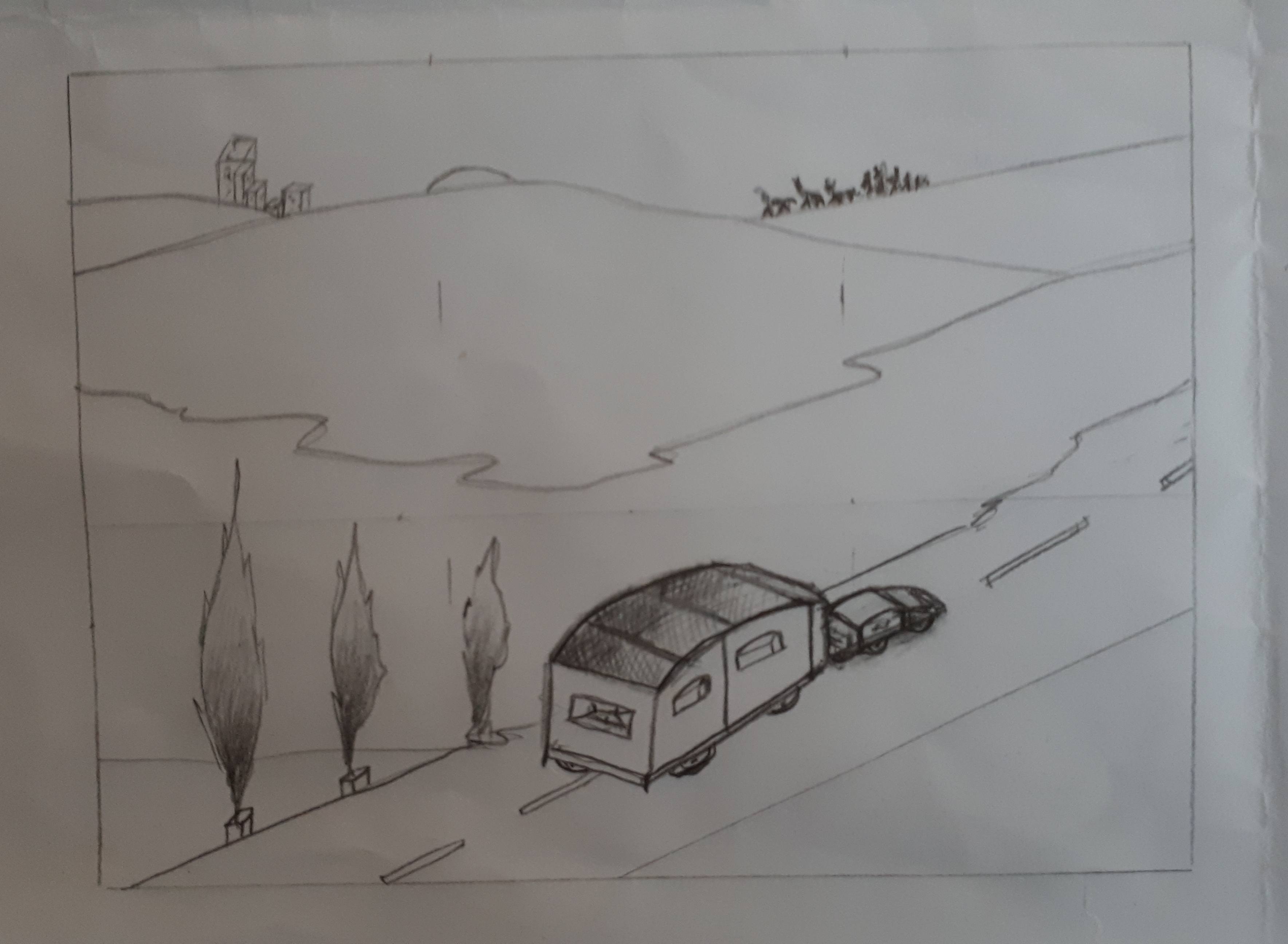 Ihre Zeichnung ist wirklich toll! Ihr Wohnwagen und Ihr Auto sind sehr sauber! hingegen ist Ihre Komposition wirklich sehr zentriert. Dies ist ein Beispiel, denn Ihr erster Vorschlag war mehr luftiger, denke ich. Für die Aussicht denkt wirklich daran, Ihr Image schon lange zu erstellen, bevor sie ins Detail gehen. Je mehr Ihre "Berge" nahe am Horizont liegen, desto weniger müssen Sie die Oberhand sehen. sogar auf kleine Hügel am Boden rinzip. Je mehr sie sich von der Horizontlinie entfernen, desto mehr werden sie oben gesehen.