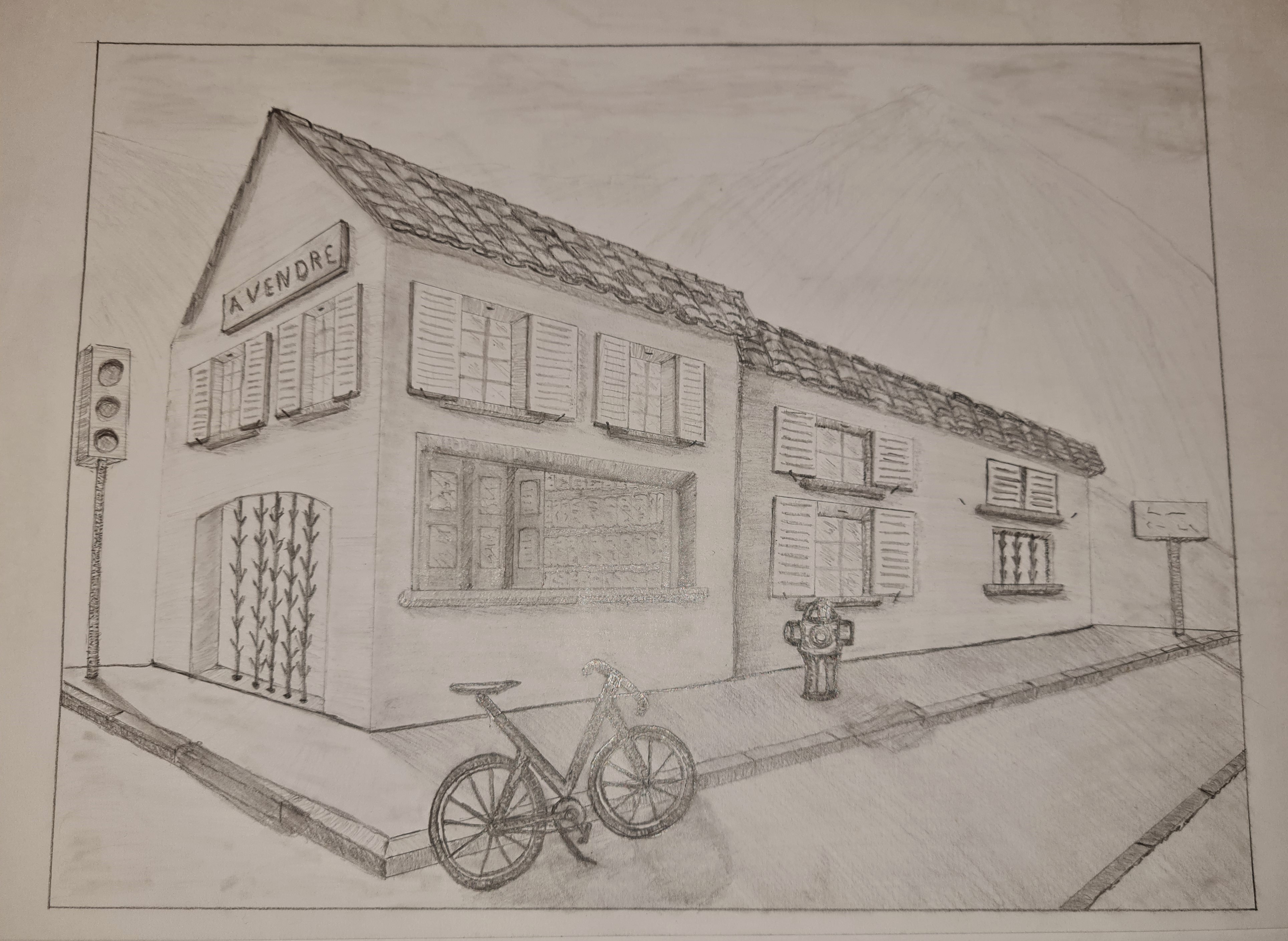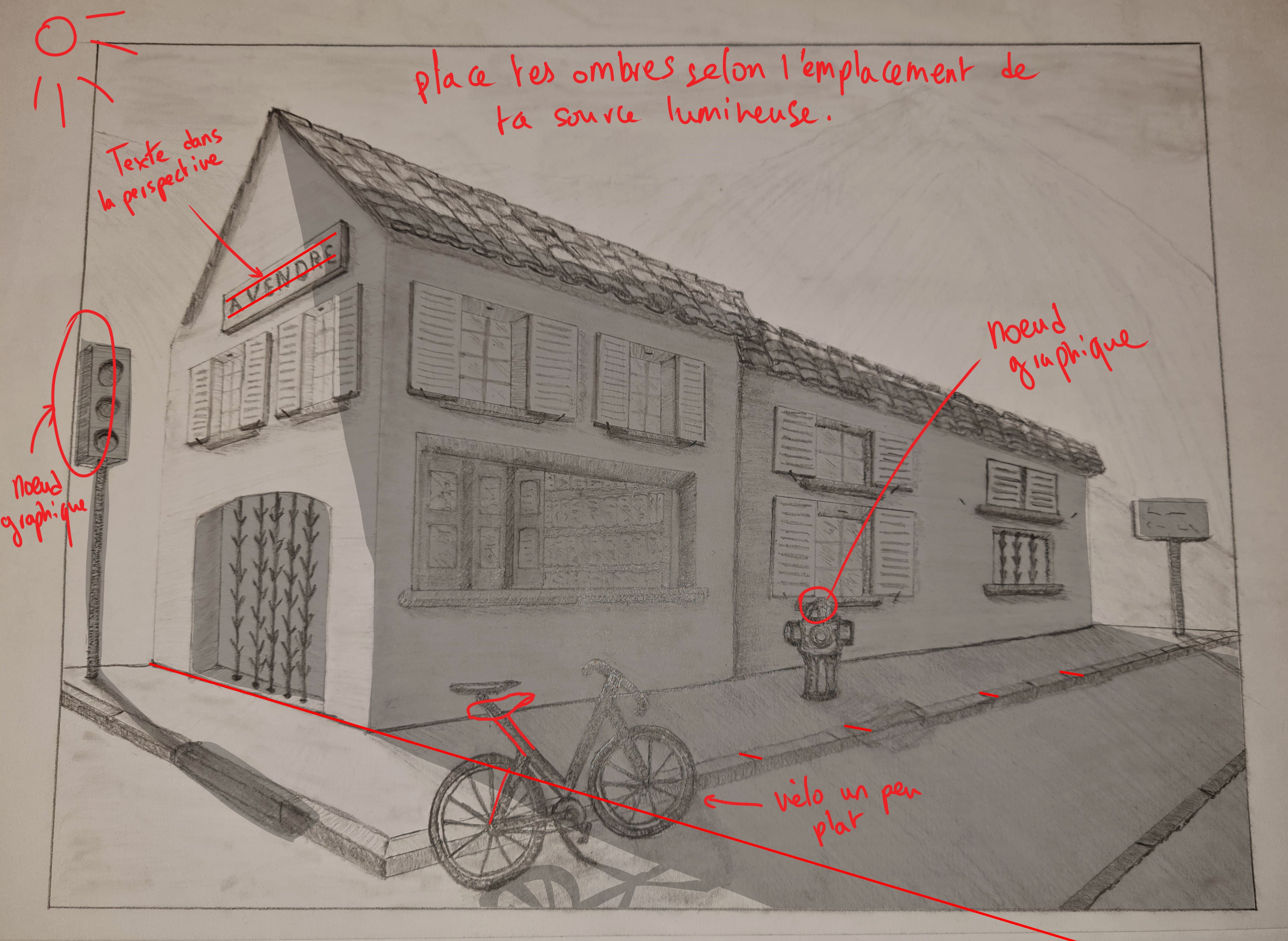 Quelques petits oublis de perspective également, tout doit entrer dans tes deux points de fuite (texte de devanture, pierres du trottoir...)