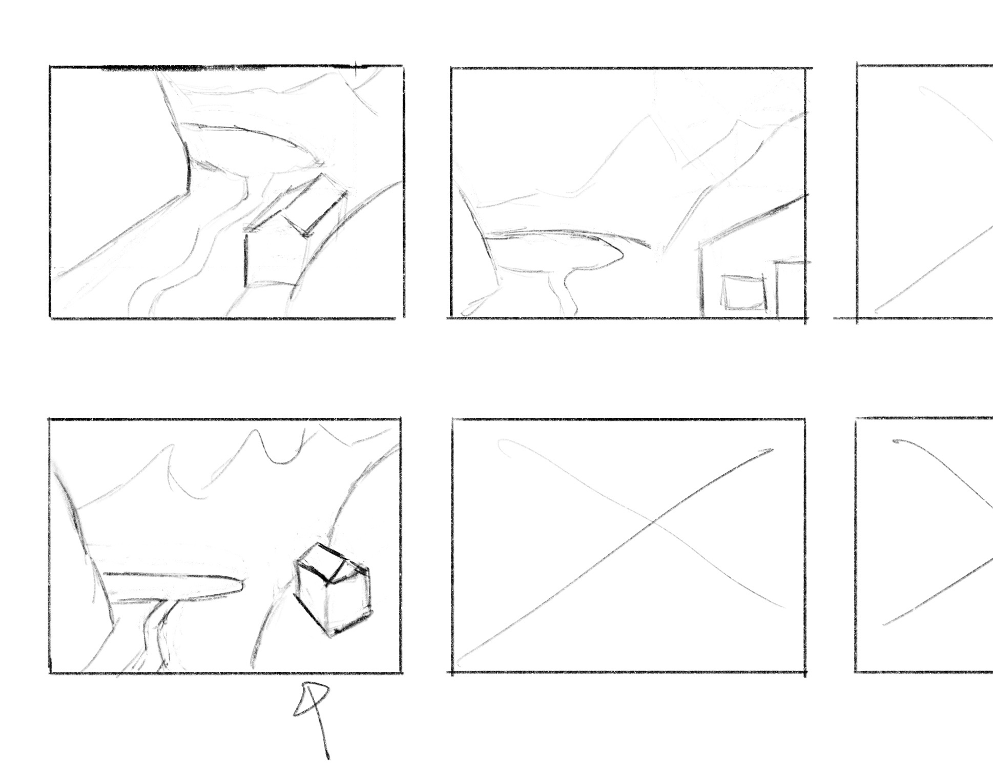 Je teste l'exercice récapitulatif. Voici 3 pochades où j'ai voulu représenter une cabane de montagne avec vue sur un lac. J'avais prévu d'en faire 6, mais à la 3ème (celle avec la flèche) j'ai eu la sensation d'avoir trouvé comment je voulais représenter ce paysage. je sais que les pointes des montagnes au fond sont trop proches du cadre de l'image, sur l'illustration finale elles seront plus basses. Pourriez-vous me dire s'il y a d'autres éléments qui ne vont pas bien dans cette composition s'il vous plaît ? Merci beaucoup d'avance ! 😊