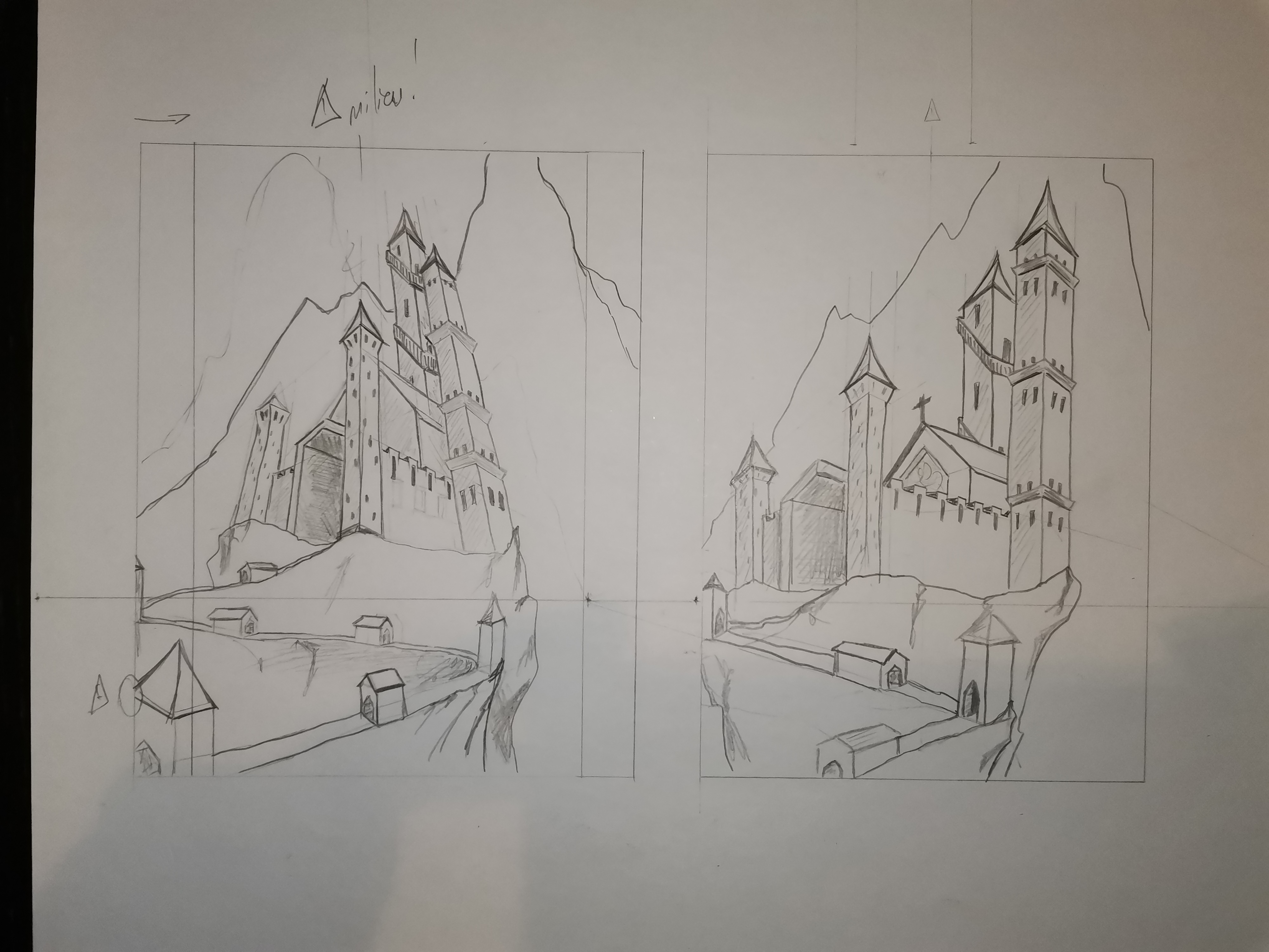 Voilà mes recherches jusqu'aux pochades. Le château est inspiré de Neuschwanstein et le rocher d'un château en ruine dans le nord de l'écosse.