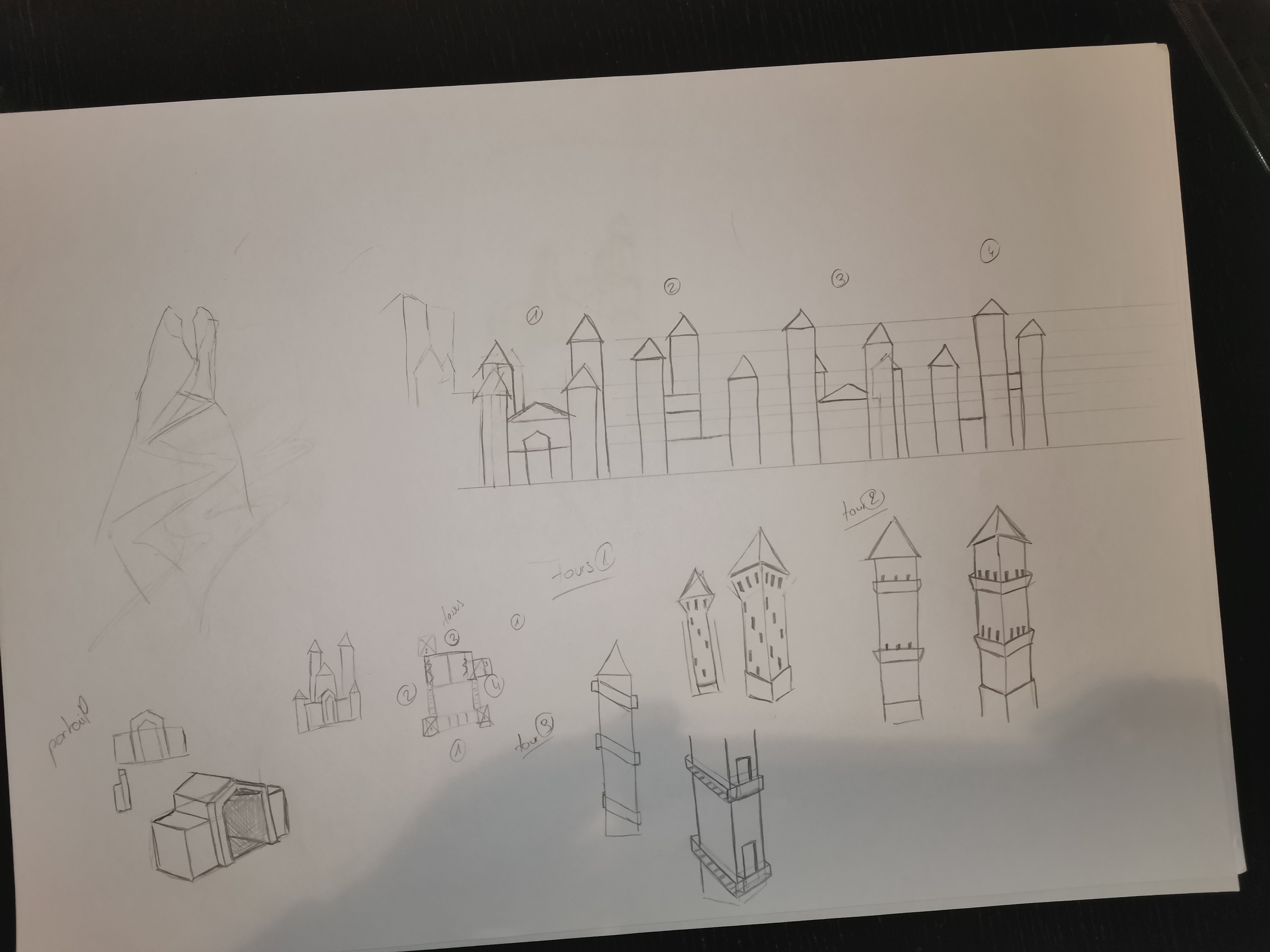 Touts tes bâtiments doivent être dans cette perspective pour une cohérence dans ton dessin. Donc même les petites maisons/tours que tu as dessinées sur la muraille.