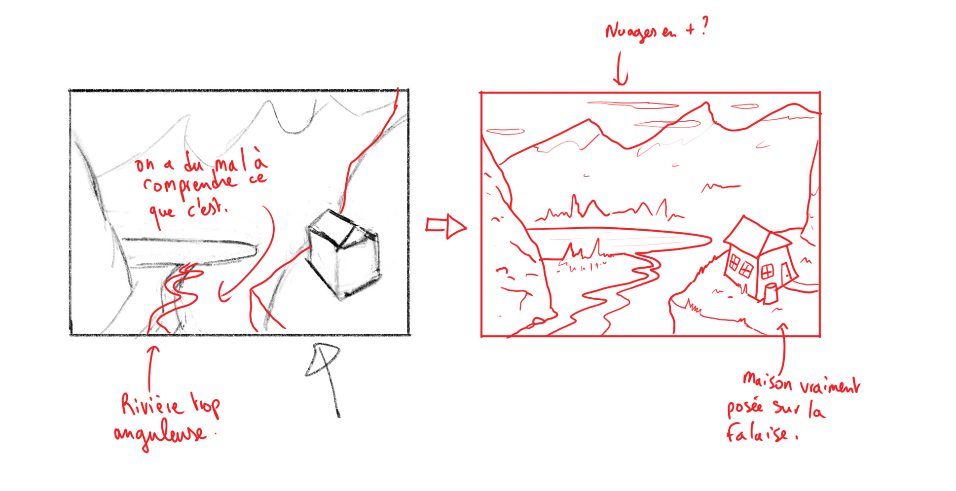 Bonjour NonowX3, Effectivement ta composition m'a l'air très intéressante. Mais n'hesites pas à en faire d'autres, car même si on en trouve une super bien, c'est toujours un bon exercice de continuer à réfléchir sur d'autres angles de vue. Voici mes corrections dessinées, bon là comme tu le vois je me sis amusée à mettre pas mal de détails, car ta compo était déjà très lisible et compréhensible.