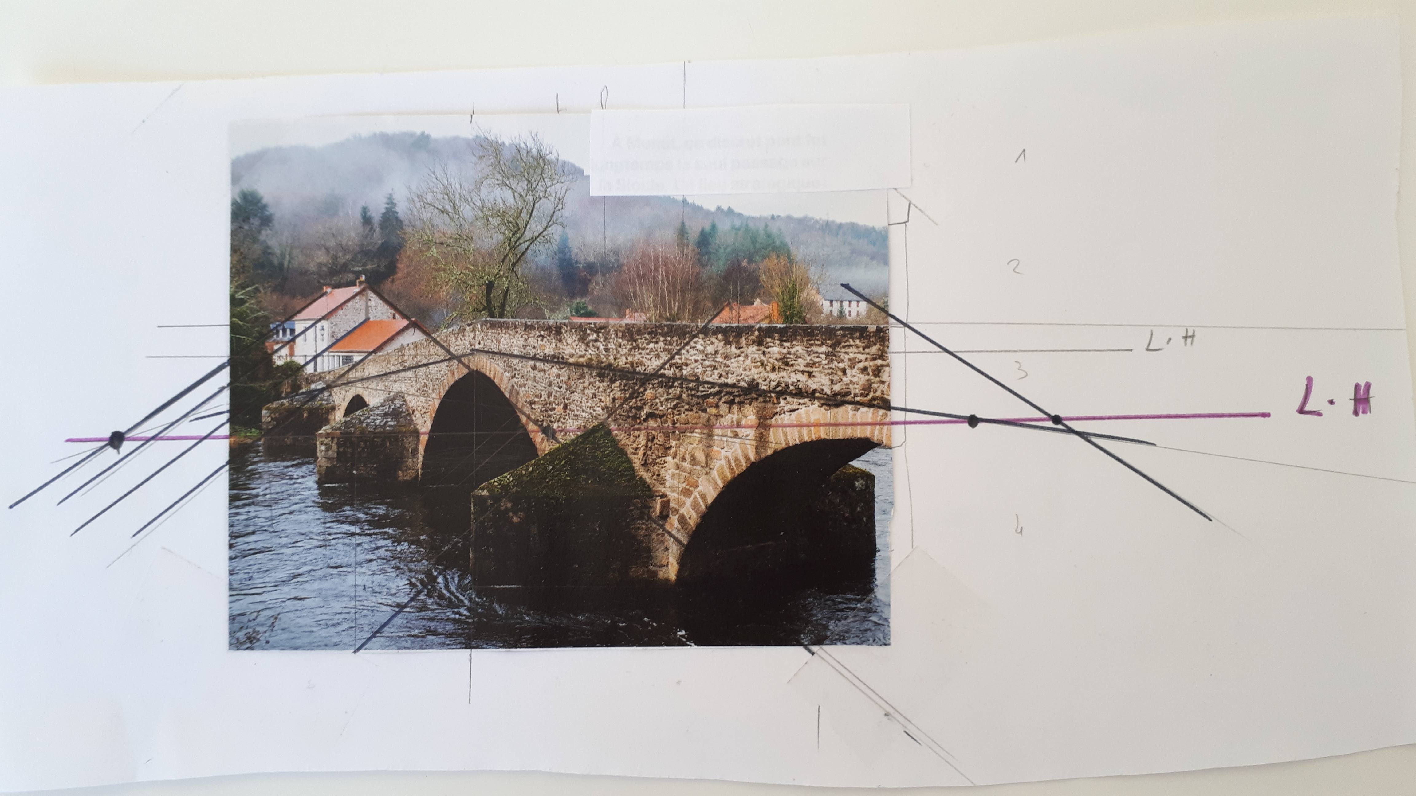 Ne te perd pas trop à faire trop de lignes partout. Les lignes d'horizon, et principales suffisent (les lignes des toits, du pont)