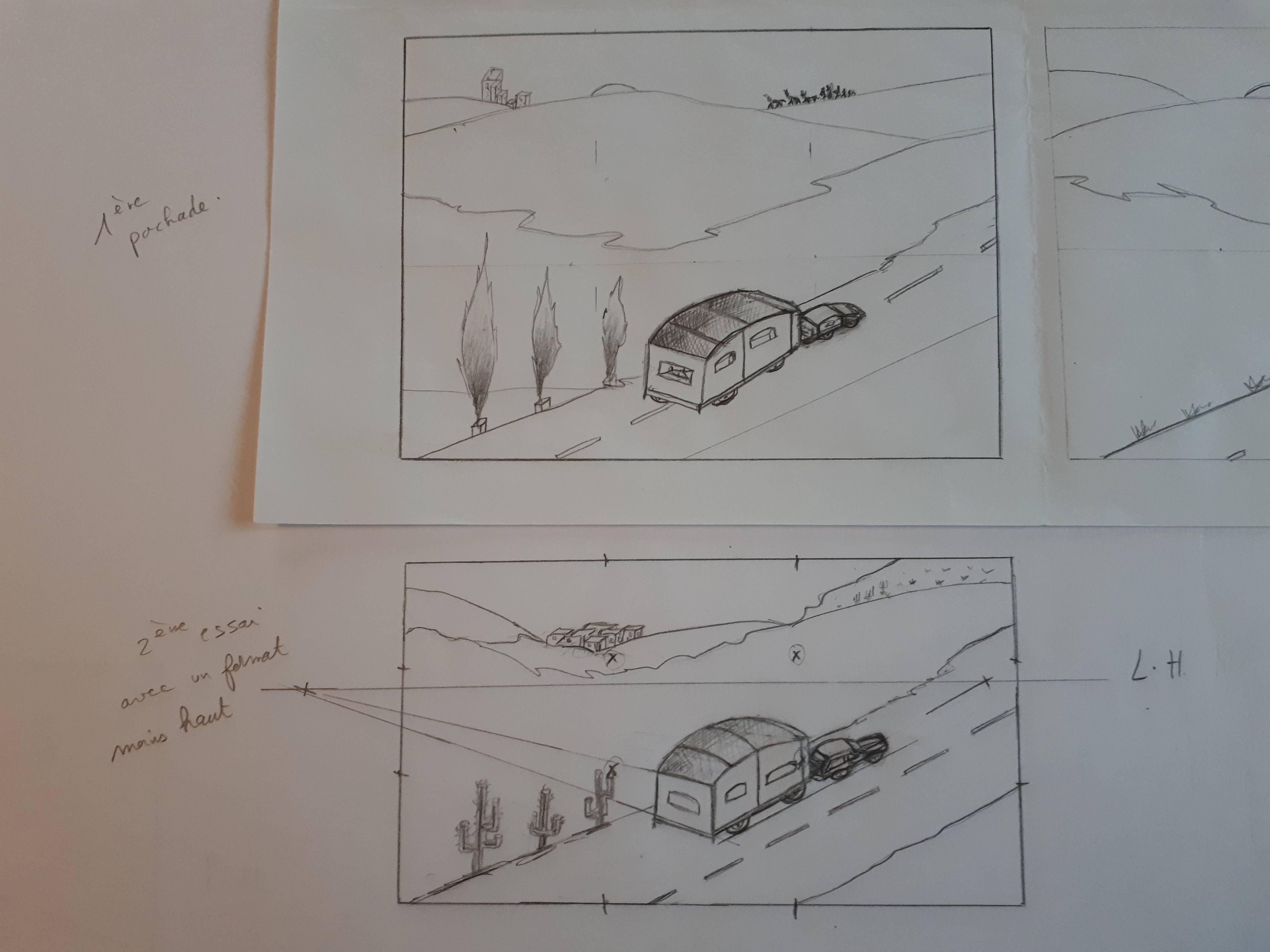 Bonjour Nanoue ! Oui en effet, la deuxième pochade est plus agréable au regard ! Par contre, ta perspective n'est pas bonne, puisque si on regarde la route de dessus, c'est compliqué de voir le paysage de face ! J'ai refait ton dessin en plaçant d'abord la ligne d'horizon, les points de fuite, et en reliant ma construction à ceux-ci. Voici ce que ça donne. J'espère que ça t'aidera ! :)