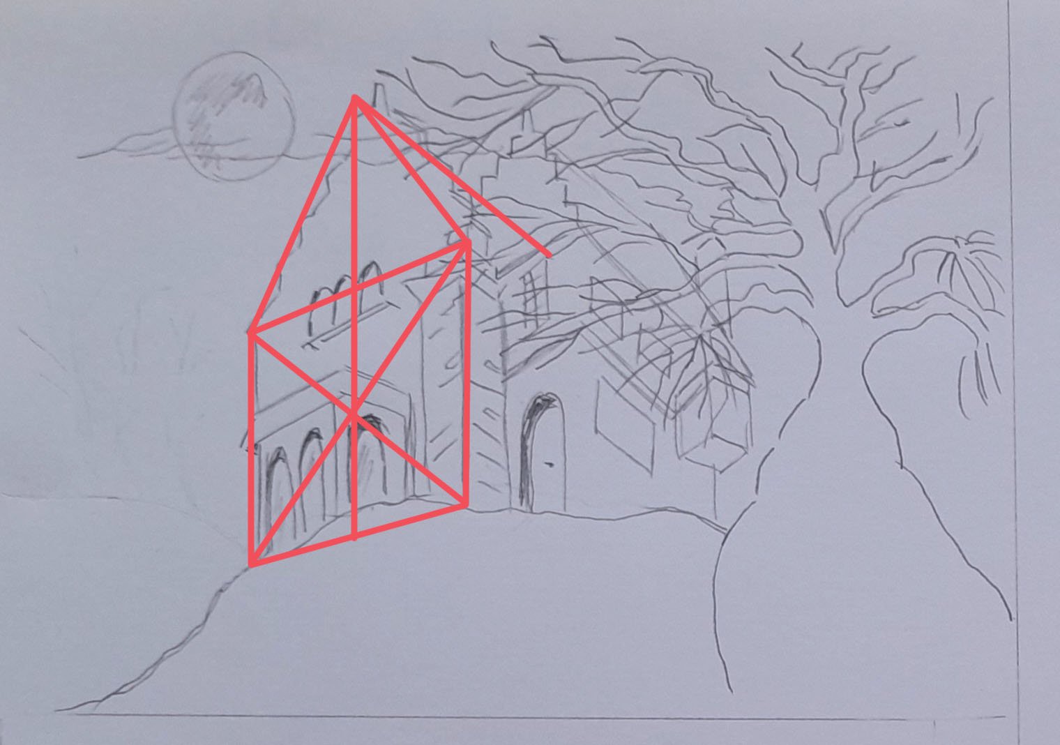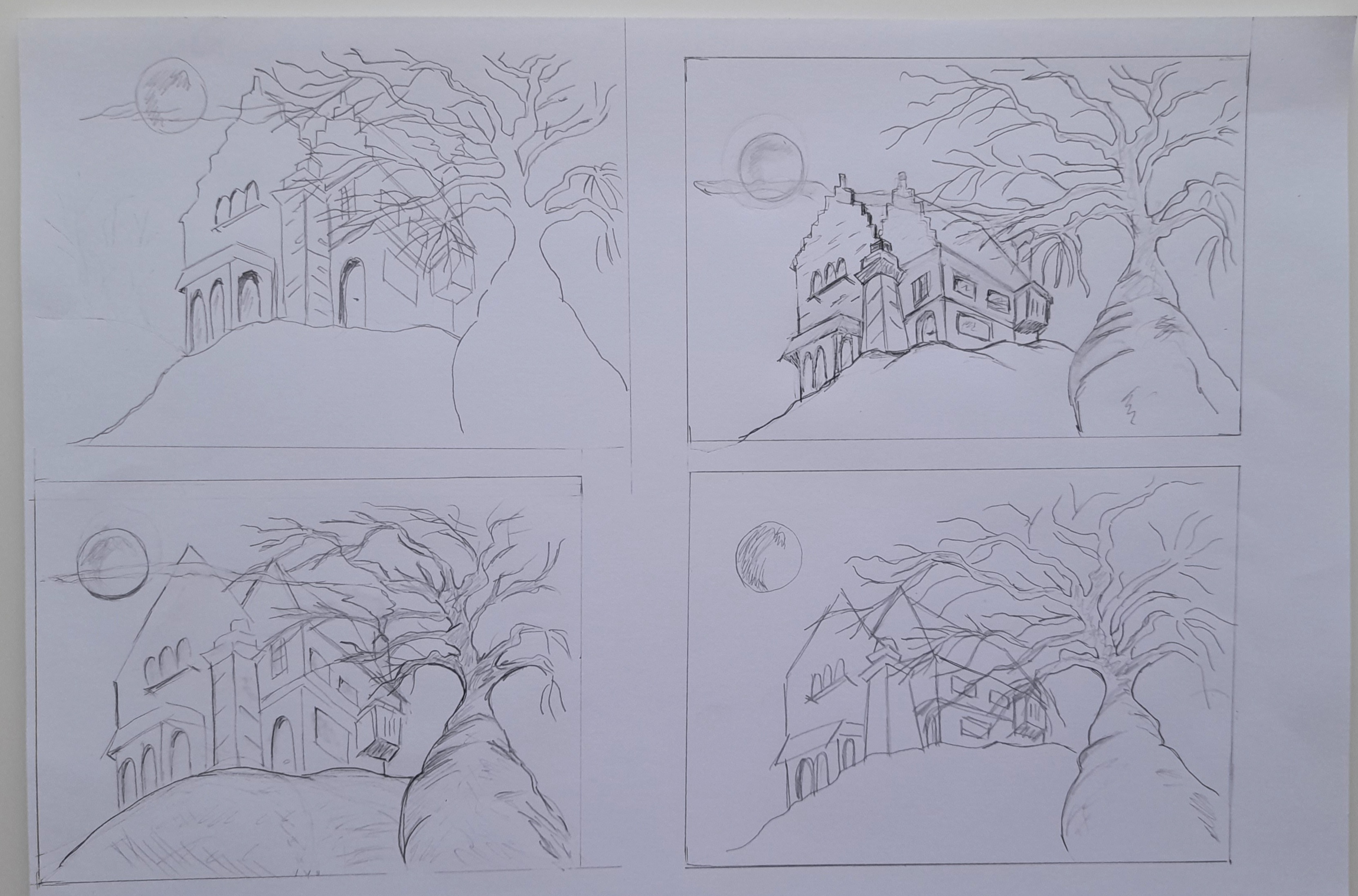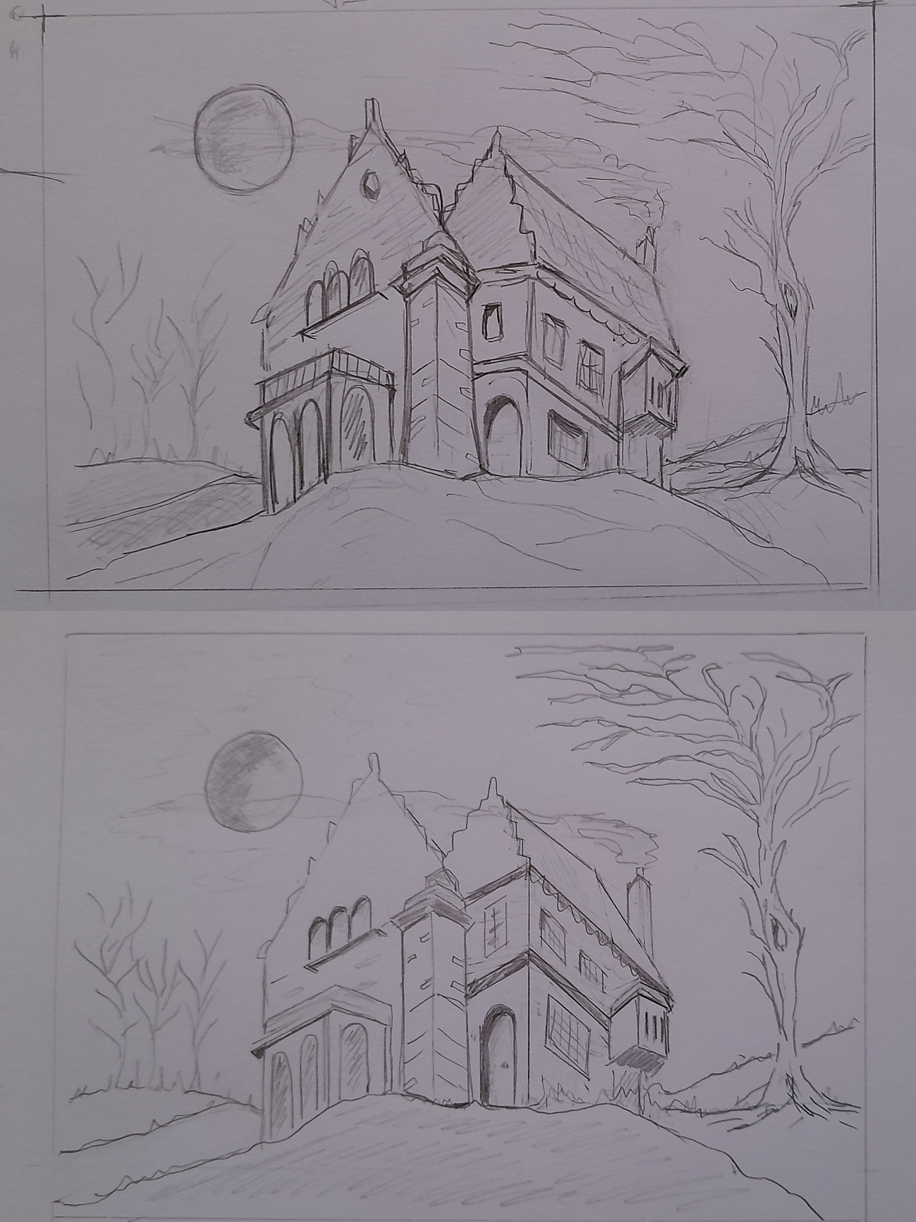 Manoir lugubre avec pleine lune , ombre et lumière .. 2eme pochade finale rectifié , meilleure perspective ? Merci du retour pour avancer ...