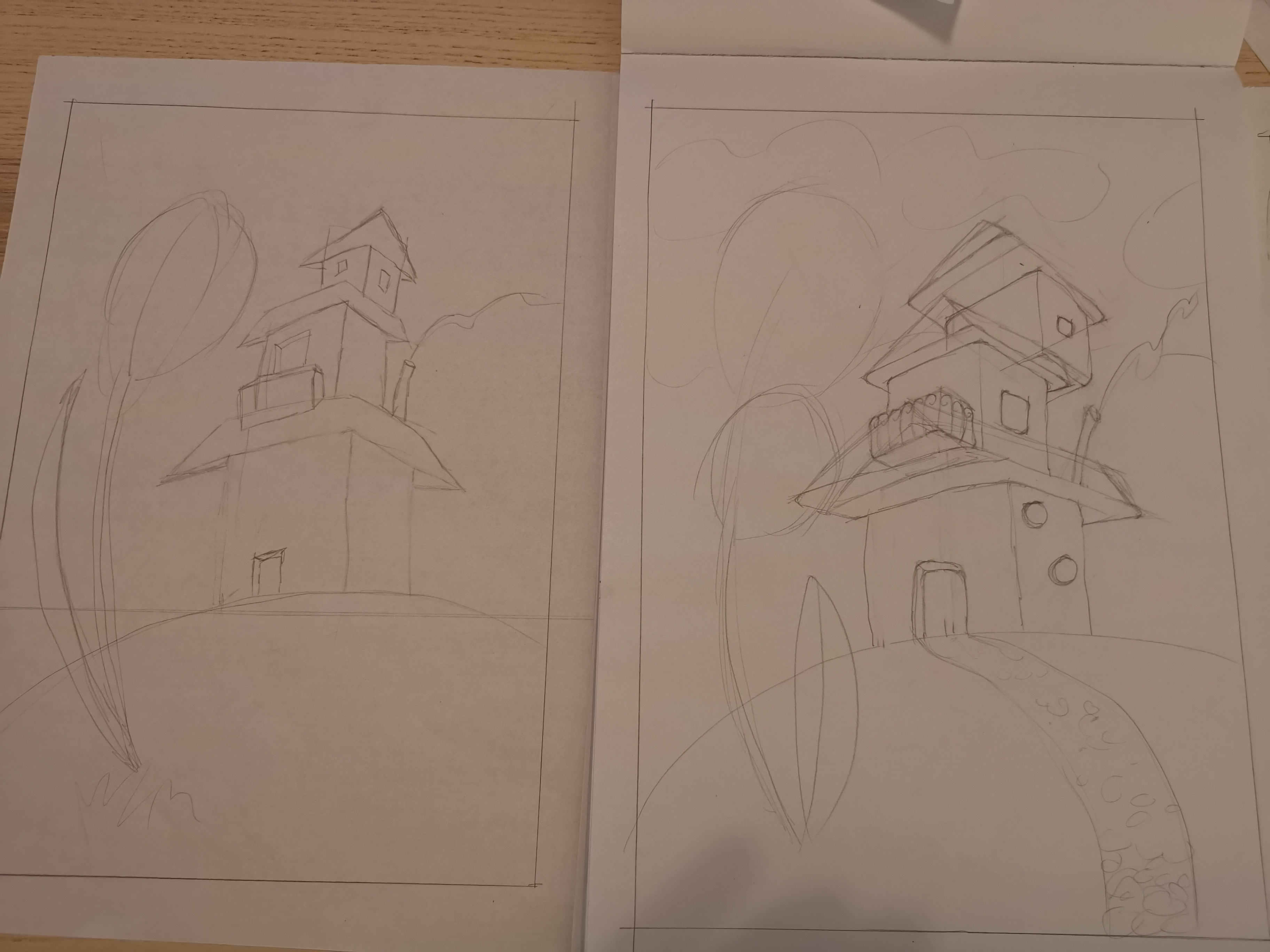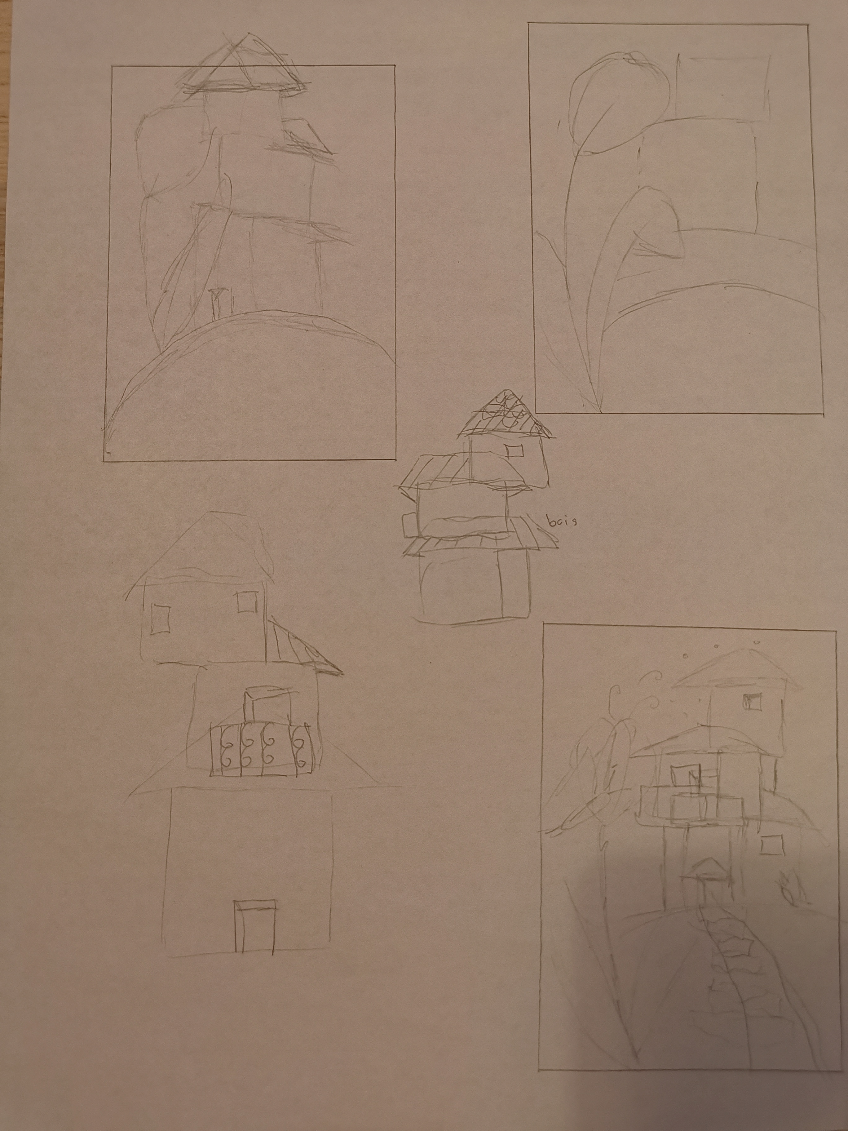 Bonjour Malynka, C'est super, tu as fait plusieurs recherches et propositions. Essaie de placer tes modules de maison en simplifiant tes volumes (des cubes) et de mettre le tout en perspective, puis ajoute les détails en dernier une fois que ta construction est juste^^
