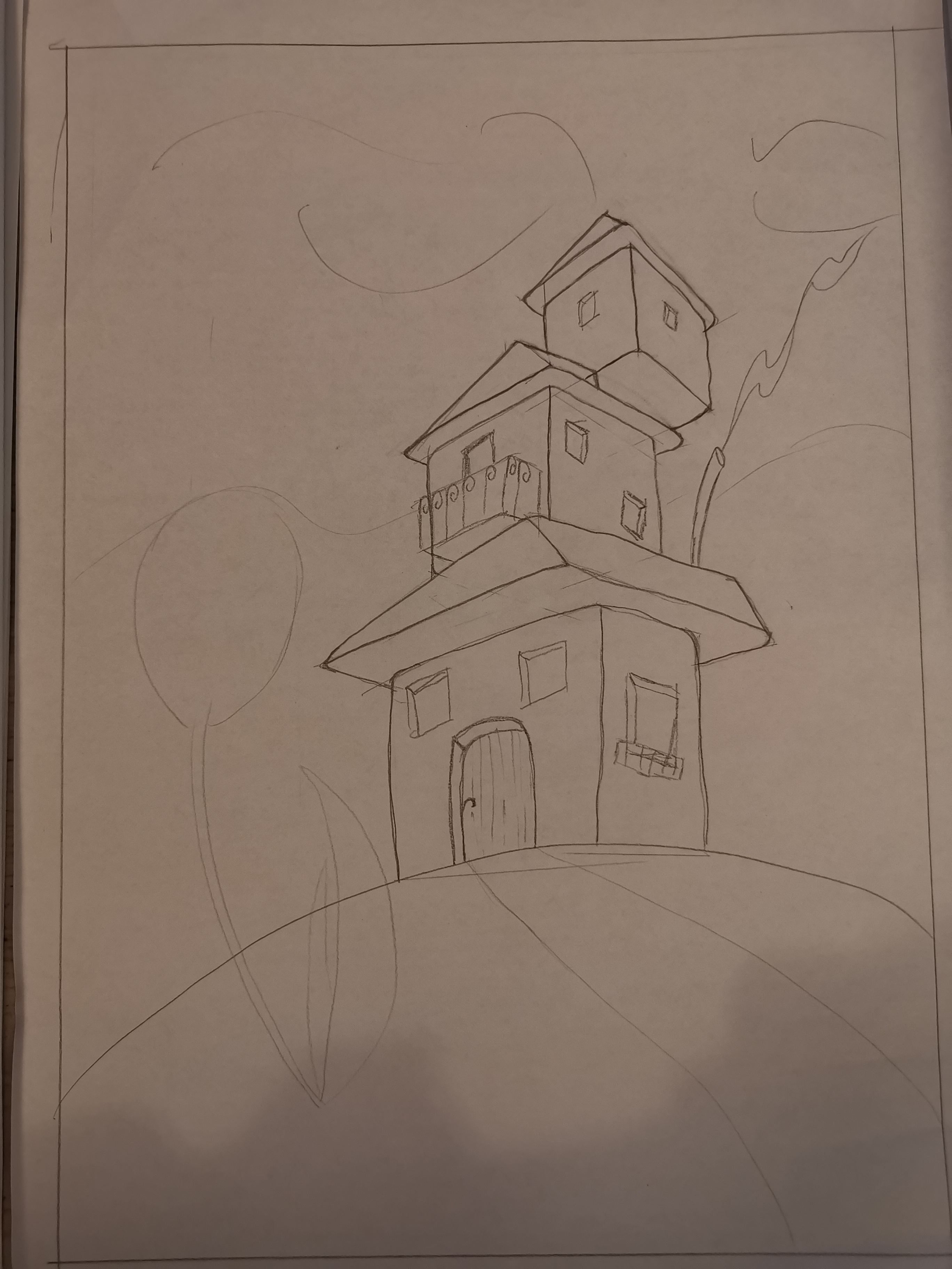 C'est vraiment pas mal pour le début ! Attention à bien placer ta ligne d'horizon, de mettre tes points de fuite et de mettre en place une perspective parfaite pour que ton bâtiment soit bien construit :) Essaie aussi de réfléchir à comment les diférentes parties se relient entre elles, que les modules ne soient pas juste posés "comme ça" les uns contre les autres. Ta composition est vraiment intéressante avec cette fleur en premier plan !