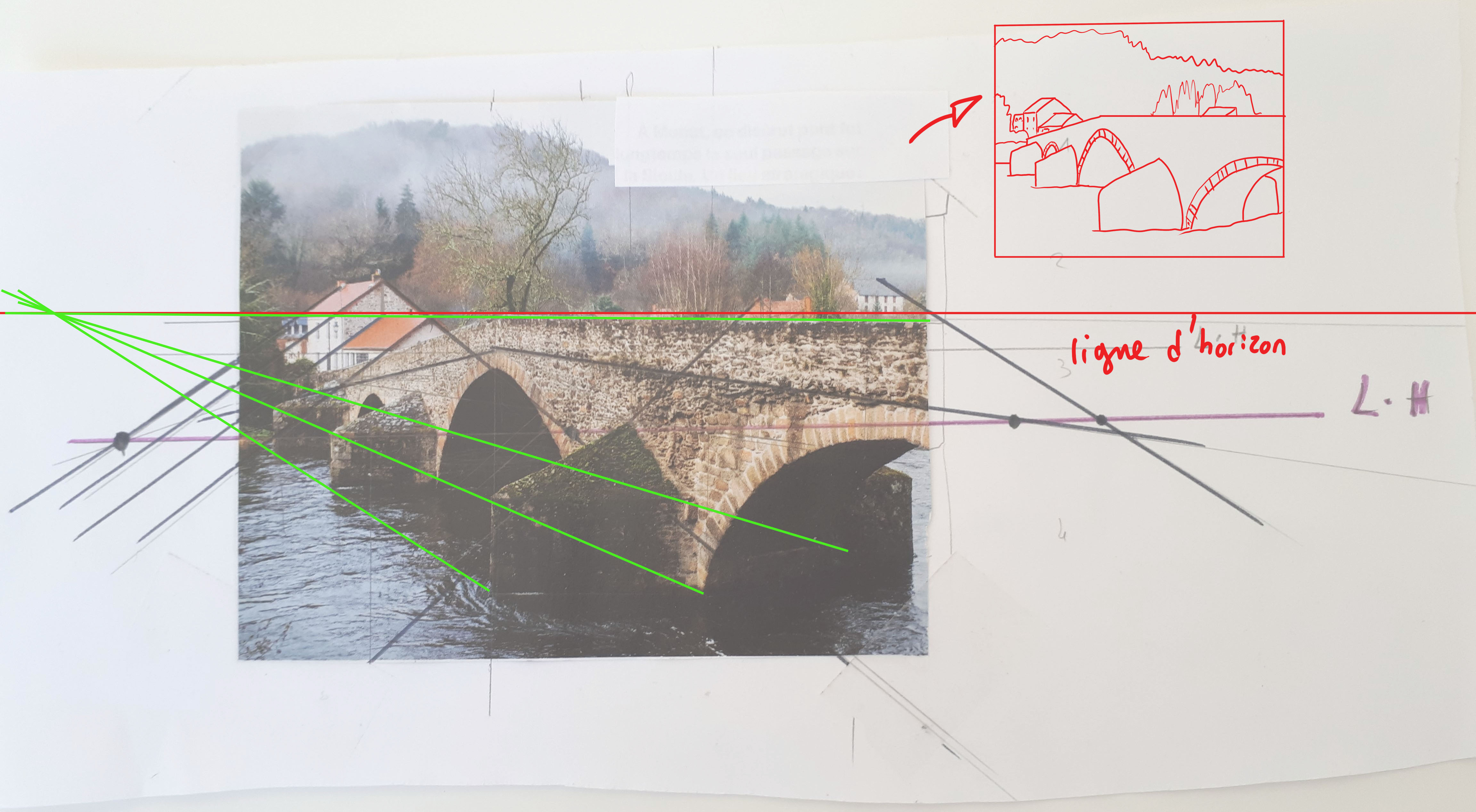 Bonjour Nanoue, voici ma correction dessinée. Ne te perd pas trop à faire trop de lignes partout. Les lignes d'horizon, et principales suffisent (les lignes des toits, du pont)