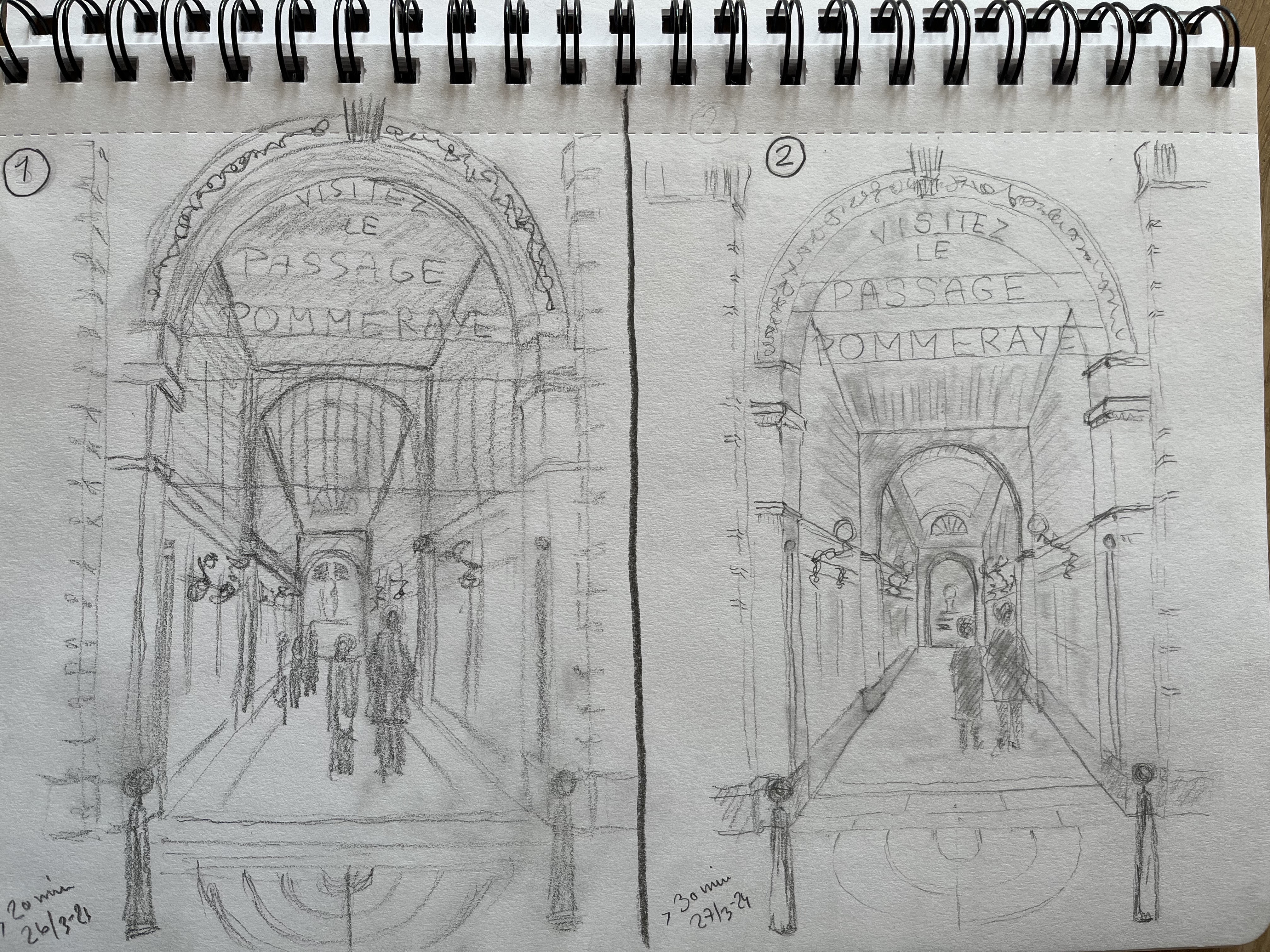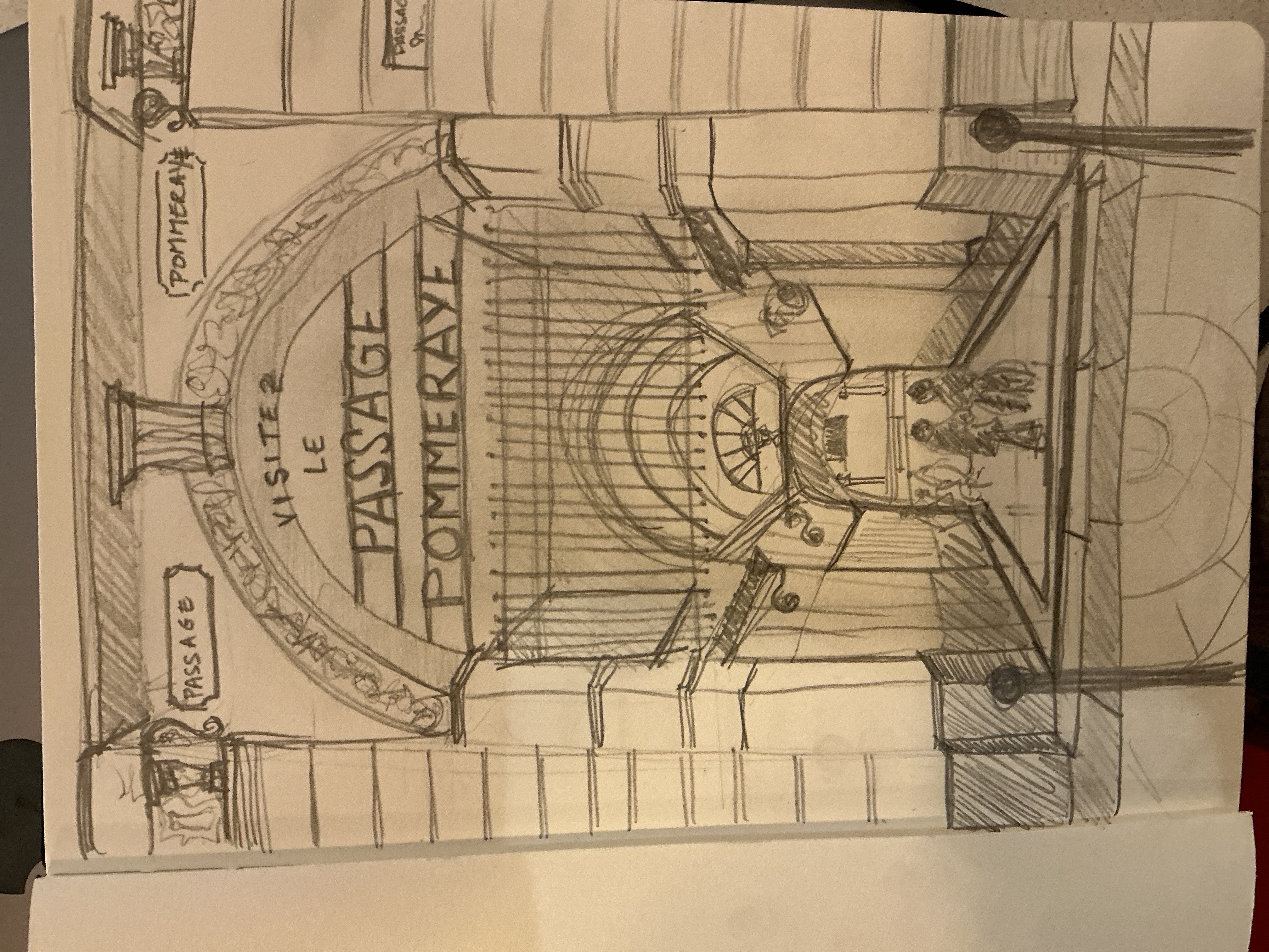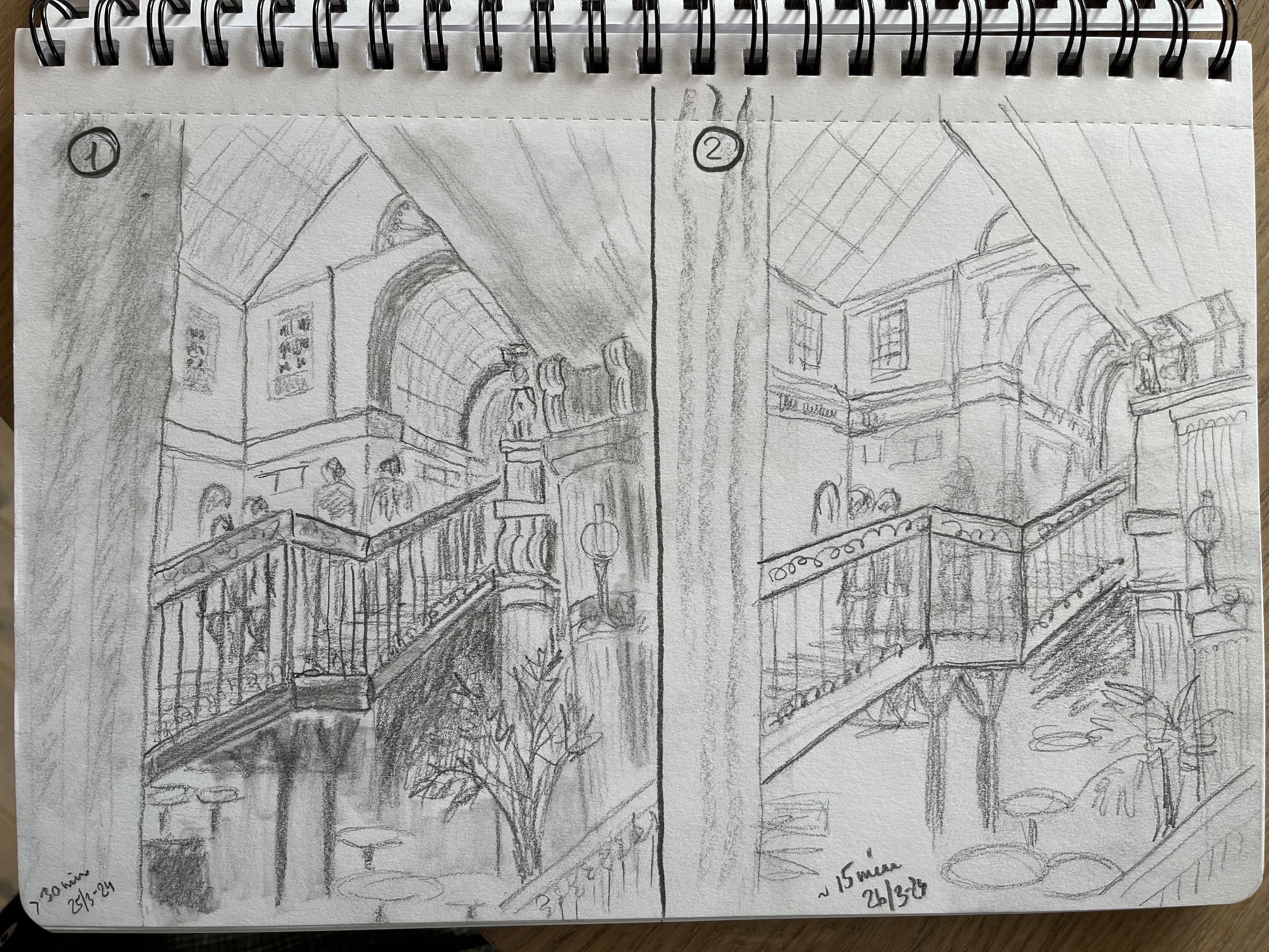 Voici med 2 esquisses du hall. Je trouve que c'est bien difficile de faire une esquisse en 10 min et choisir Les details nécessaires pour en même temps garder un bon souvenir du motif. Merci pour un feed-back :)