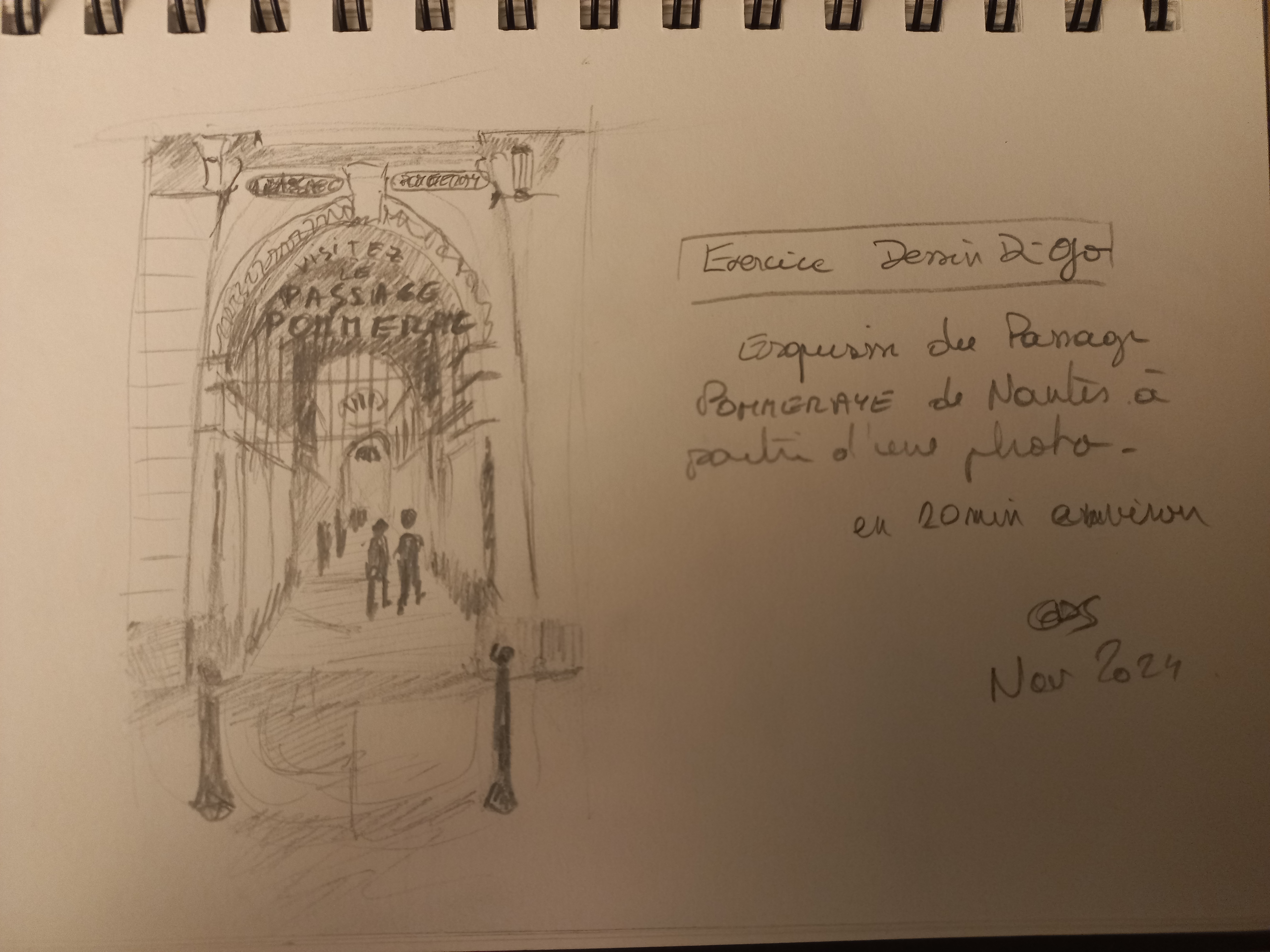 Merci pour ce partage ! L'esquisse est bien proportionnée et l'on a bien le sentiment de profondeur. Cest très bien pour 20min. A côté, si vous avez le temps, n'hésitez pas à prendre 1h ou 2h pour le refaire et comparer les résultats :)