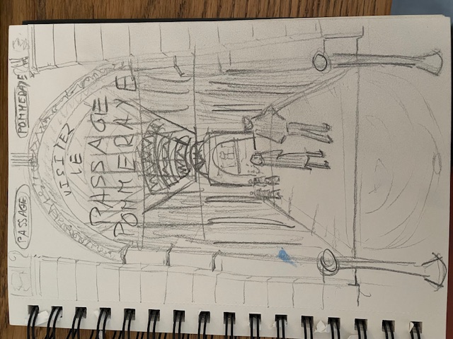 Je me suis un peu trompée sur les proportions. J'ai du mal à montrer la profondeur et la lumière au fond. Peut être aussi un crayon trop gras ?
