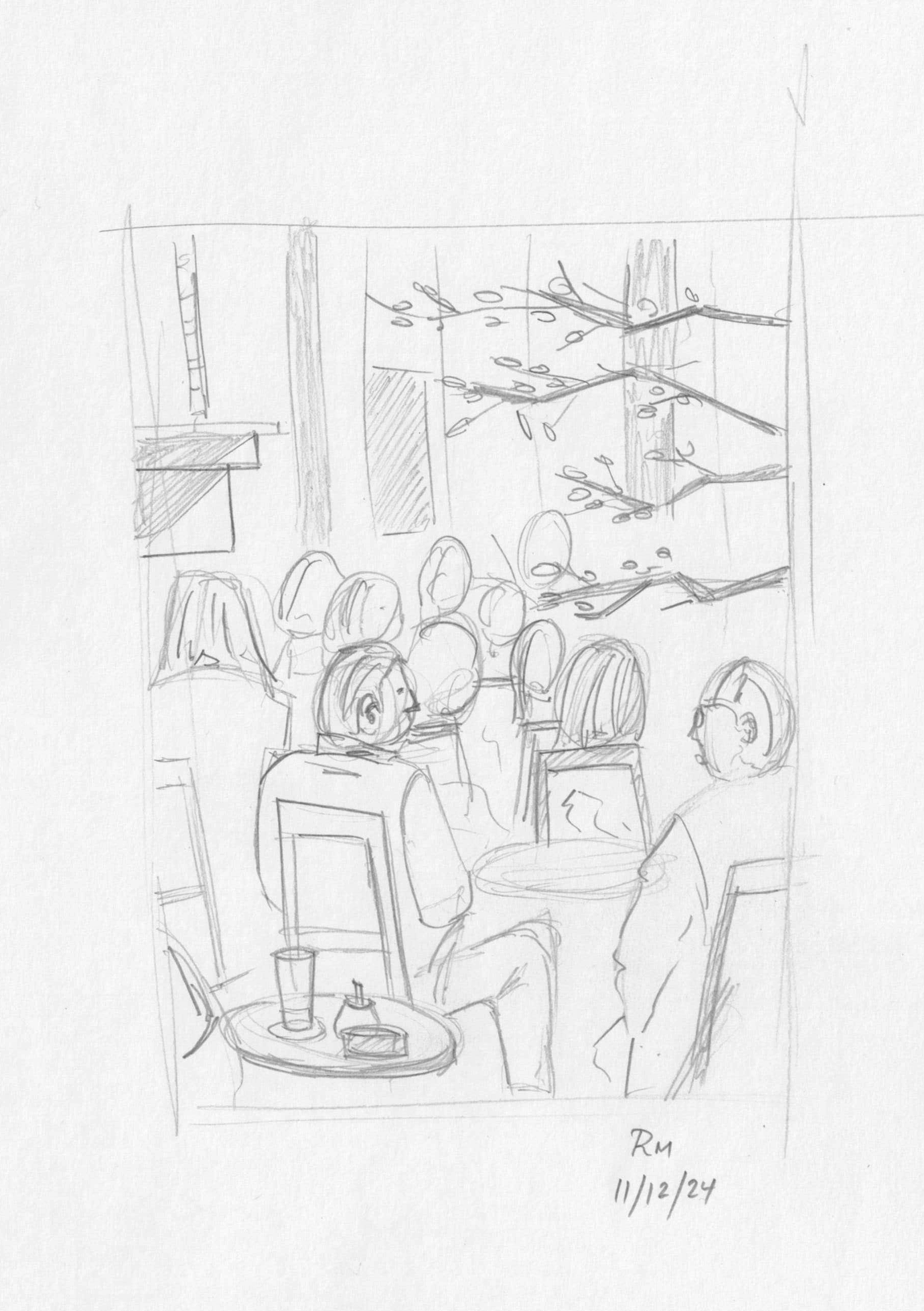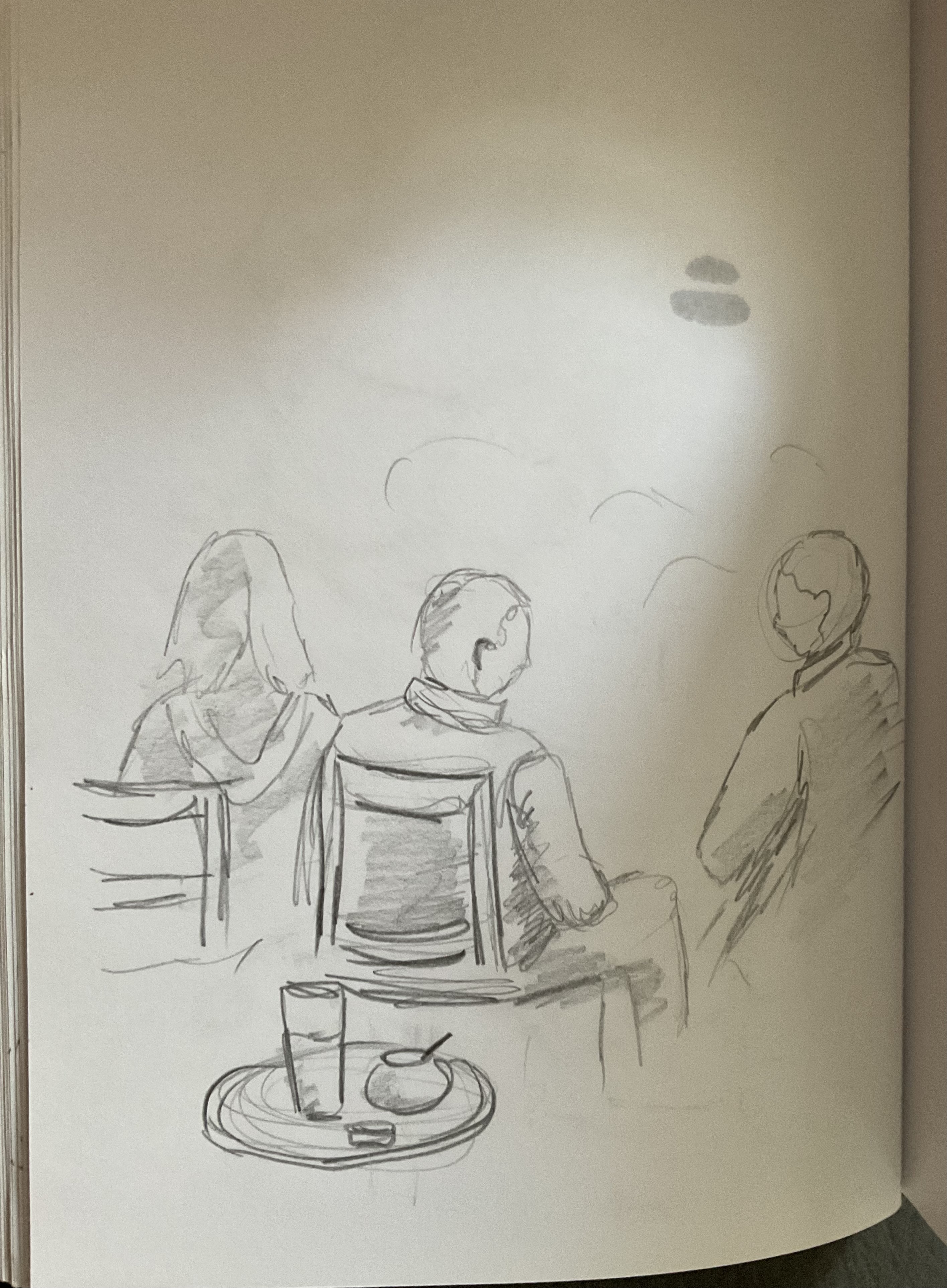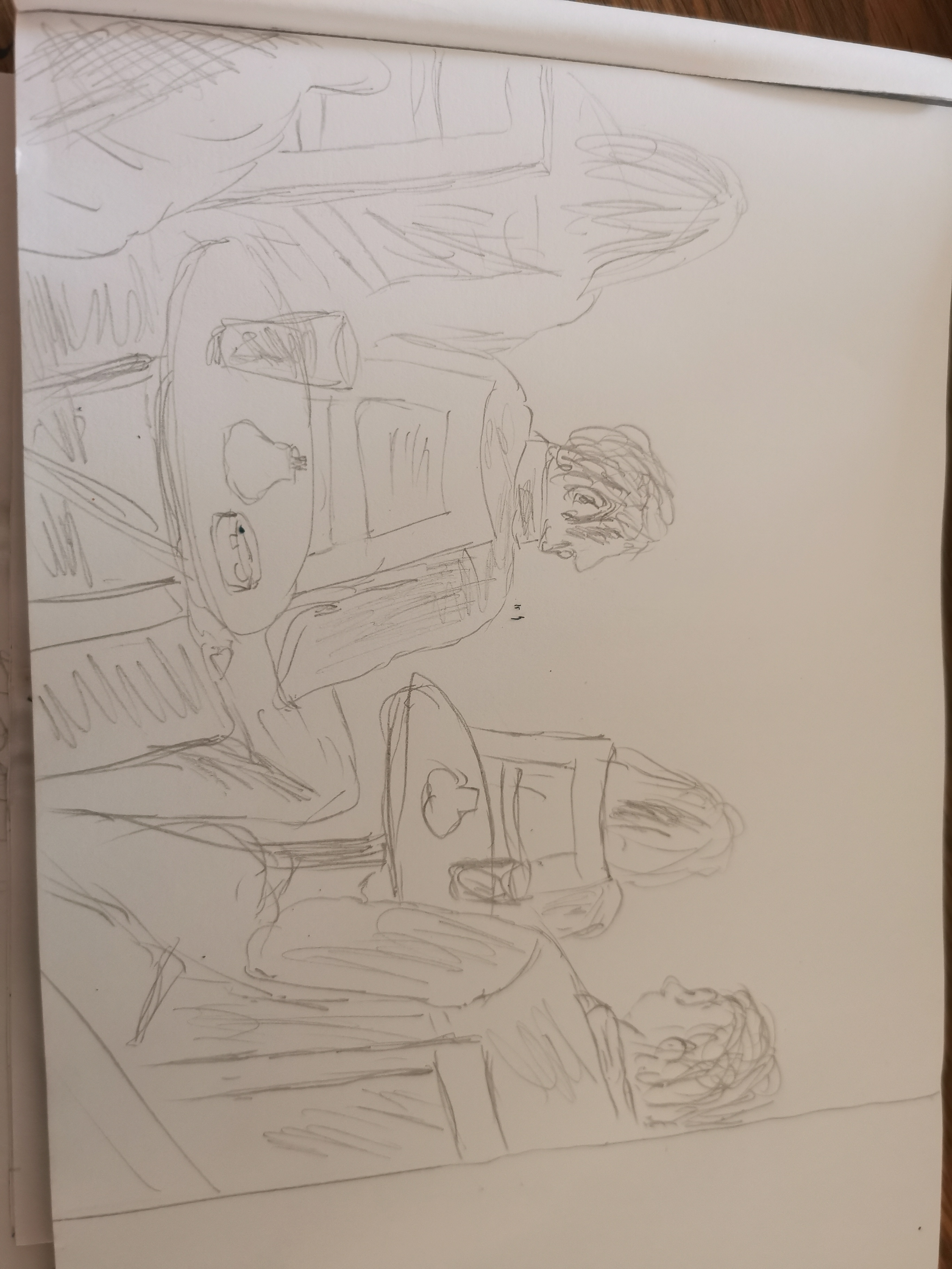 Ton premier croquis avec les ânes est plutôt réussit ! Mis à part peut être la tête de l'âne droit qui me semble un peu petite, mais c'est du détails :) Pour celui du bar, tu as bien réussit à capter les positions des personnes mais tu aurais pu aller un peu plus loin dans les détails, par exemple la table du premier plan à l'ai de flotter un peu dans le vide, ça aurait pu être intéressant aussi d'ajouter au moins la table devant les personnages pour créer du lien entre le premier plan et leur plan à eux :)