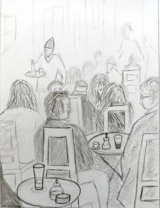 Ihre erste Skizze mit Eseln ist ziemlich erfolgreich! Abgesehen von dem Kopf des rechten Esels, der mir ein bisschen klein erscheint, aber es sind Details :) Für die der Bar haben Sie es geschafft, die Positionen der Menschen zu erfassen, aber Sie hätten ein wenig weiter in die Details gehen können, zum Beispiel die Tabelle des Vordergrunds, um ein wenig in der Leere zu schweben.