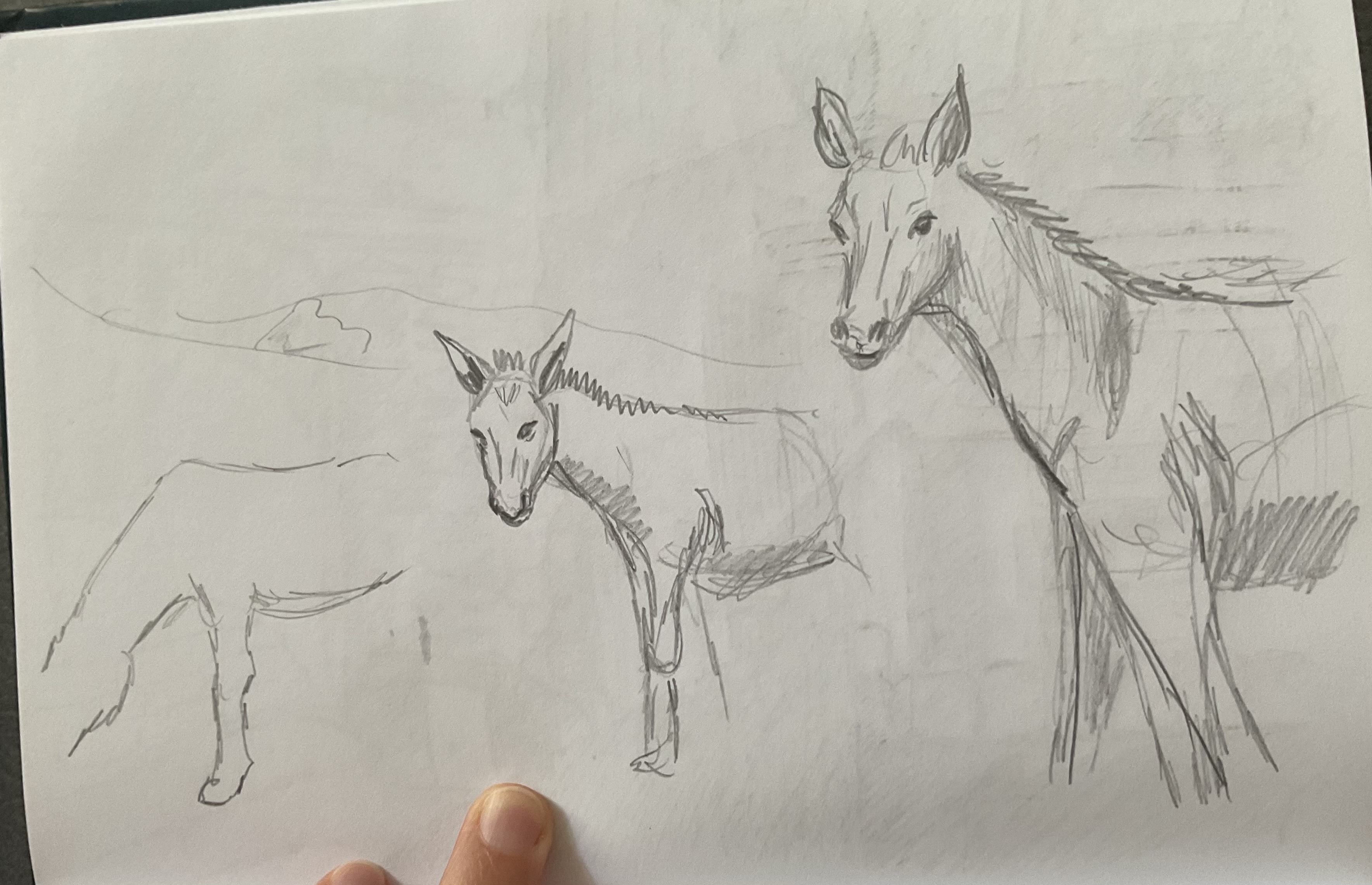 Bonjour, je vous envoie les 2 derniers dessins : les ânes et la terrasse.