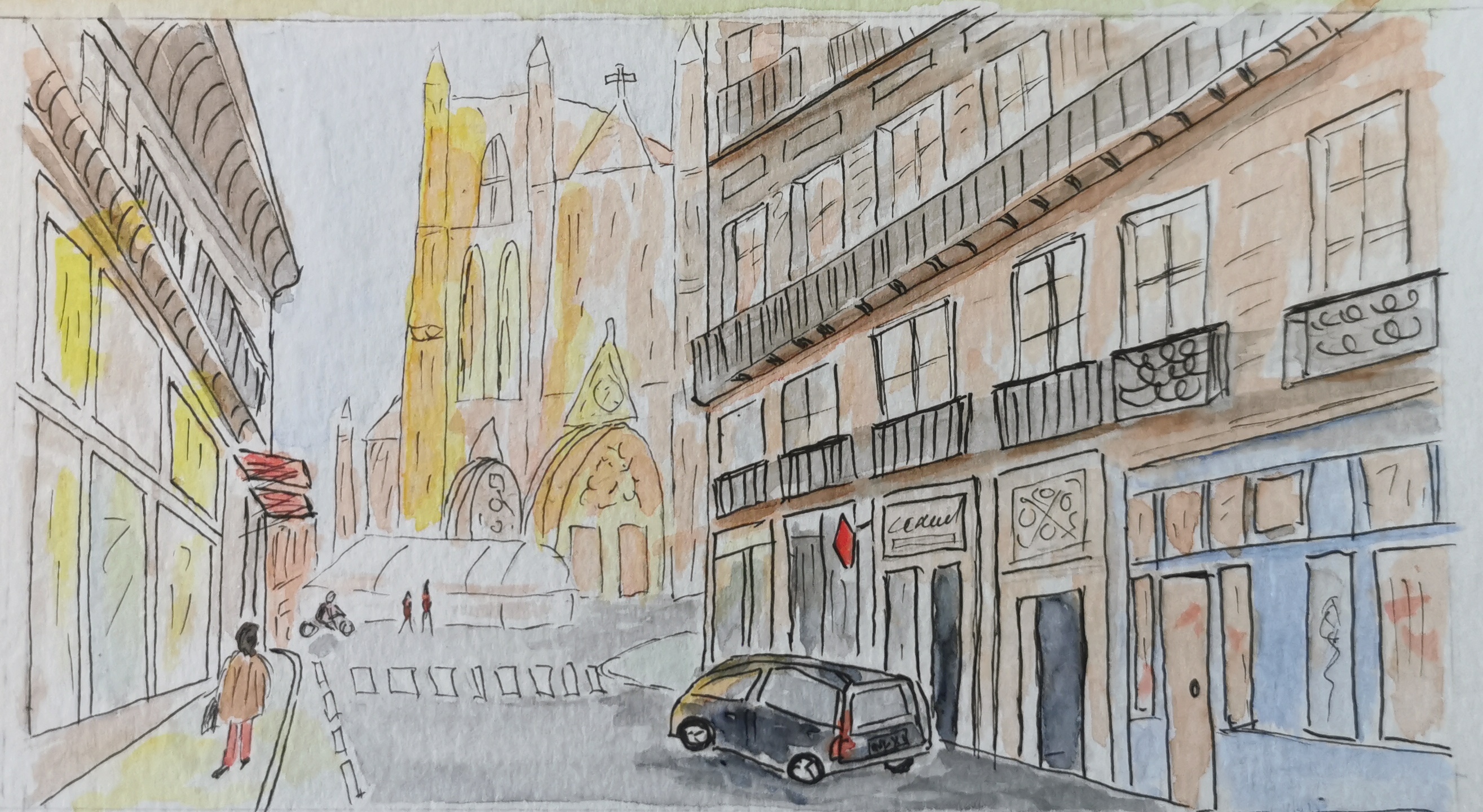 Hier ist die Rue de Nantes. Ich habe viel Zeit dort verbracht und merke, dass ich zu detailliert bin, so dass es nicht mehr wie eine Skizze aussieht. Aber ich habe viel Spaß gemacht.