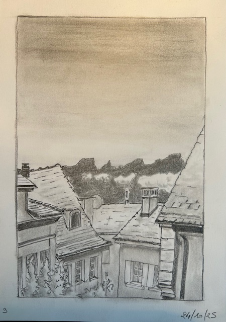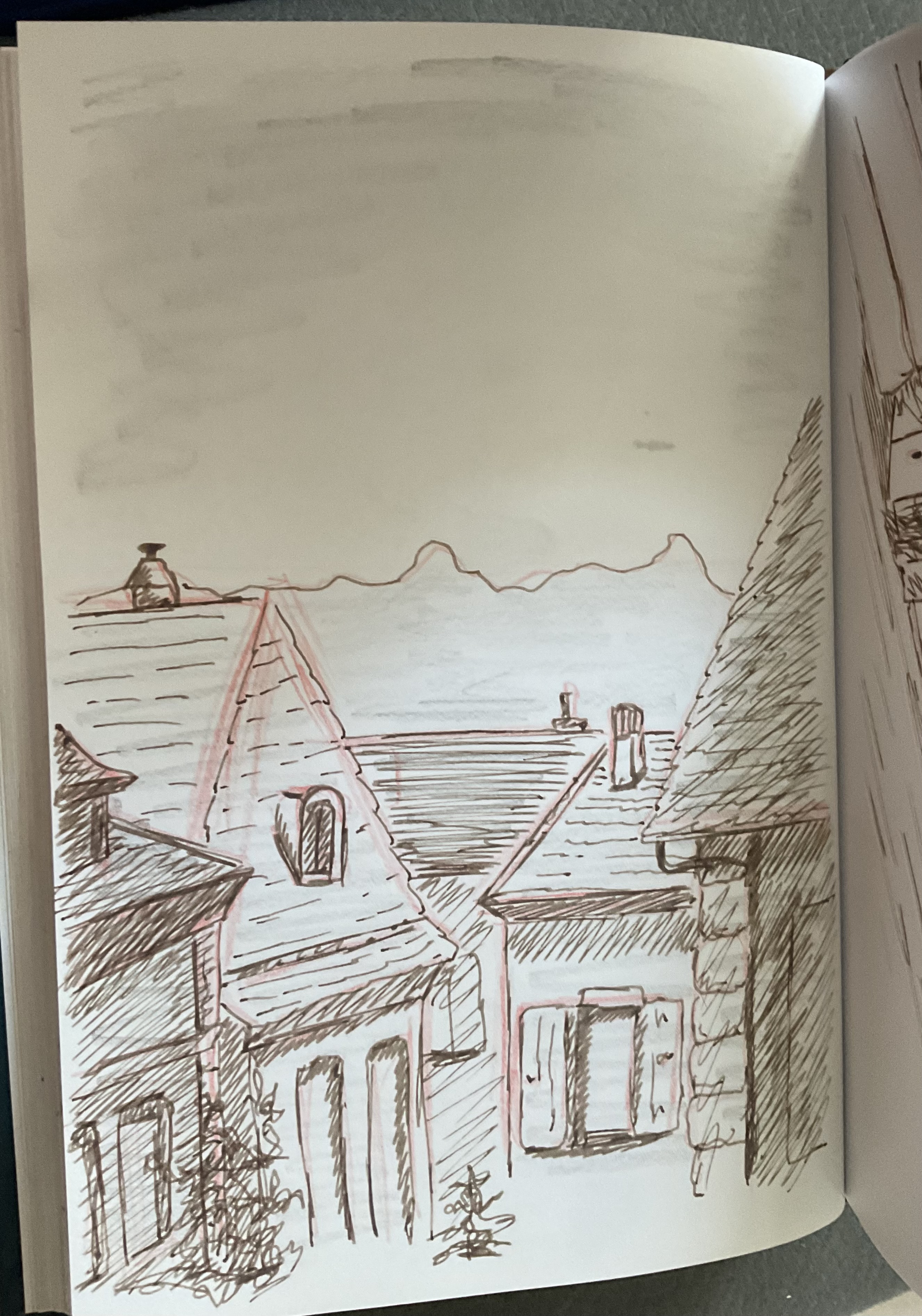 Ihre Skizze ist wirklich sehr erfolgreich! Die Perspektive ist Nickel und die Materialien werden transkribiert, ein kleines Detail, um es perfekt zu machen. Sie könnten das Dach des letzten Hauses im Hintergrund leicht auflünnen können, so dass es ein sehr leicht leichterer Wert ist als das Dach direkt als nächstes und es sich etwas mehr löst. In jedem Fall ist es sehr sauber, gut gespielt 👍