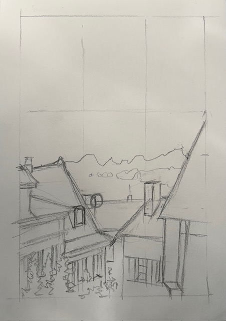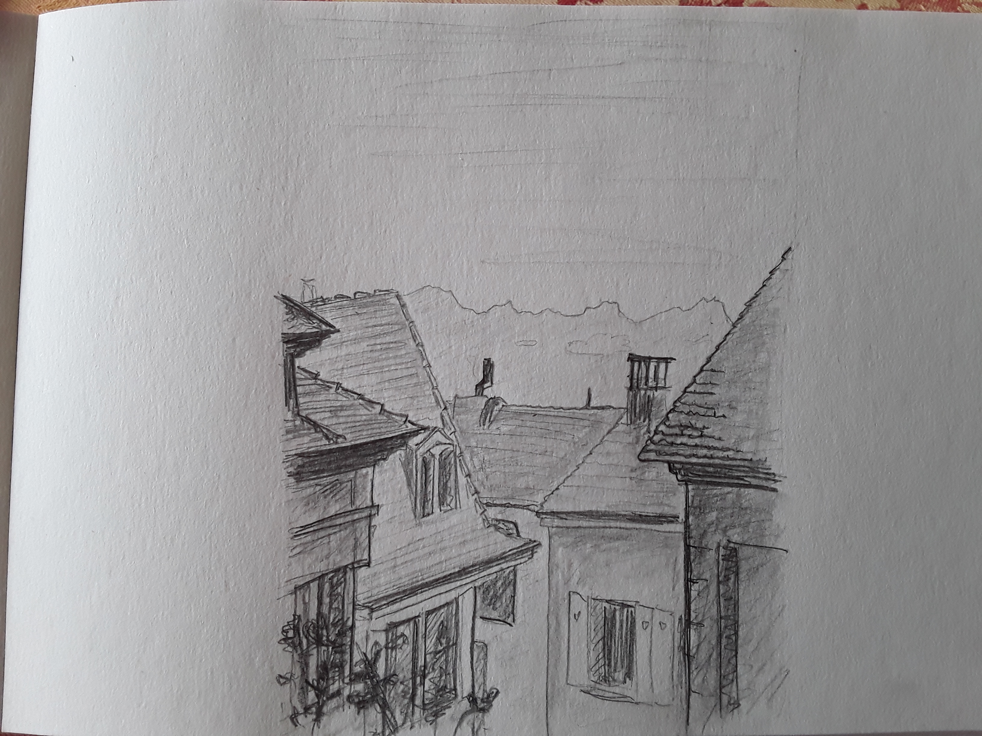 Ton esquisse est vraiment trè réussite ! La perspective est nickel et les matières sont bien retranscrites, un petit détail pour la rendre parfaite, tu aurais pu éclaircir très légèrement le toit de la dernière maison dans le fond afin qu'elle est une valeur très légèrement plus claire que le toit juste à côté et qu'elle se detache un peu plus. En tout cas c'est très propre, bien joué 👍