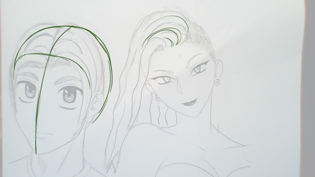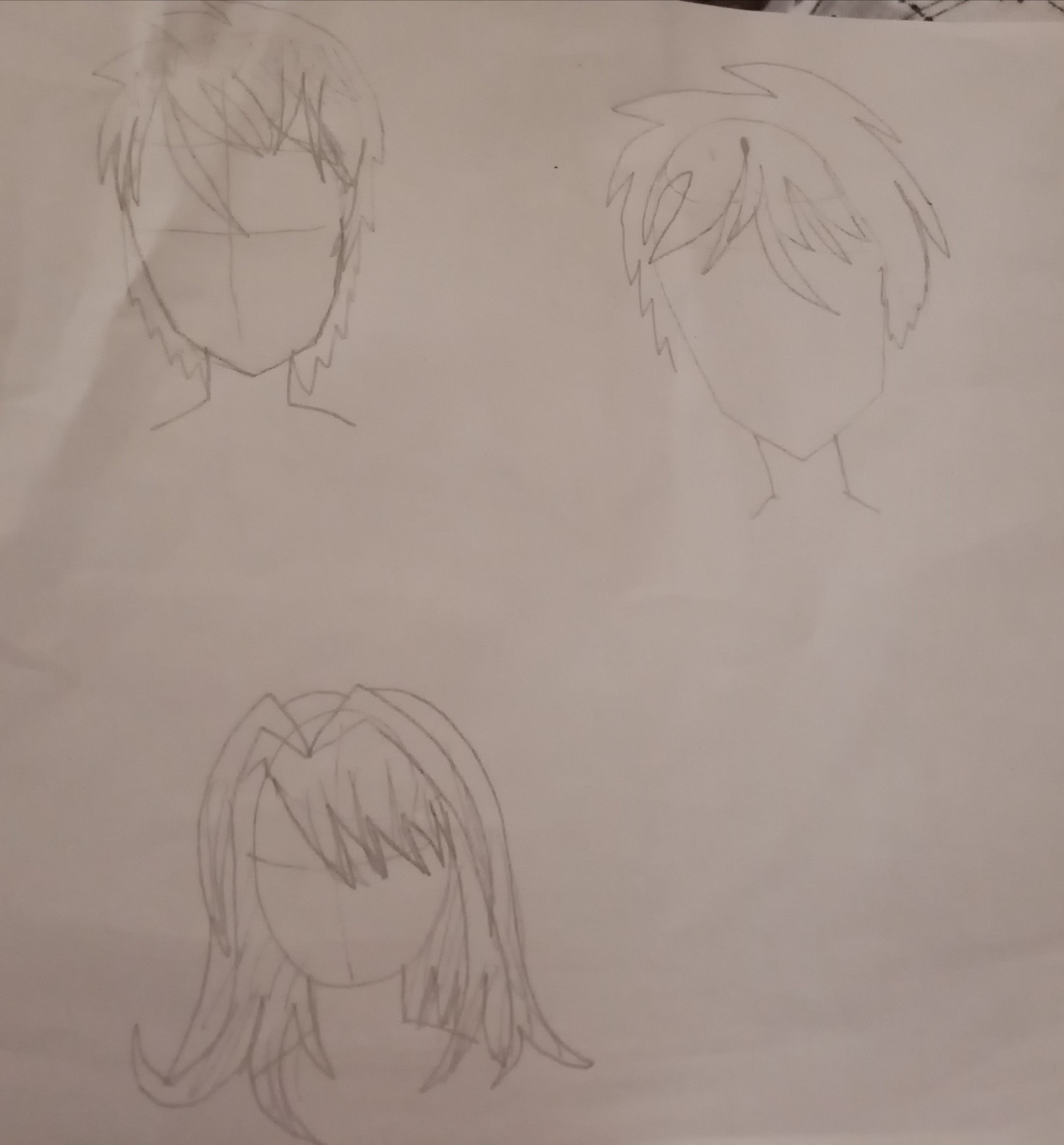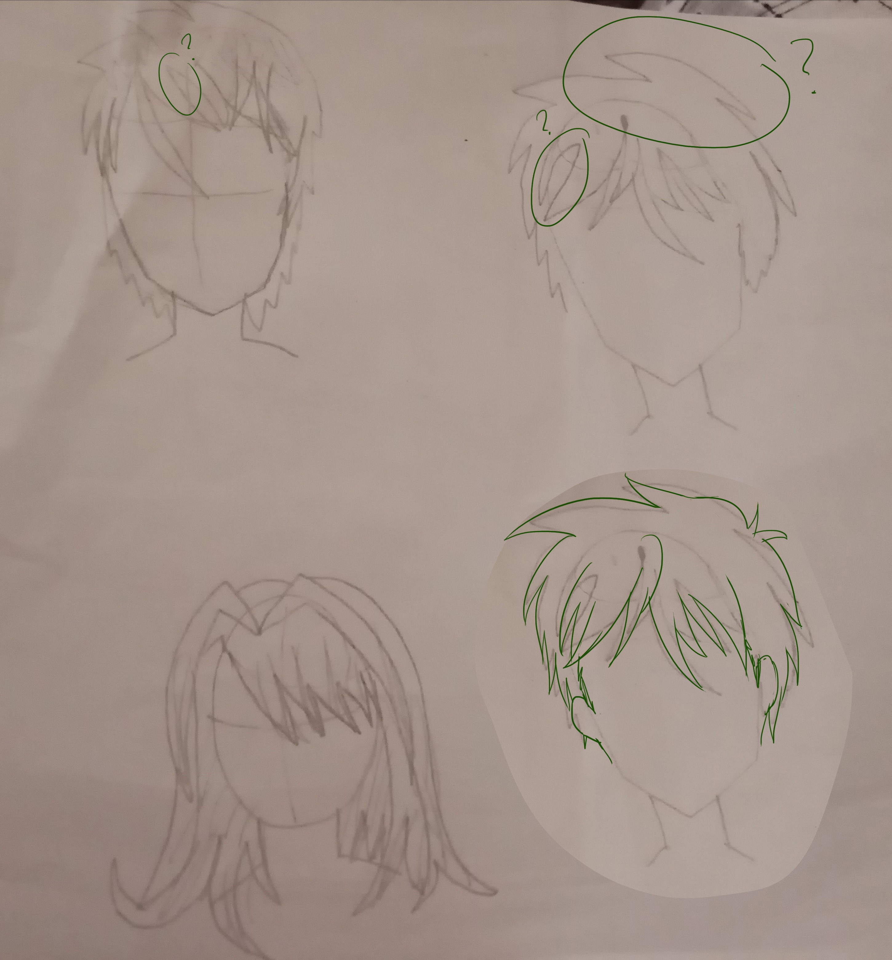 Tu sembles avoir en partie compris la logique des mèches. C'est pas encore ça, c'est un peu rigide encore disons. Mais ça viendra avec la pratique. En revanche, la taille du crâne et/ou sa forme n'est pas bonne. Je vois une ligne tracée sur le front des persos, je suppose que c'est l'implantation des cheveux (c'est bien ^^), mais ça veux donc dire que c'est de là que partent les cheveux, c'est là que se trouve leur racine, et non là où ils s’arrêtent. Je te joins une correction pour revoir un peu tout ça :3