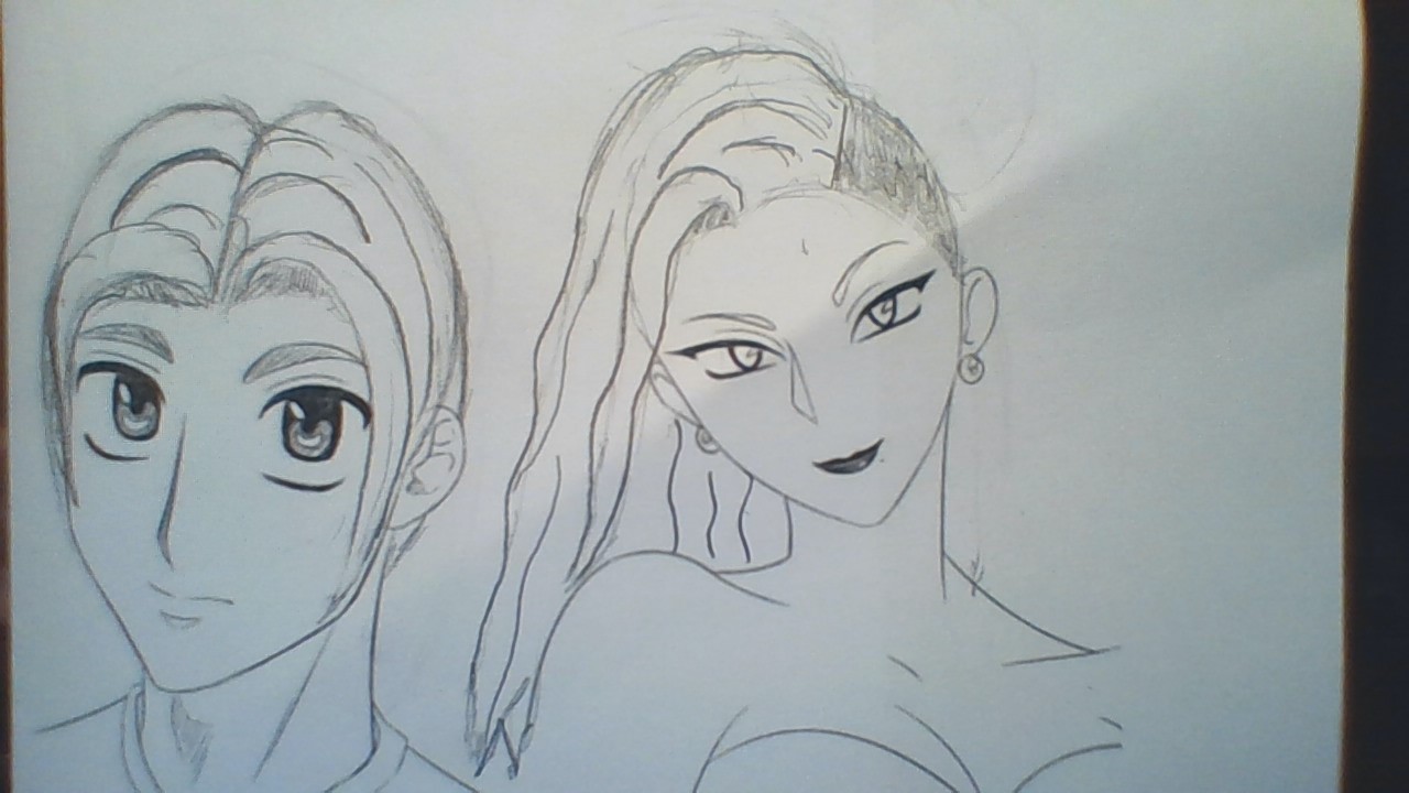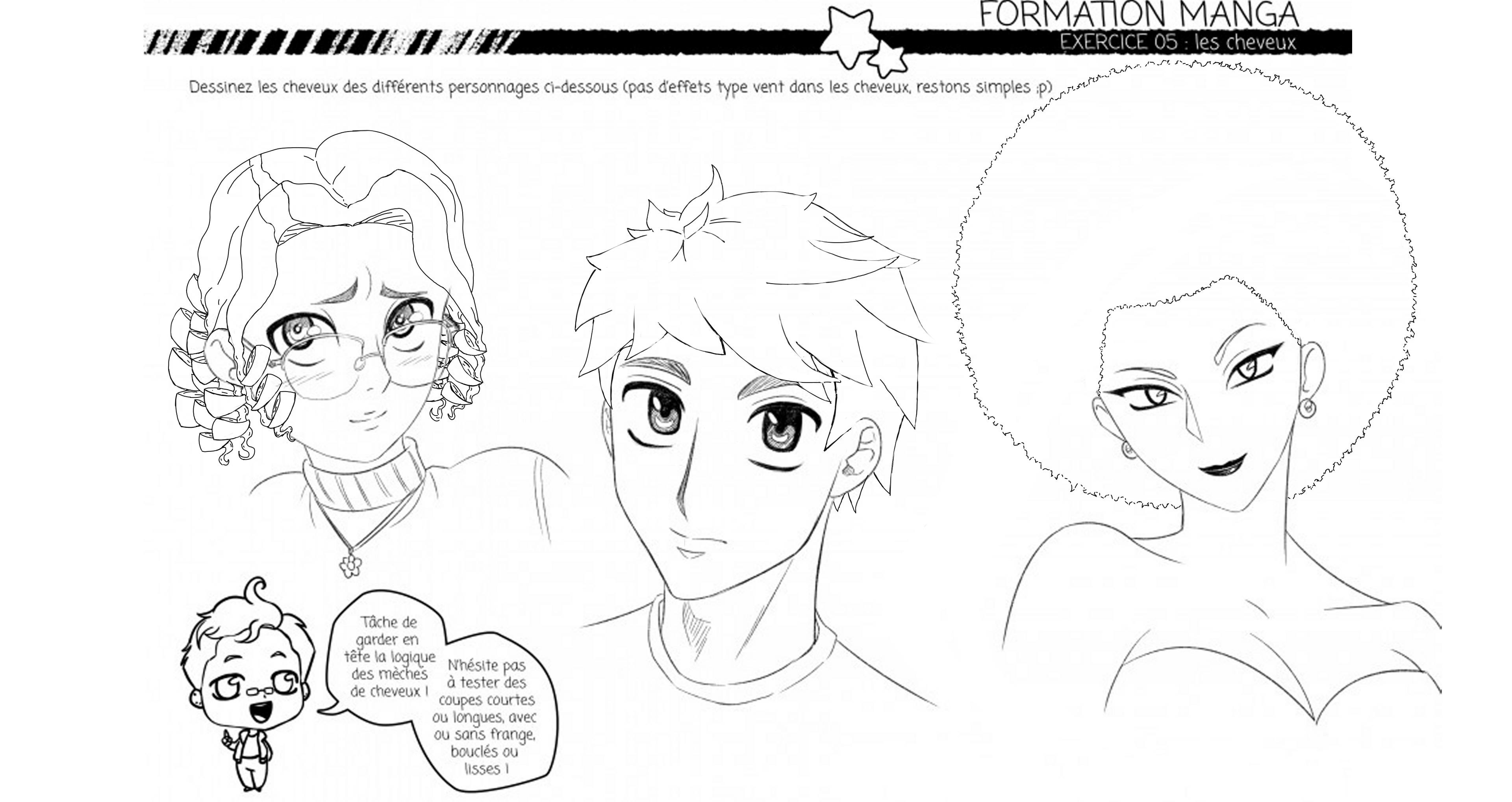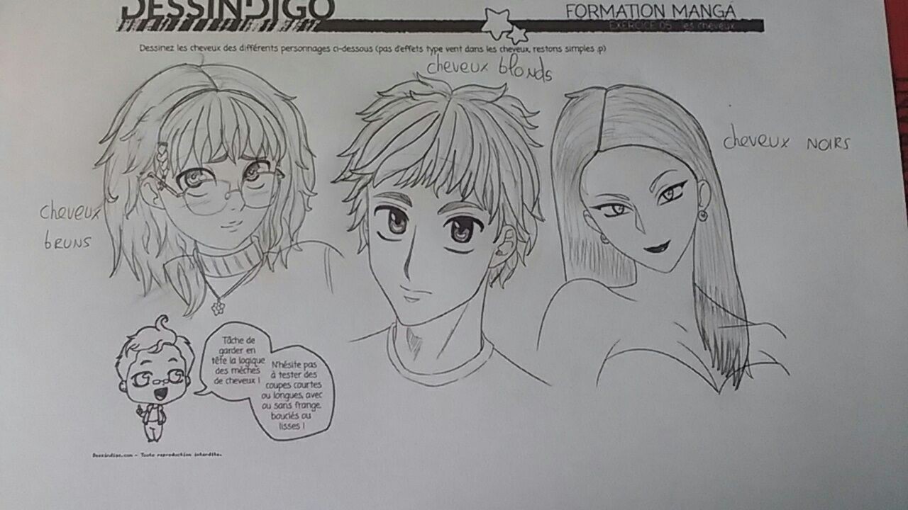 Tu sembles avoir en partie compris la logique des mèches. C'est pas encore ça, c'est un peu rigide encore disons. Mais ça viendra avec la pratique. En revanche, la taille du crâne et/ou sa forme n'est pas bonne. Je vois une ligne tracée sur le front des persos, je suppose que c'est l'implantation des cheveux (c'est bien ^^), mais ça veux donc dire que c'est de là que partent les cheveux, c'est là que se trouve leur racine, et non là où ils s’arrêtent. Je te joins une correction pour revoir un peu tout ça :3