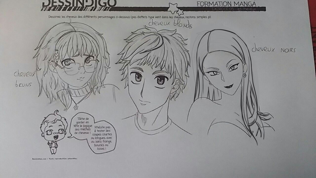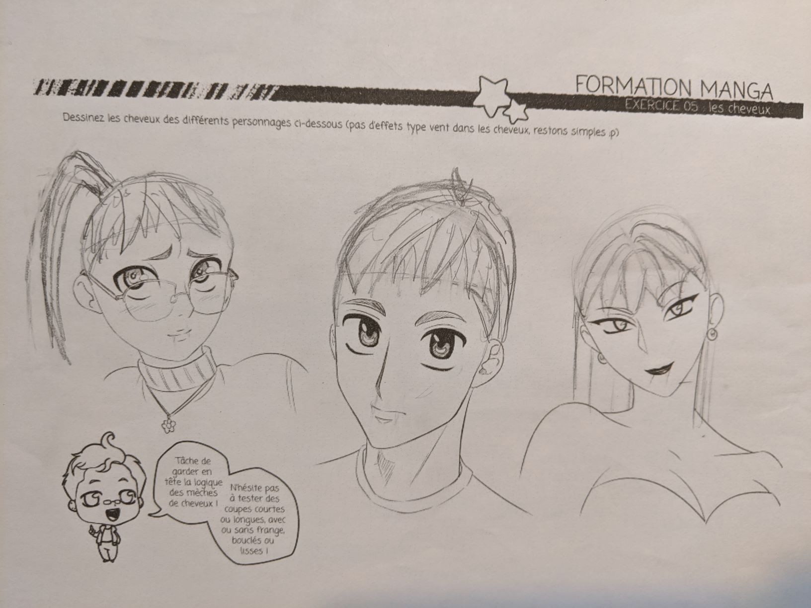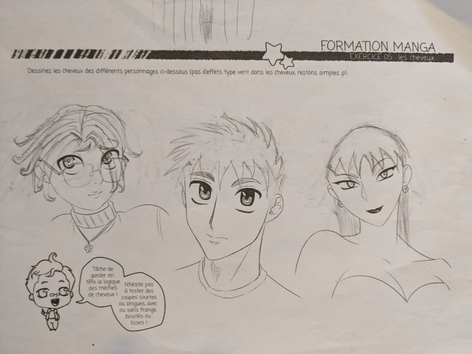 Für den Jungen gibt es eine zu systematische Seite: Zu viele Dochte haben trotzdem behandelt. Und für den letzten denke ich, dass die Form des Schädels nicht ganz gut ist, das Haar glatt aussieht, aber plötzlich hat es auf der linken Seite zu viel Volumen, wenn es nicht besonders pinseln scheint. Zögern Sie nicht, flexiblere Dochte zu machen. Ich bin Ihnen eine Korrektur an, um zu veranschaulichen, was ich sage ^^