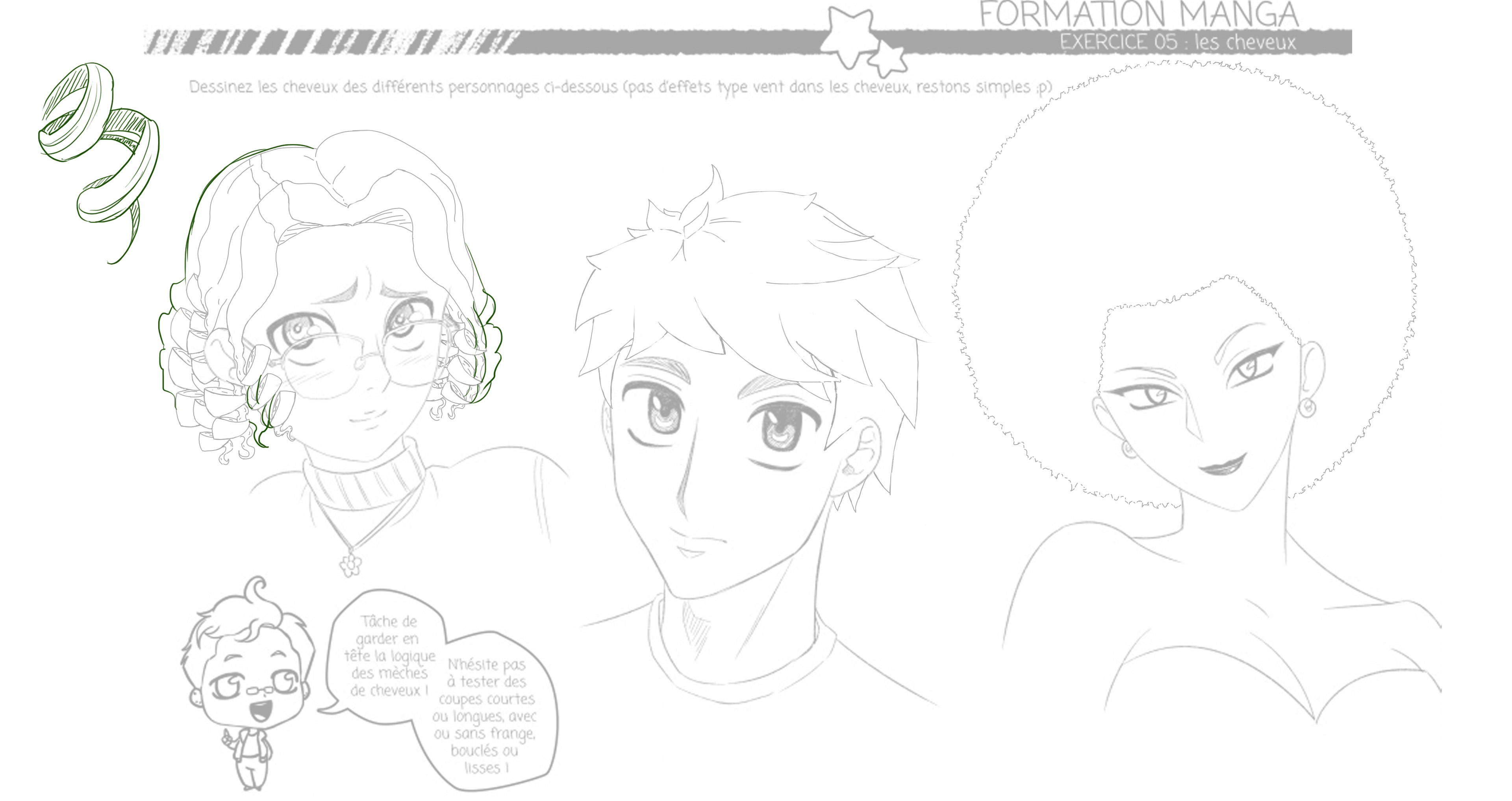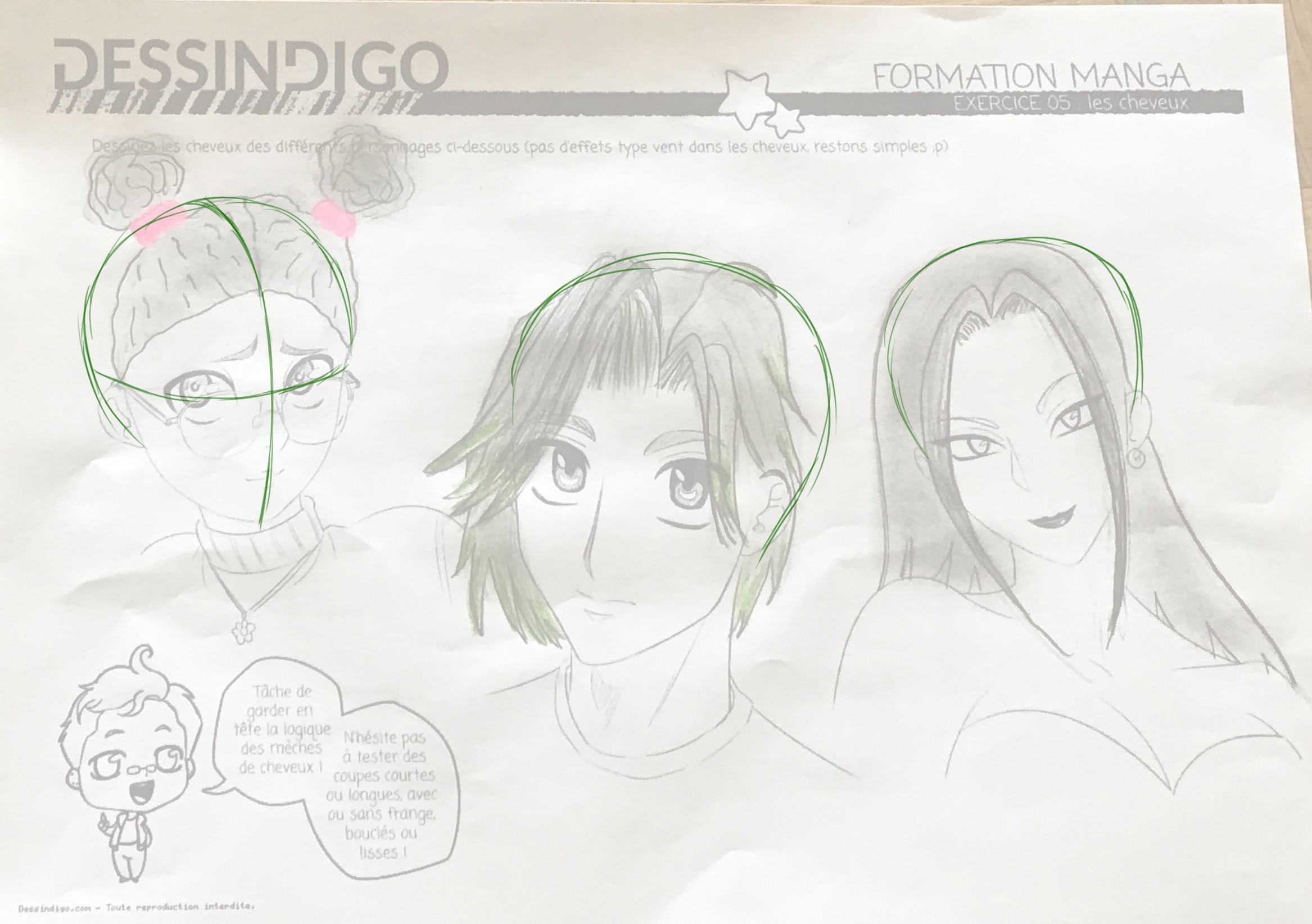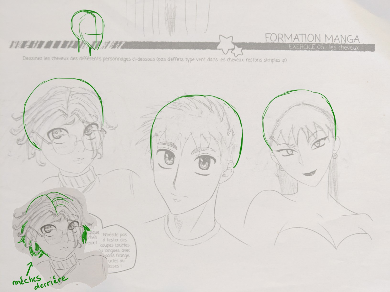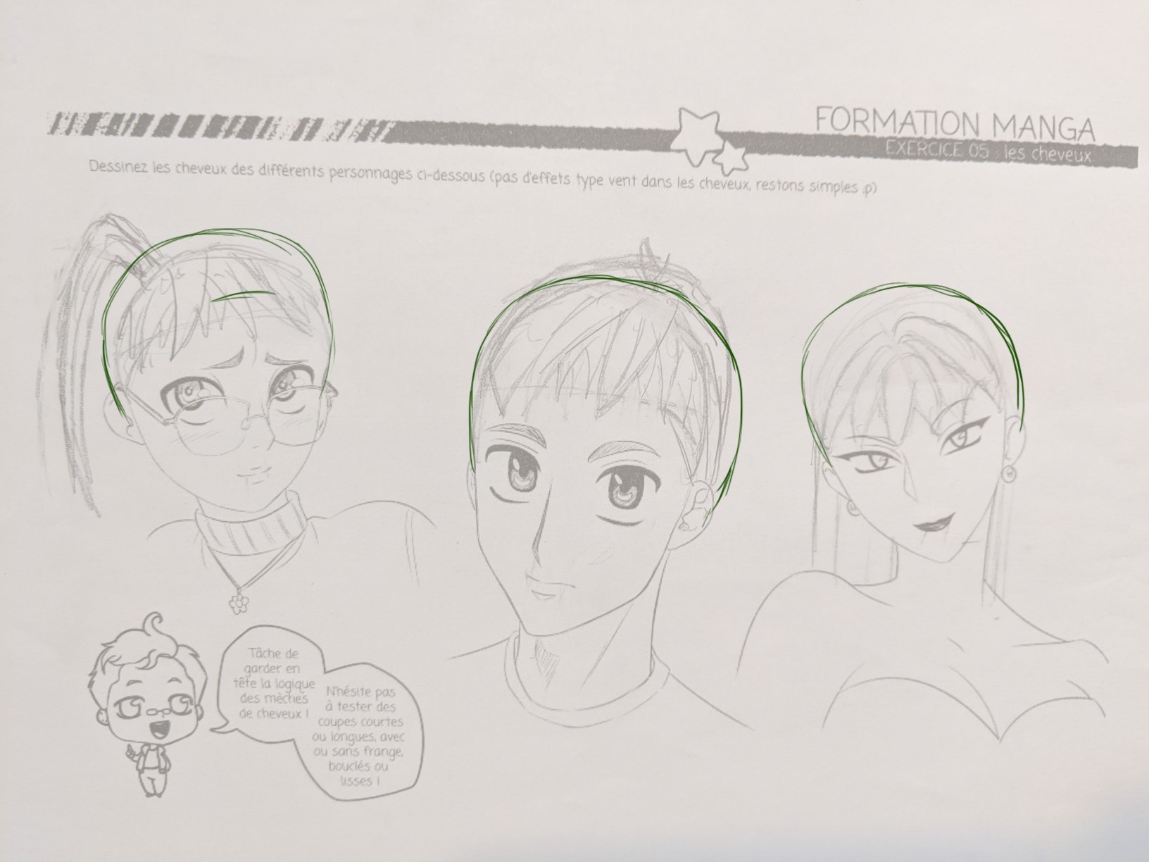 Sie scheinen die Logik der Dochte teilweise verstanden zu haben. Es ist noch nicht das, es ist ein bisschen starr, sagen wir. Aber es wird mit Übung kommen. Andererseits ist die Größe des Schädels und/oder seiner Form nicht gut. Ich sehe eine Linie, die auf der Stirn der Charaktere gezeichnet ist, ich nehme an, dass es die Implantation der Haare ist (es ist gut ^^), aber das bedeutet, dass von dort aus die Haare dort sind, dass ihre Wurzel ist und nicht dort, wo sie aufhören. Ich füge Ihnen eine Korrektur bei, um all das zu überprüfen: 3