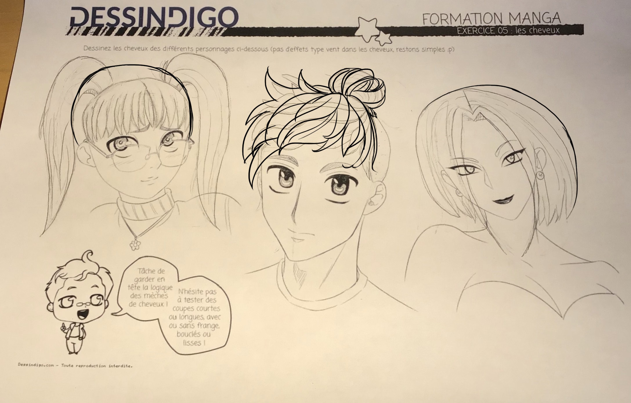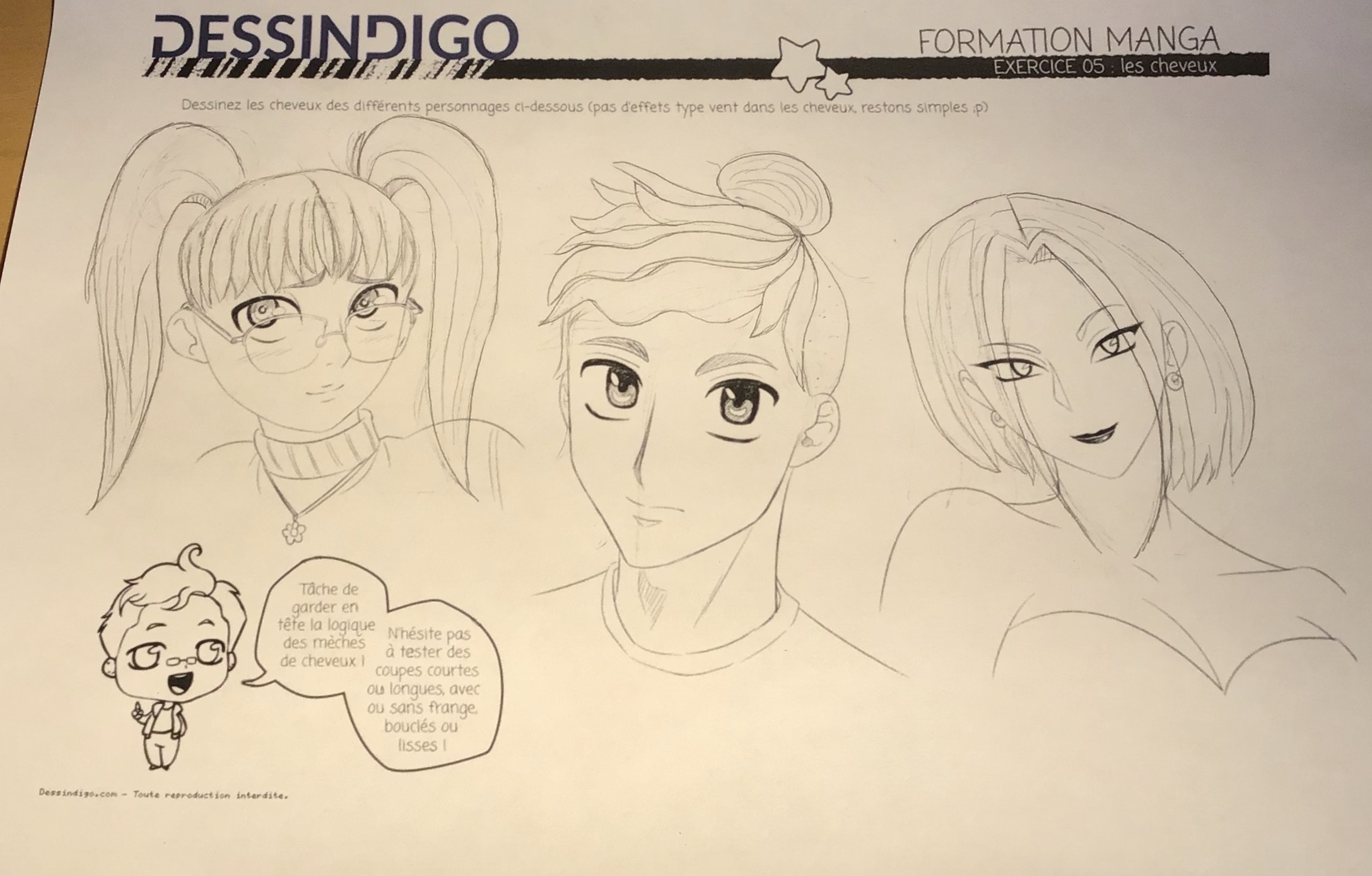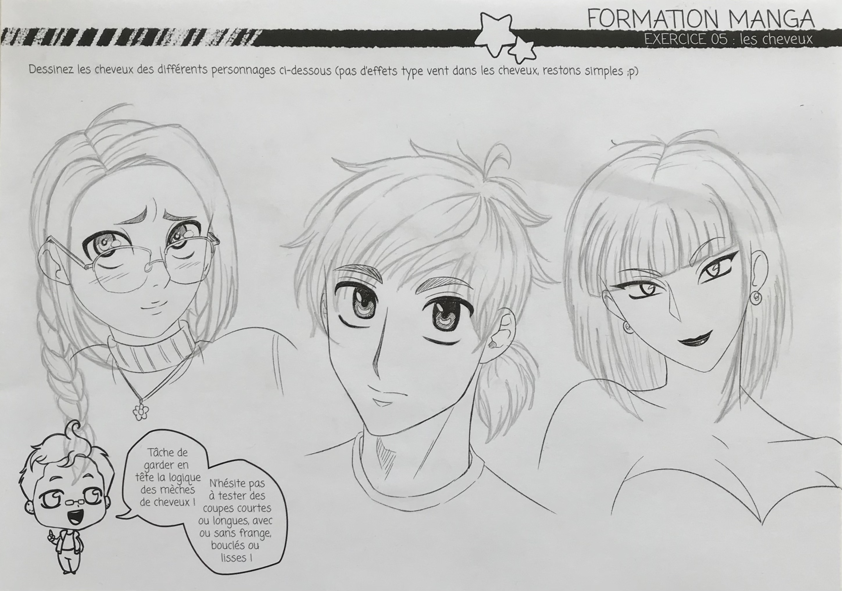 Dans l’idée, les coupes de cheveux que tu as choisies sont vraiment pas mal ! tu les as bien travaillées et on les comprends très bien pour deux d’entre elles :D