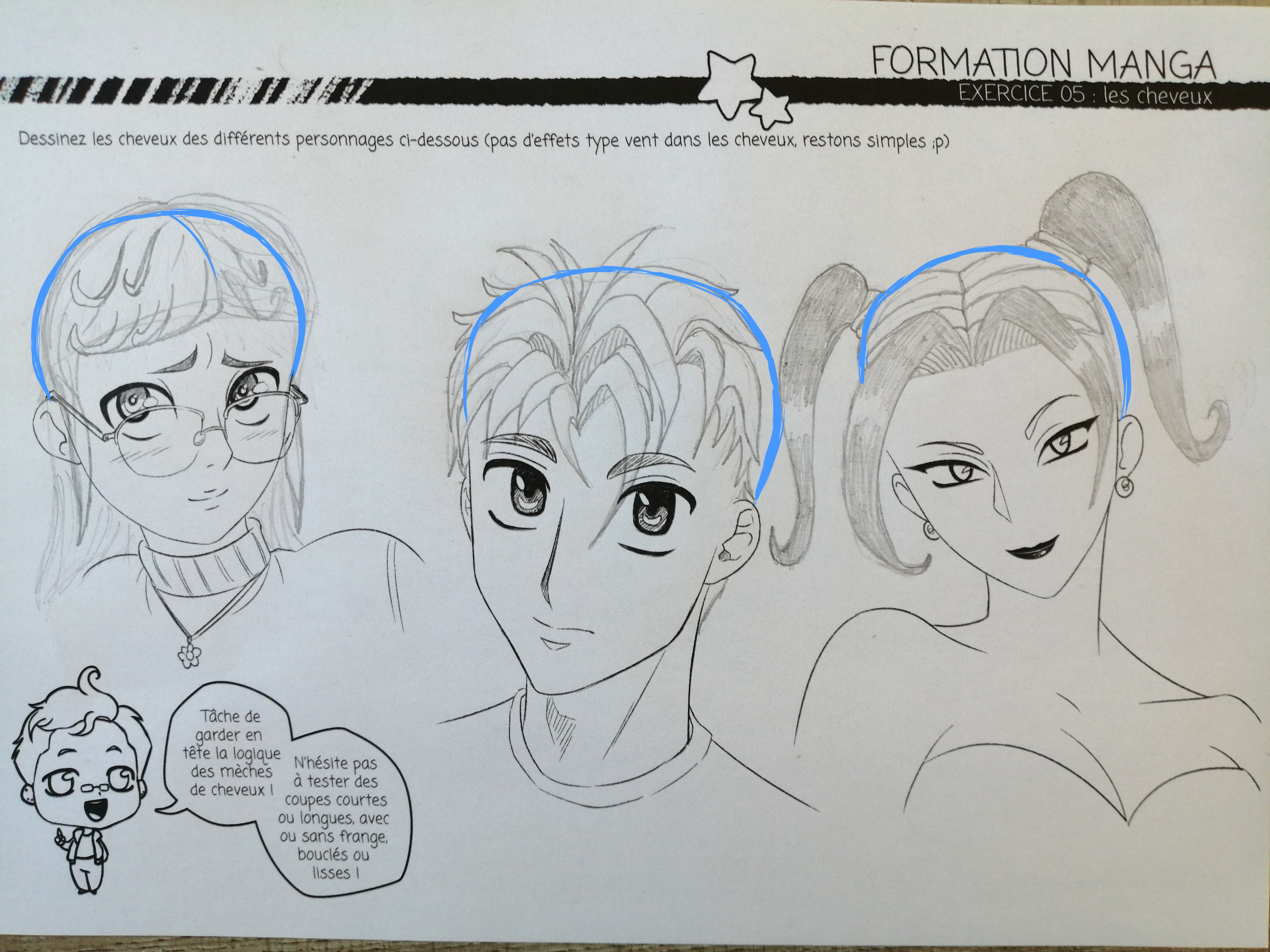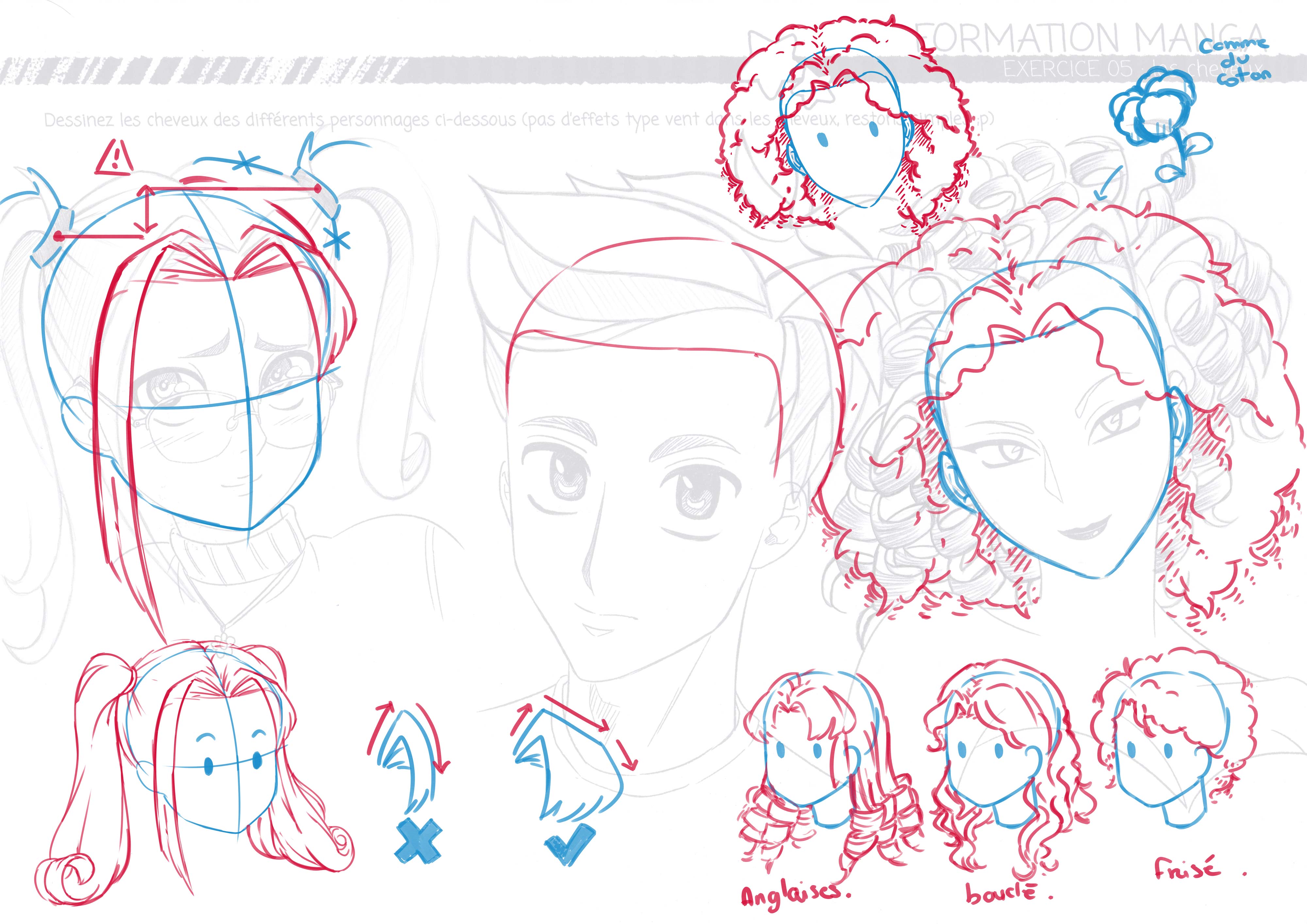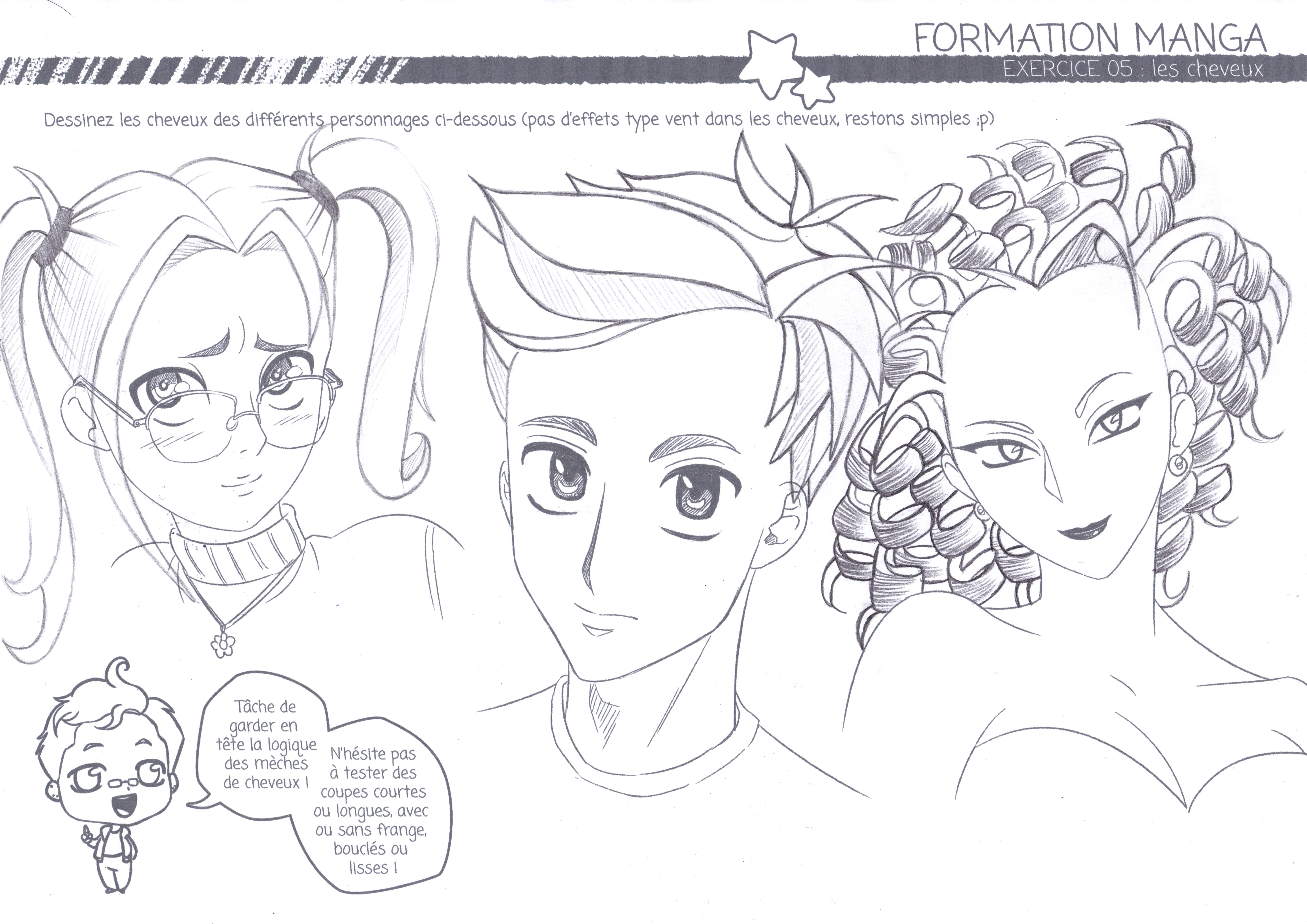 In Contrario des Jungen hat das Mädchen mit einer Brille ihren Schädel auf der rechten Seite zu hoch. :) Für ihre Layout -Linie wissen wir auf Ihrer Zeichnung nicht, wo ihre Haare beginnen, was den Eindruck erweckt, dass sie eine riesige Front hat! ^^ Um eine Idee zu bekommen, wo diese Linie lokalisiert werden soll, stellen Sie sich vor, Sie möchten das Gesicht des Charakters schneiden, um sie wie eine Maske auf Ihre zu legen. Der höchste Teil, den Sie schneiden, gehe ich in die Ohren, ist die Layout -Linie :) Haare ist überhaupt nicht einfach und desto lockiger, desto komplizierter ist es, sie zu interpretieren. In dieser Art betrügen wir ^^ damit Ihr Charakter lockiges Haar zu haben scheint, hätten Sie dem Liebling "Wellen" "Wellen" und detailliert das Innenraum. Danach wird ein Training einhergehen, mach dir keine Sorgen. Dies sind wirklich das komplizierteste Haar, da es viele Details erfordert. zögern Sie nicht, sich Referenzen zu untersuchen, um zu verstehen, wie es funktioniert. Sie werden dort ankommen;)