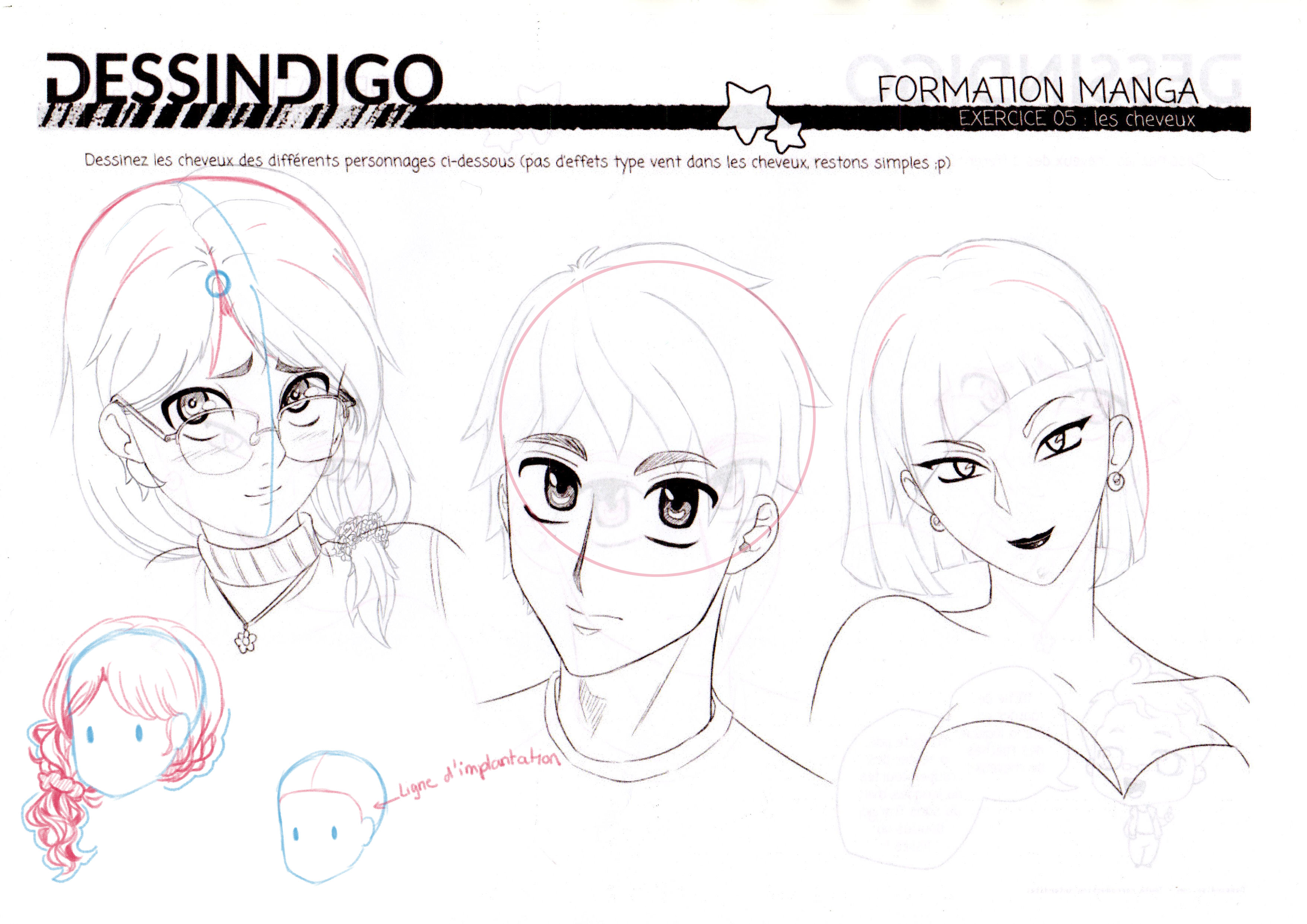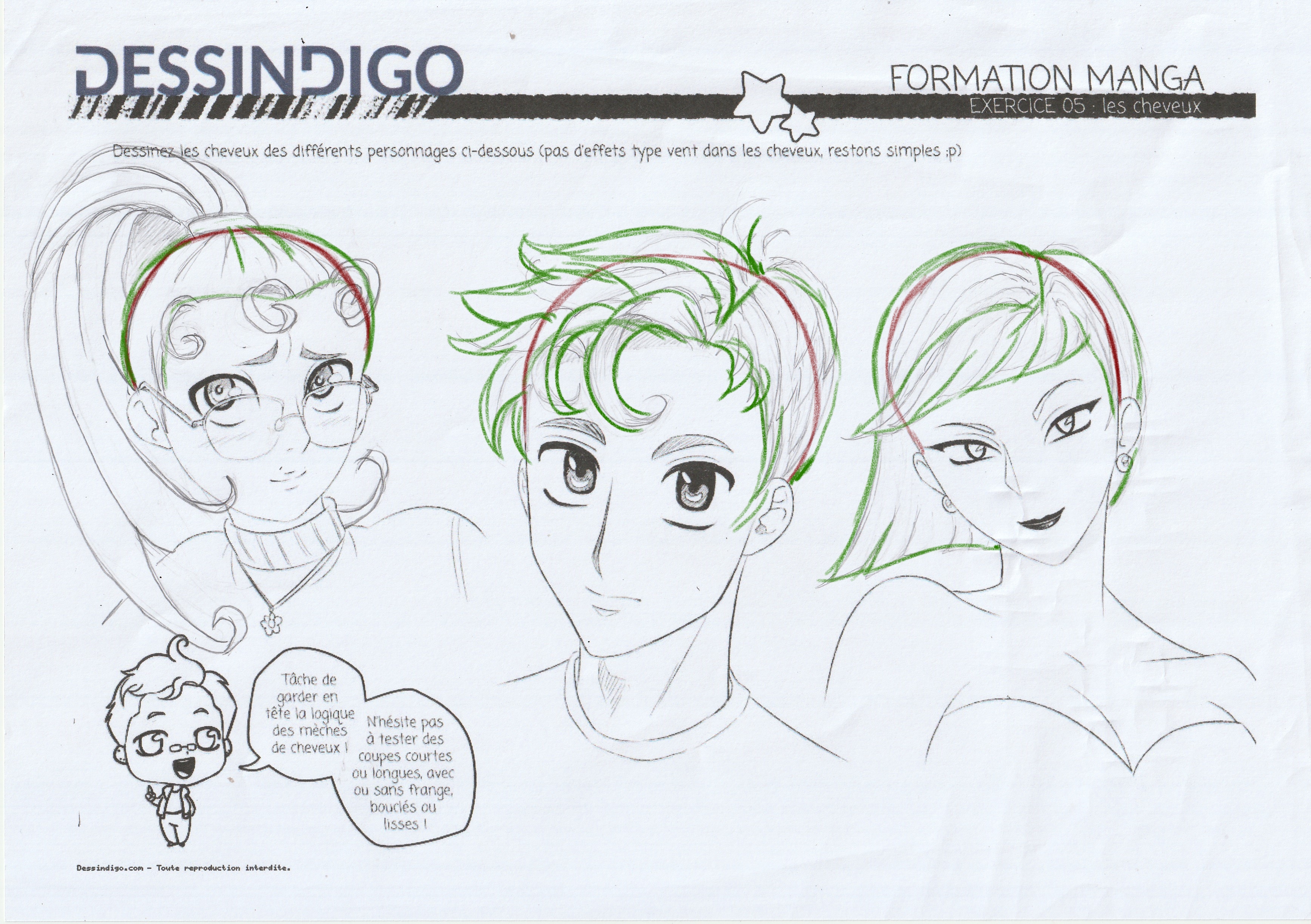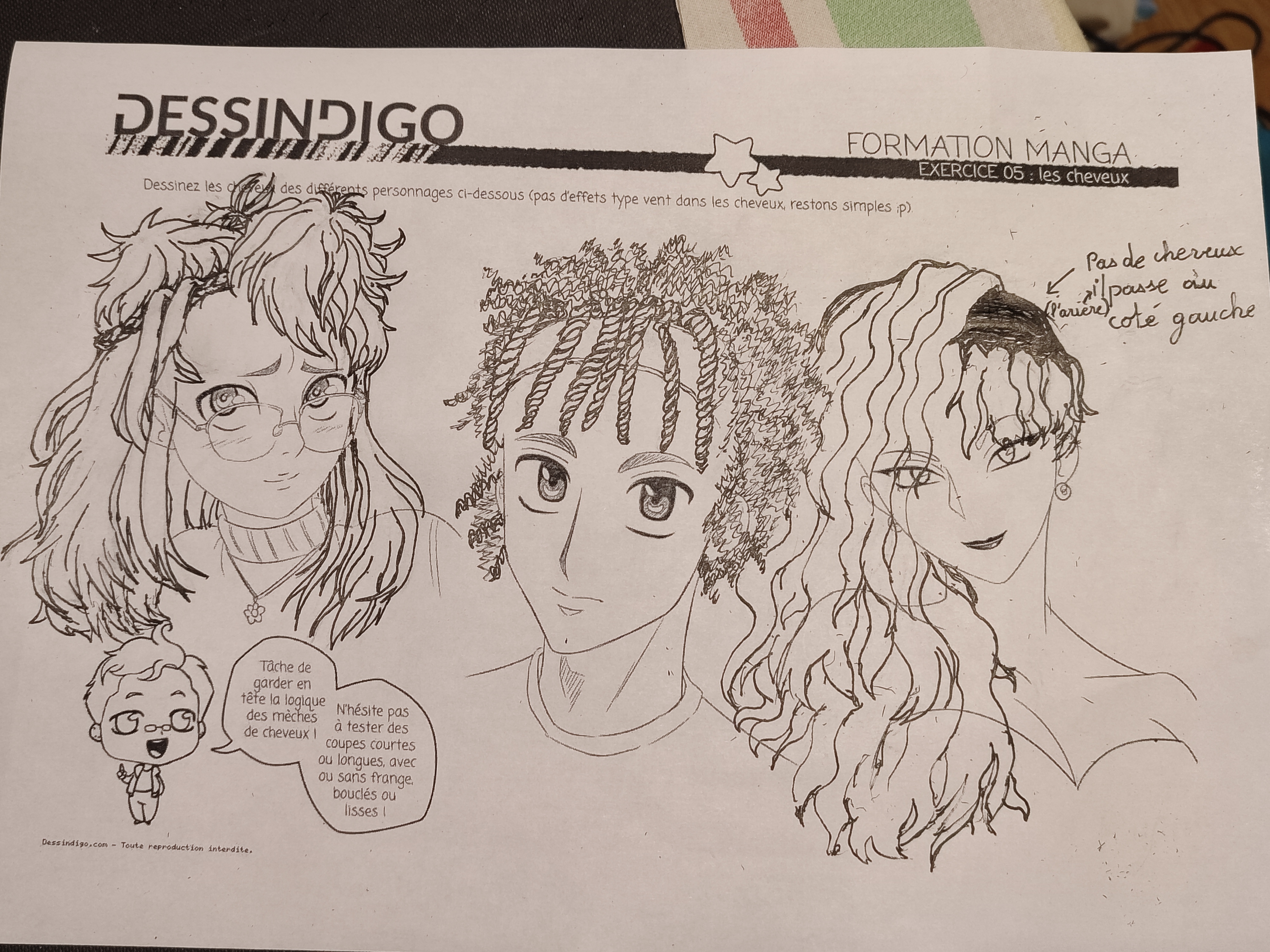 In Contrario des Jungen hat das Mädchen mit einer Brille ihren Schädel auf der rechten Seite zu hoch. :) Für ihre Layout -Linie wissen wir auf Ihrer Zeichnung nicht, wo ihre Haare beginnen, was den Eindruck erweckt, dass sie eine riesige Front hat! ^^ Um eine Idee zu bekommen, wo diese Linie lokalisiert werden soll, stellen Sie sich vor, Sie möchten das Gesicht des Charakters schneiden, um sie wie eine Maske auf Ihre zu legen. Der höchste Teil, den Sie schneiden, gehe ich in die Ohren, ist die Layout -Linie :) Haare ist überhaupt nicht einfach und desto lockiger, desto komplizierter ist es, sie zu interpretieren. In dieser Art betrügen wir ^^ damit Ihr Charakter lockiges Haar zu haben scheint, hätten Sie dem Liebling "Wellen" "Wellen" und detailliert das Innenraum. Danach wird ein Training einhergehen, mach dir keine Sorgen. Dies sind wirklich das komplizierteste Haar, da es viele Details erfordert. zögern Sie nicht, sich Referenzen zu untersuchen, um zu verstehen, wie es funktioniert. Sie werden dort ankommen;)