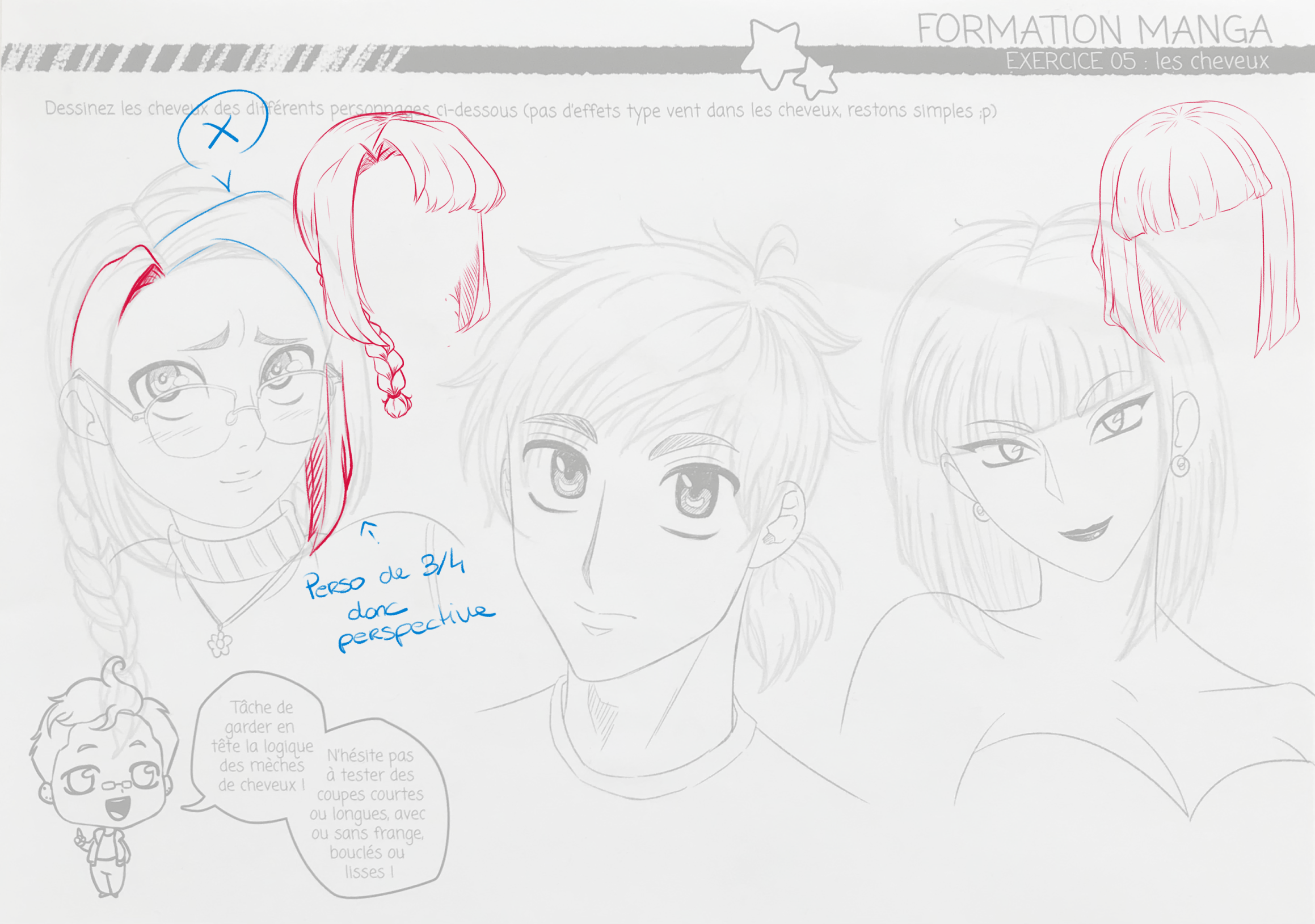 Pour finir, la jeune fille aux lunettes :D Comme pour les autres personnages, attention à la ligne d’implantation. Je me répète mais c’est très important si tu ne veux pas que tes personnages aient l'air d'avoir un front énorme ou une perruque. :) Attention à ses couettes. Elles ne sont pas sur le même plan de perspective. Sa couette gauche est trop haute par rapport à l'autre. La forme des cheveux doit suivre celle du crâne. D’autant plus quand les cheveux y sont plaqués comme dans le cas des couettes ou de queue de cheval. Pour ses mèches à l’avant il faut leur donner plus de profondeur et de volume. :)