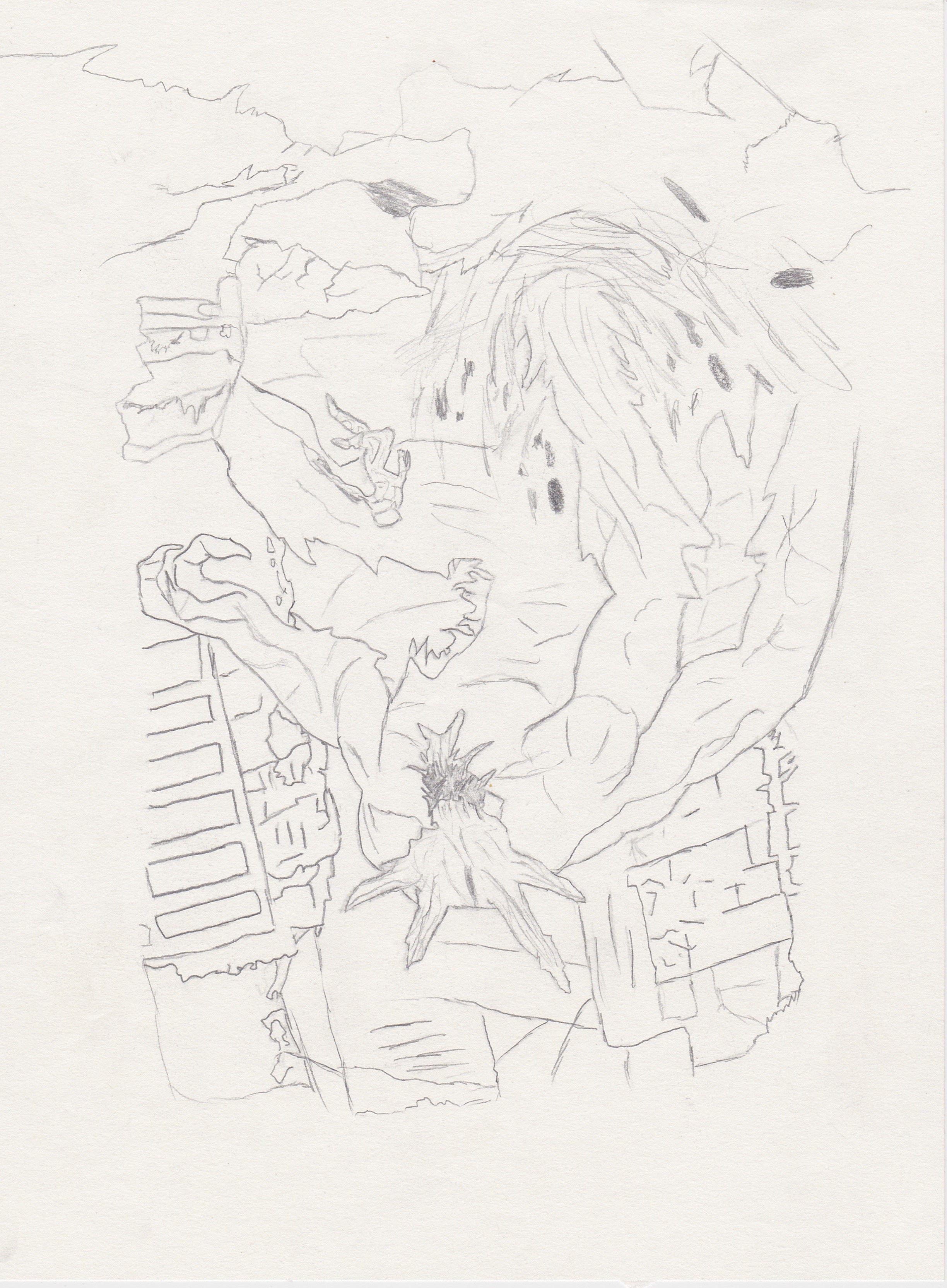 Alors c'est plutôt cool j'aime bien ton monstre et ta compo fonctionne plutôt bien je trouve. Par contre c'est très difficile à lire car tout est traité à peu près pareil. Tes bâtiments ont presque des traits plus épais que tes persos, alors qu'ils sont dans le lointain.