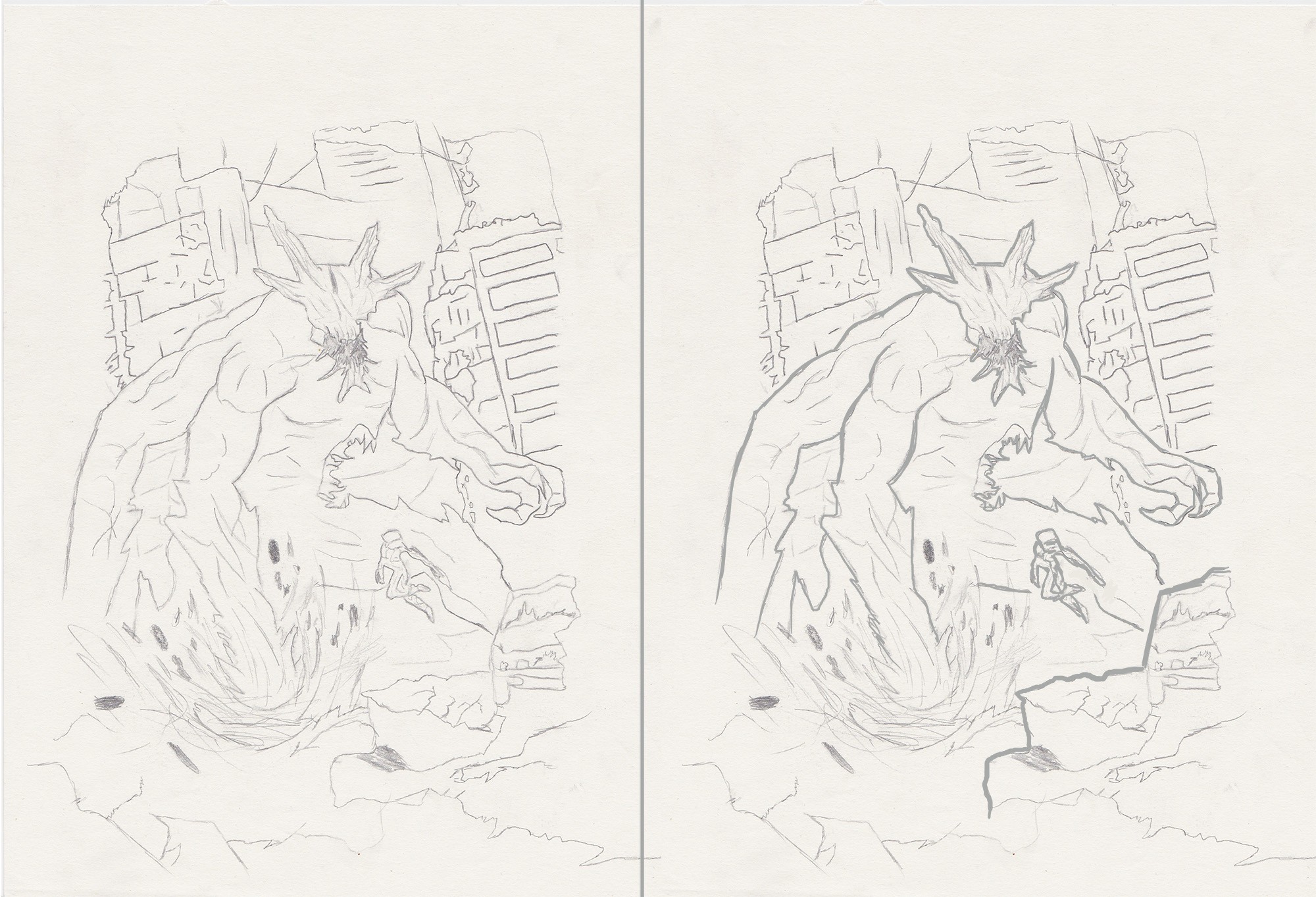 For that matter, you need to play with the line values to make your drawing easily readable and to really focus attention on your hero and the monster. Don't hesitate to erase small bits of lines to separate your planes from each other (here I erased quite a few small bits of the buildings behind the monster). It would work even better if your buildings had thinner lines, but it gives you an idea of the effect it can have just by playing with the line values (done quickly, sorry ^^').