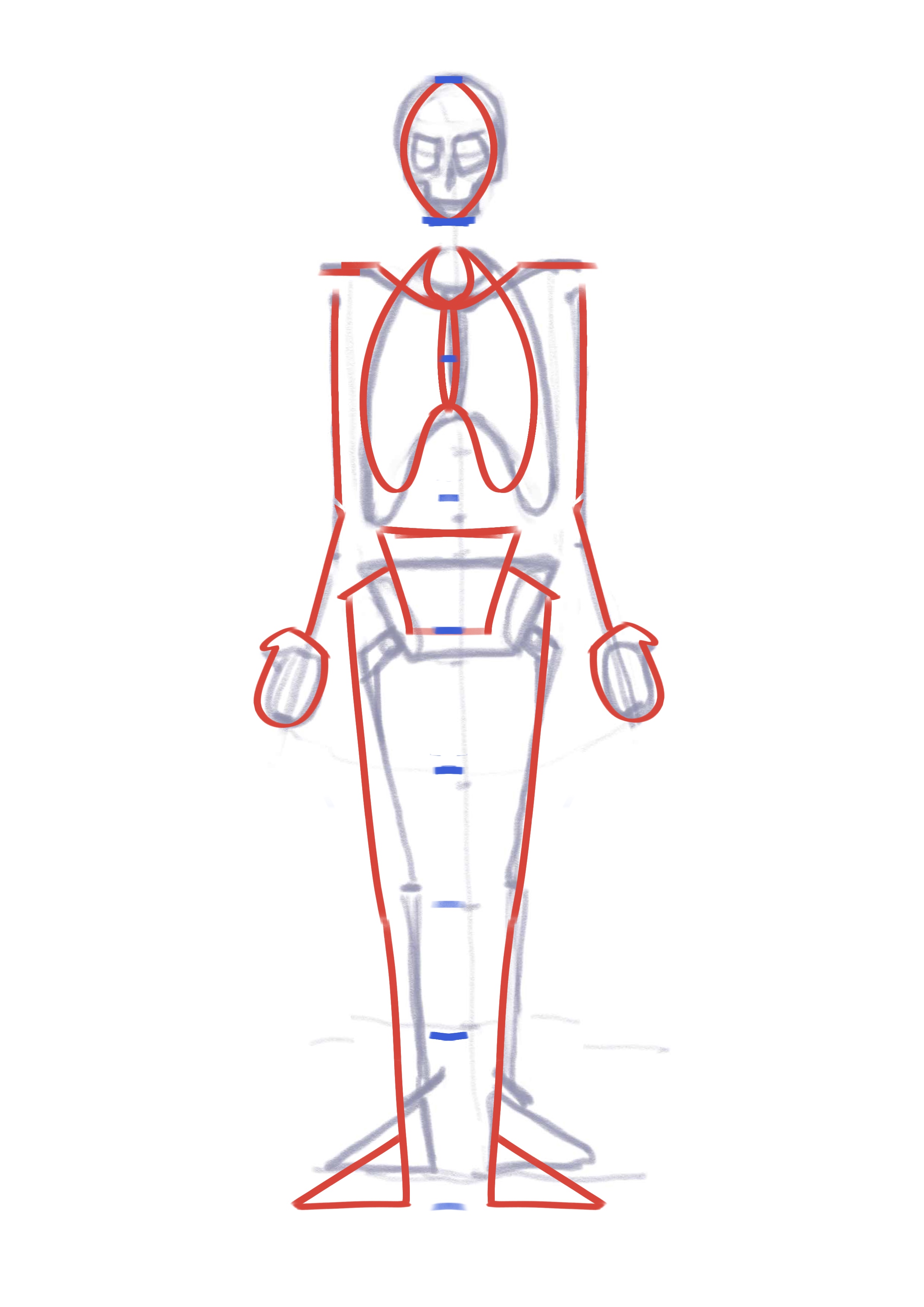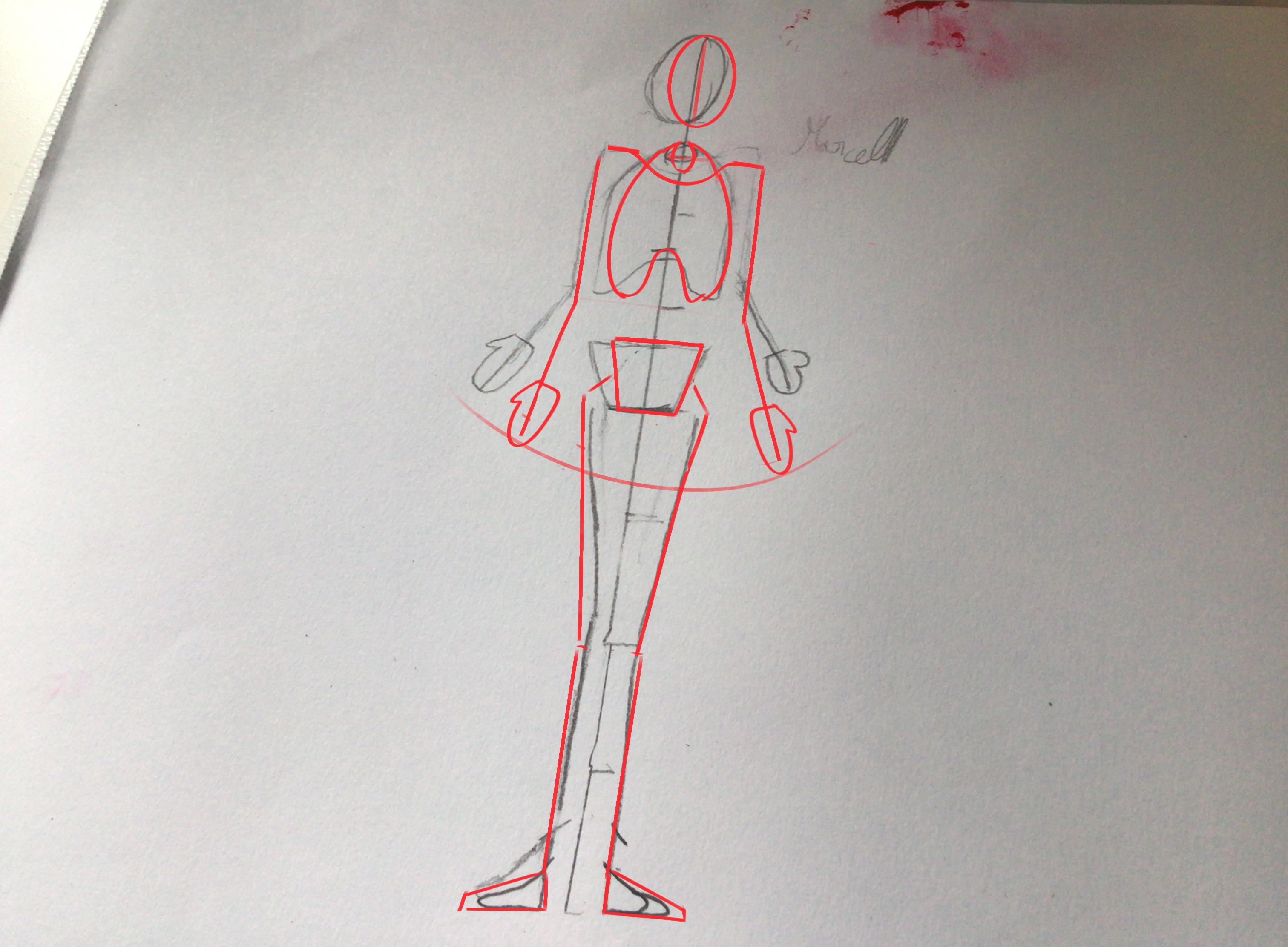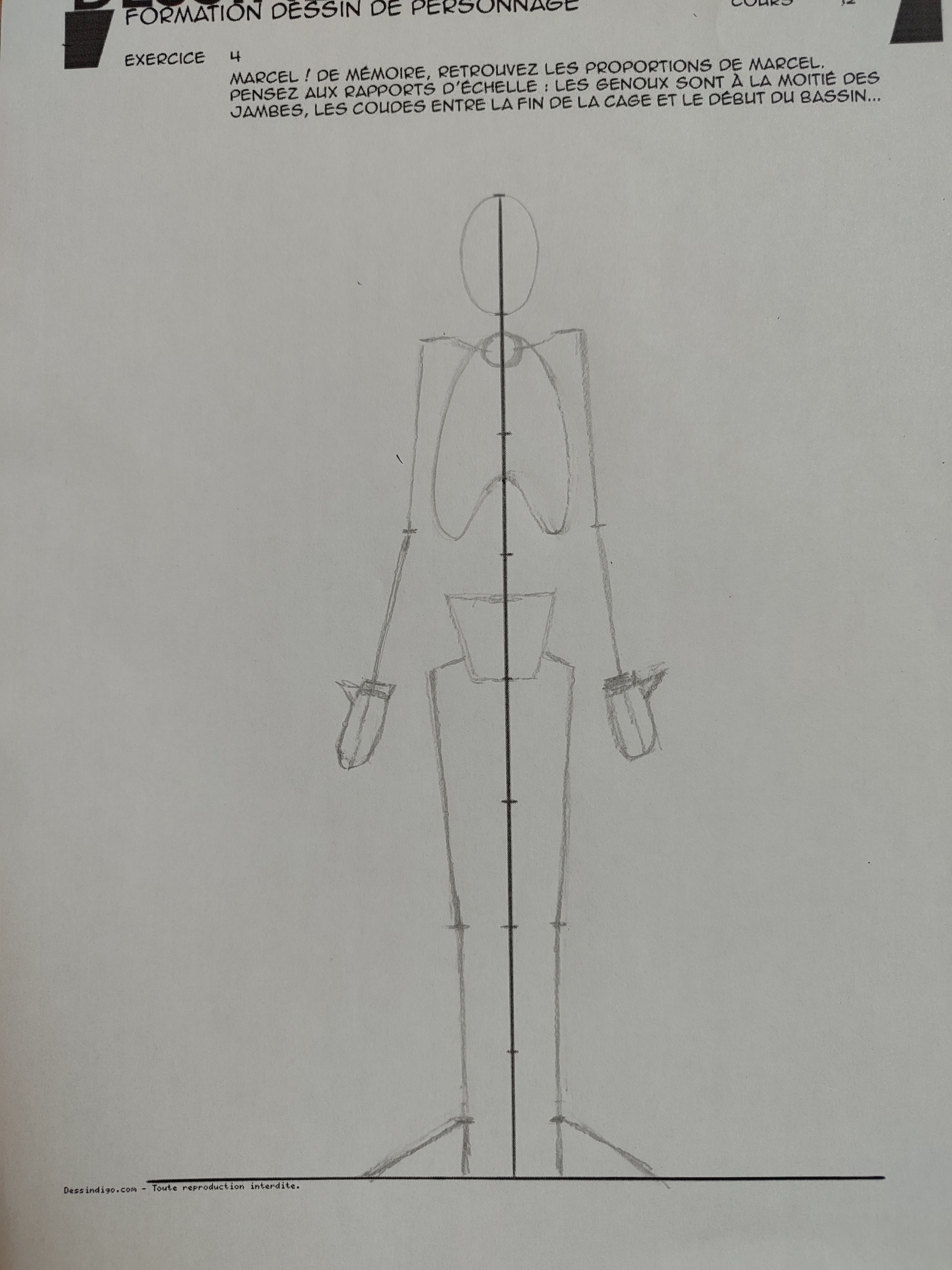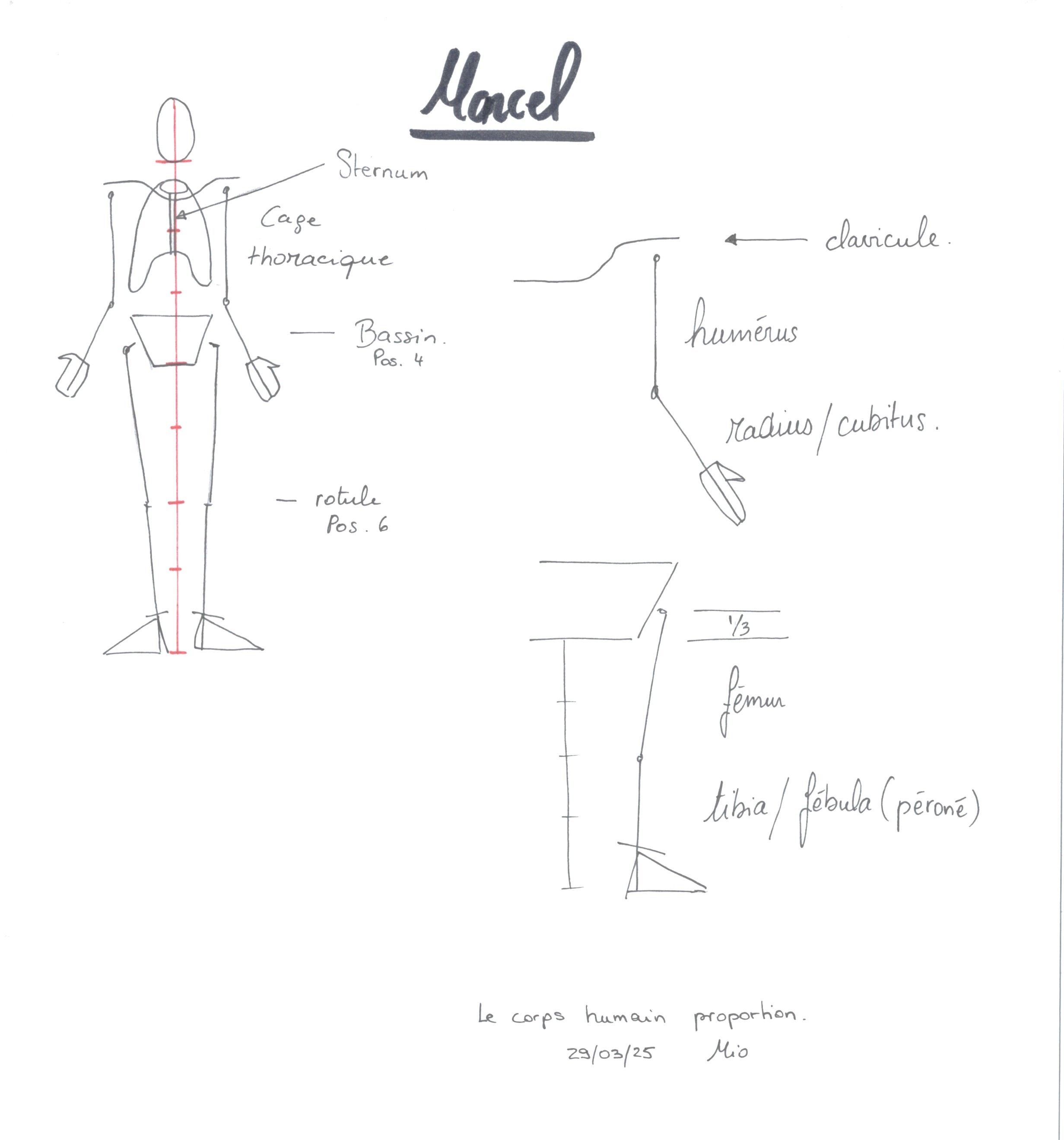 Dans l'ensemble ton Marcel est plutôt réussit, je t'ai fais quelques petites correction pour être vraiment pointilleuse. Les bras, clavicule et tête sont parfait, mais la cage thoracique est un peu trop longue et surtout, n'oublie pas de bien lui donner une forme ovoïdale, le pelvis est un poil large (mais ça pourrait fonctionner) Par contre le tien est un peu bas, les pieds sont un peu plus bas, en modifiant ces deux éléments les jambes qui paraissaient petites retrouve une taille normal. Ca reste du bon boulot 👍