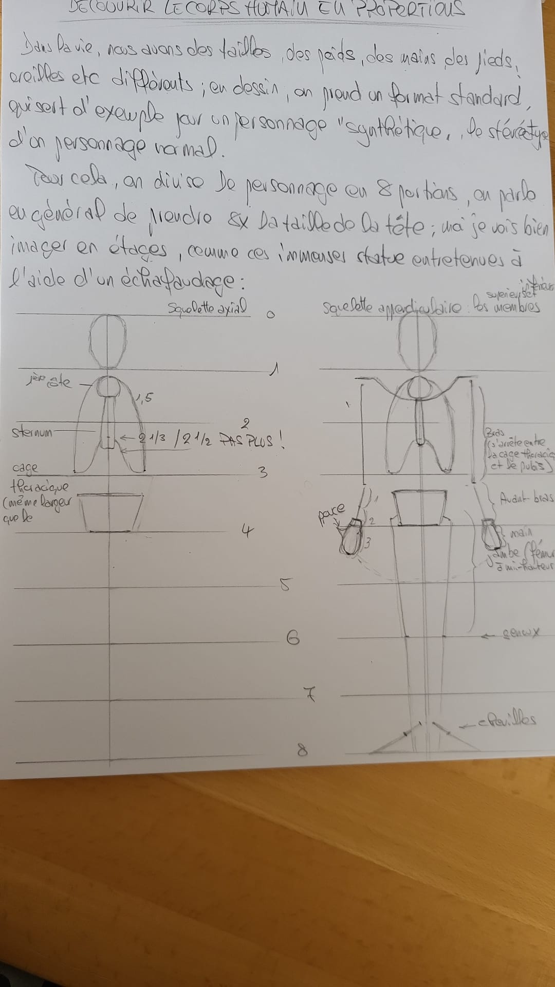 Là, j'ai complètement foiré ma fiche, trop de choses par rapport à la place pour chaque élément, alors après avoir réfléchi si je refaisais chaque fois Marcel du début, en ajoutant au dessin suivant le nouvel élément, j'ai fini par faire ceci pour le moment, Marcel en 2 temps, le squelette axial pour commencer, puis l'appendiculaire, pour avoir la place des petits infos sur les membres ( il n'est pas impossible que je ne revienne pas sur mes dizaines de Marcel avec un nouvel élément chaque fois, quand je réécrirai mes notes au propre ?! ).
