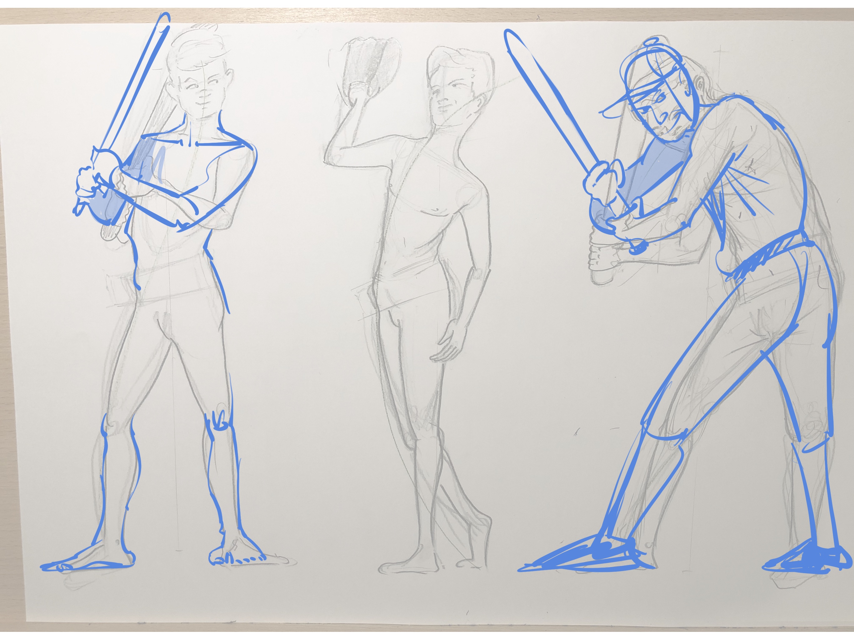 Voici une des série que j'ai réalisé. J'ai travaillé un peu plus les personnages. J'ai un peu galèré sur le dernier personnage pour arriver à une pose qui semble naturel. Pas certain d'y être arrivé mais l'exercice est très intéressant. Je n'arrive pas encore bien à positionner mes mains pour rendre une bonne dynamique. Mais je vais continuer à intégrer cet exercice dans ma routine pour progresser.