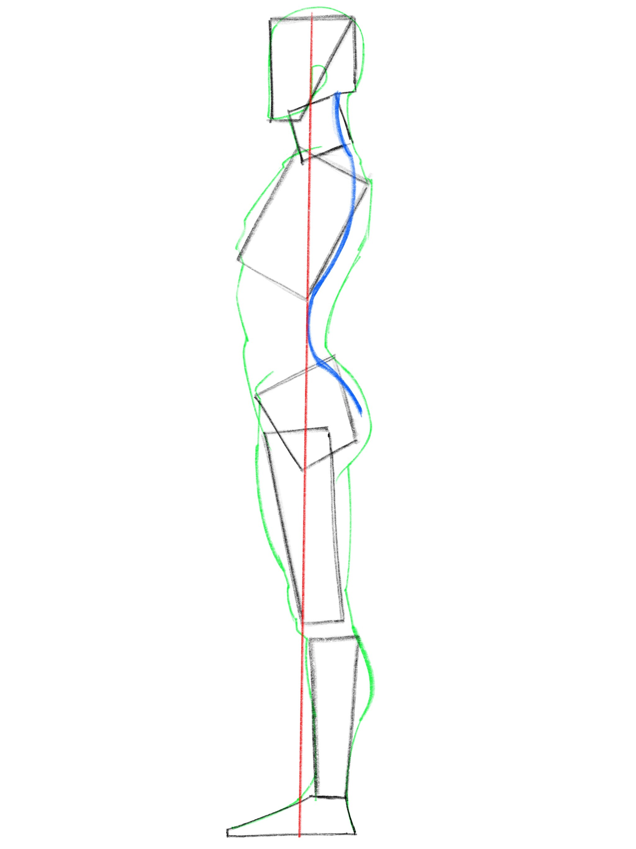 For a character who is not standing up straight, it is important to always align the head and feet vertically, as this is how the character will maintain good support.