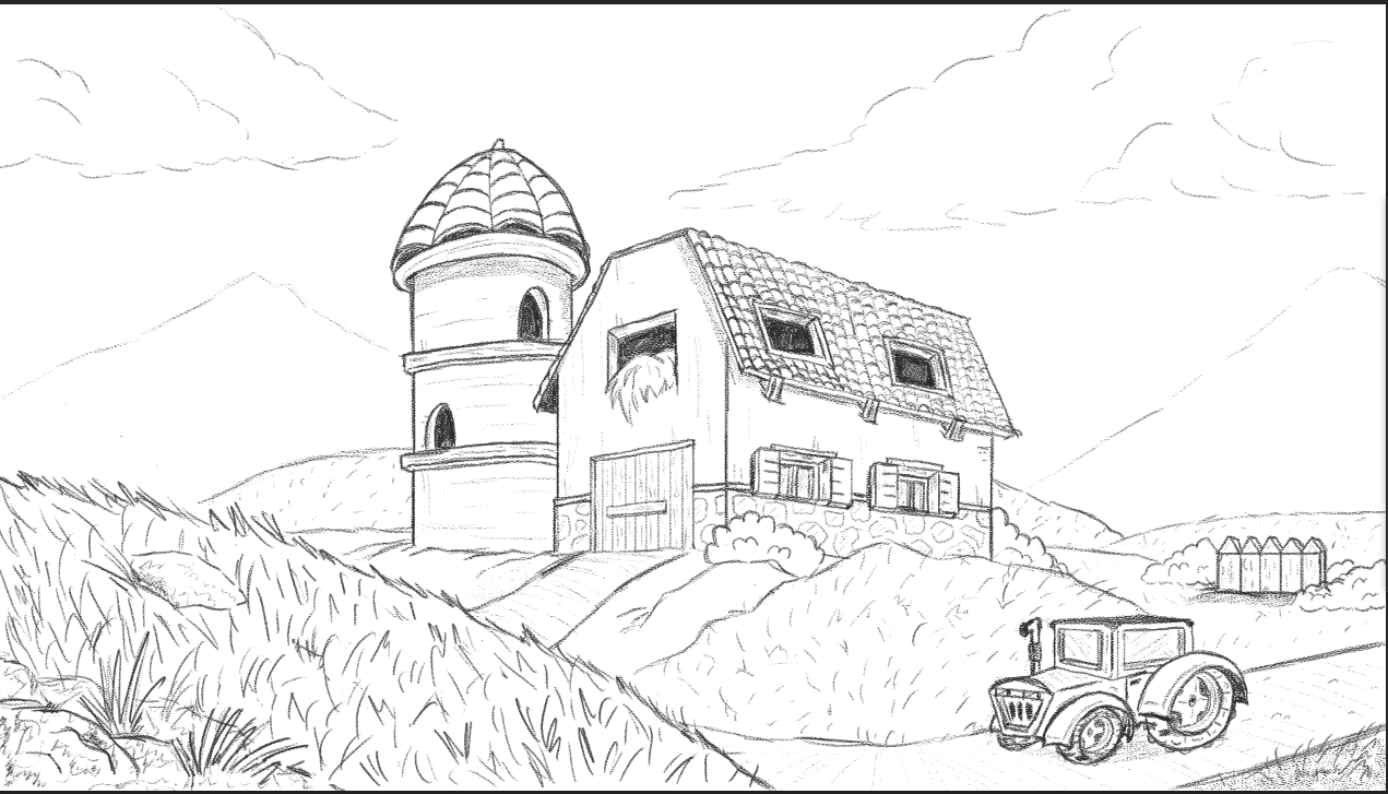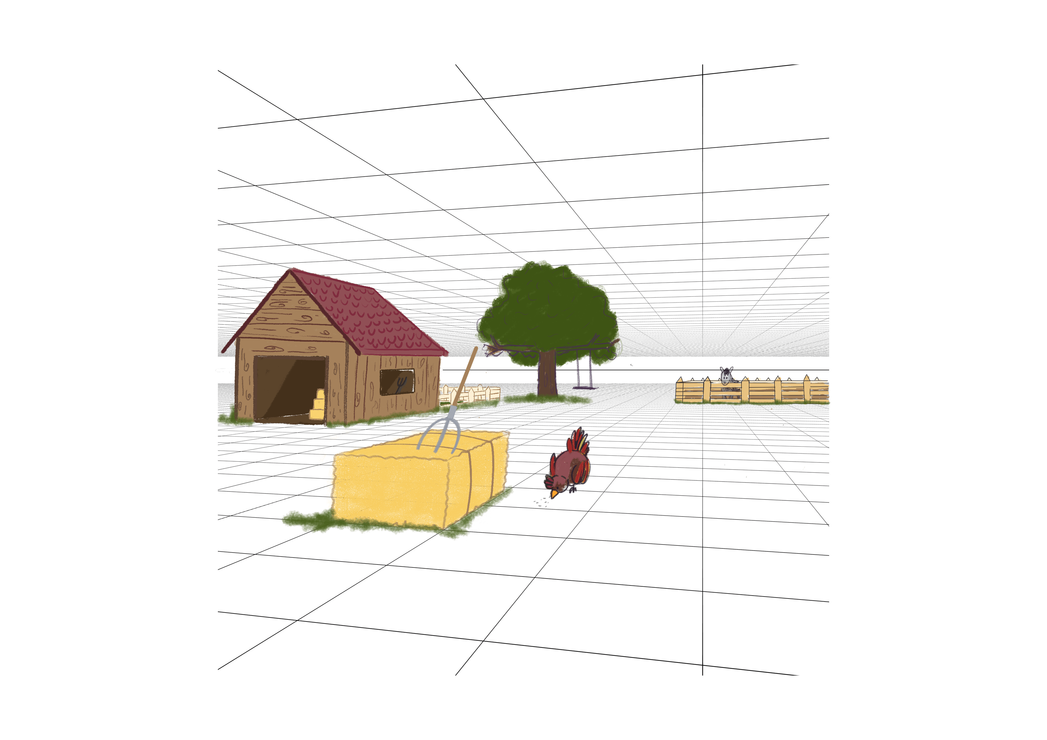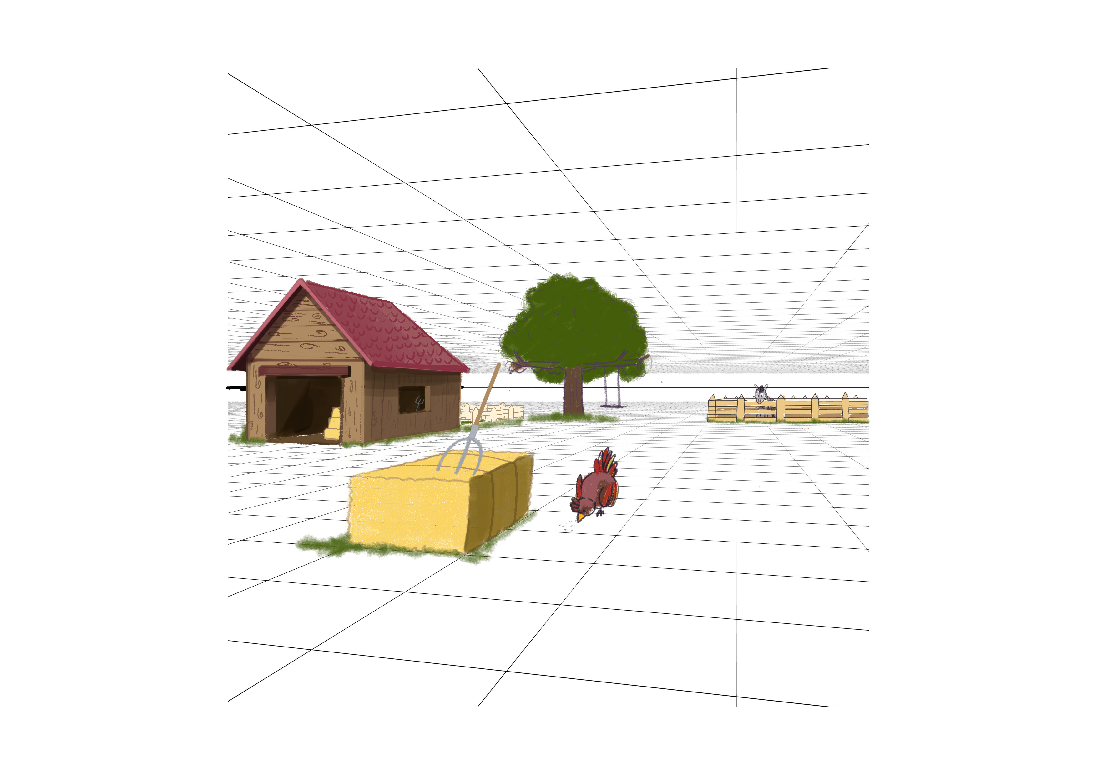 L'autre aspect c'est la composition: tu as fait l'effort de dessiner des éléments de premier plan comme la barrière et les poulets, mais ta maison, ta grange et la barrière sont tous détachés les uns des autres. En les superposant en partie, tu peux rendre ton image plus vivante et donner plus de profondeur en "connectant" les différents niveaux de profondeur et les faisant interagir.