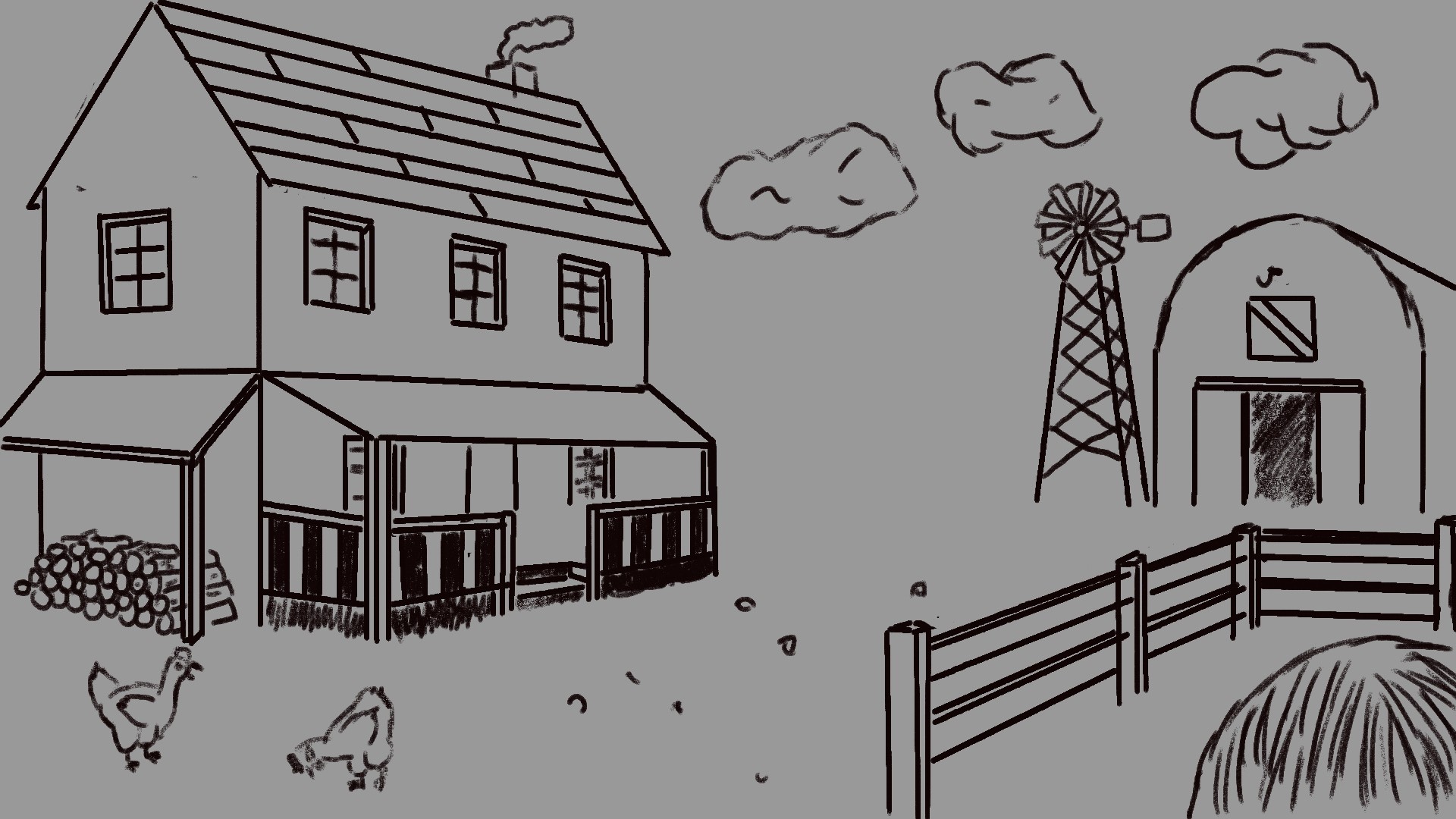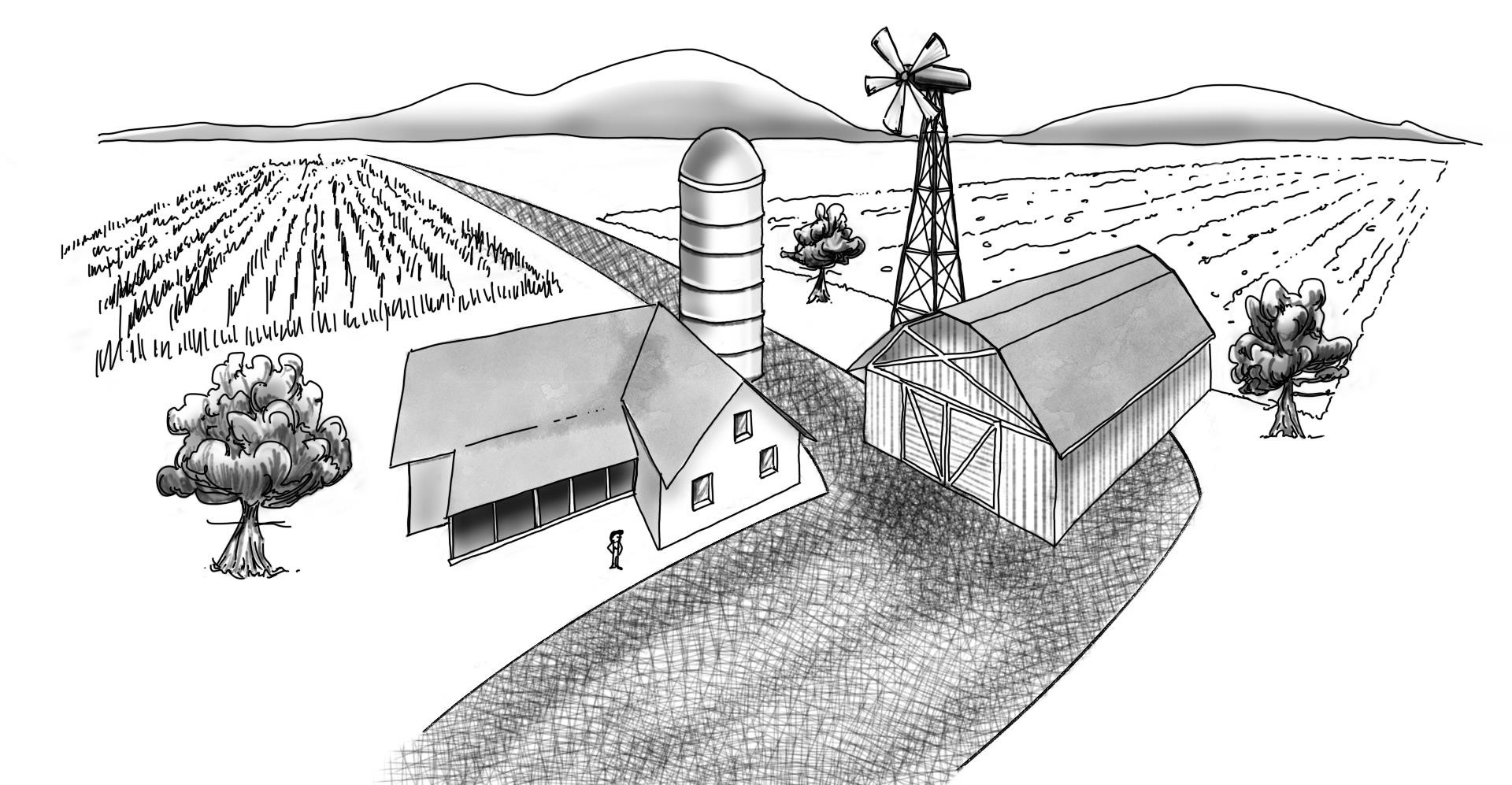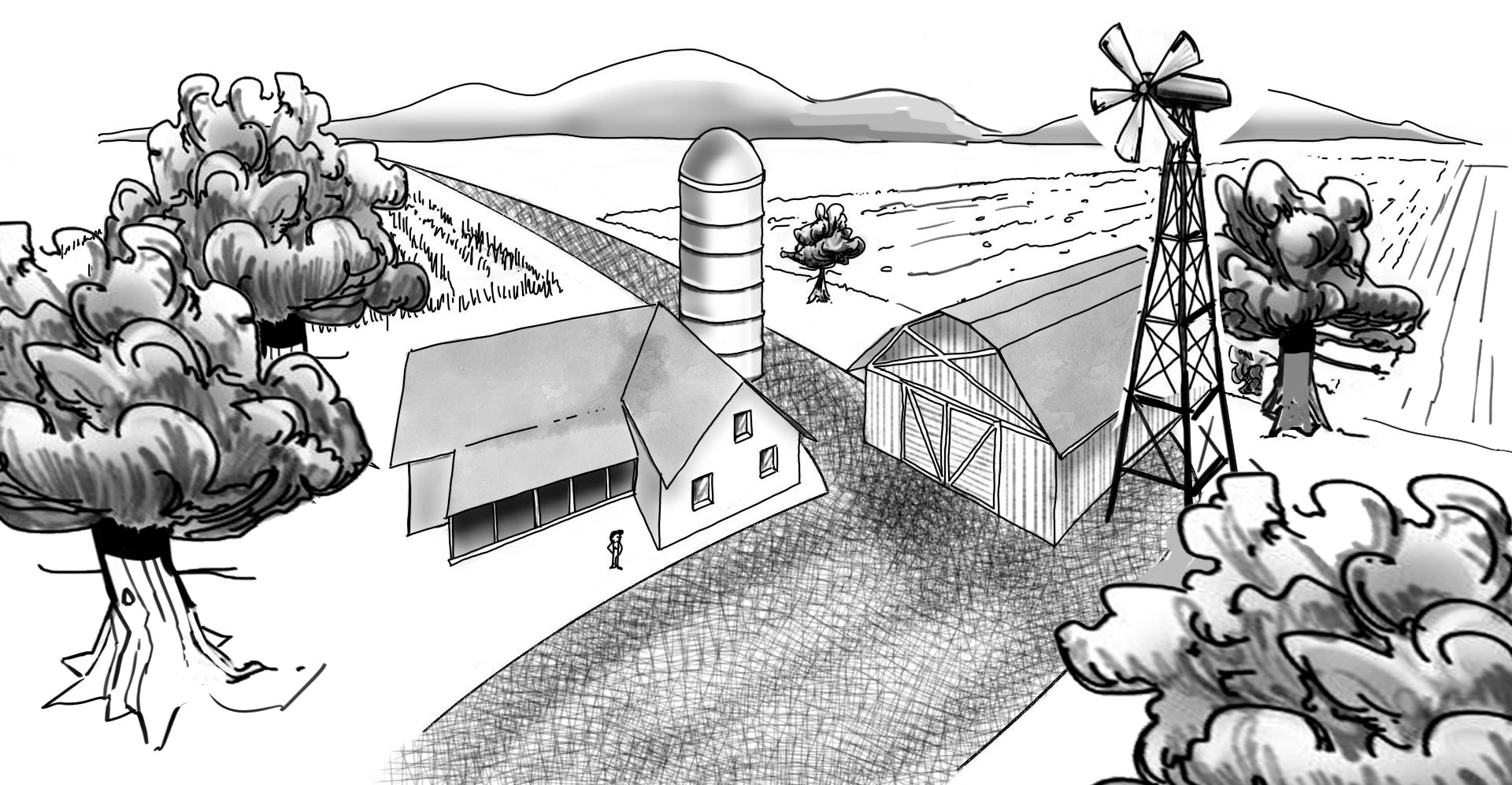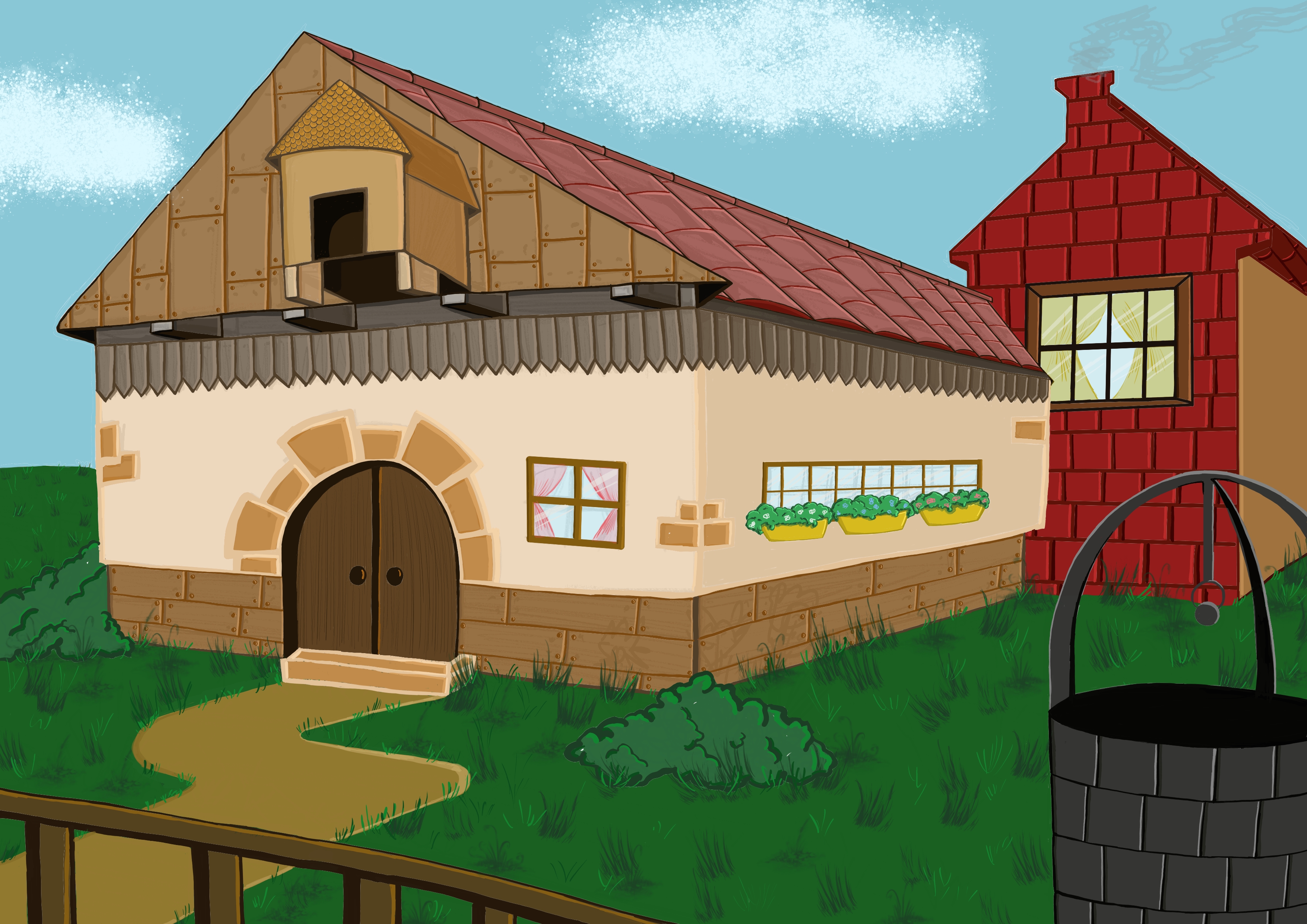 Here is my farm! I had quite a few issues with the perspective since we don't necessarily have all the lines, but the result seems coherent to me.