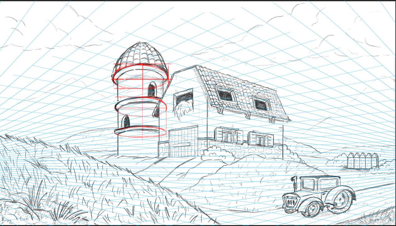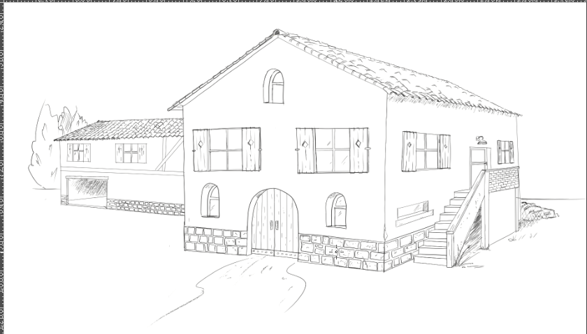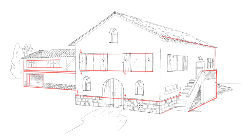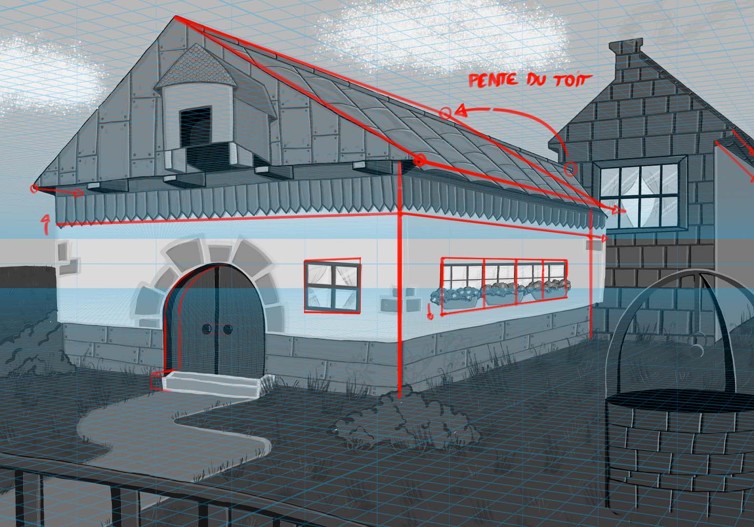 Le premier c'est la ligne d'horizon: certaines de tes lignes de fuites ne convergent pas ensemble sur ta maison, ce qui rend ta perspective un peu bancale. Ce n'est pas un gros décalage, donc ça ne se voit pas au premier coup d'œil, mais ça joue. c'est surtout l'avant toit du porche qui pose problème à ce niveau.
