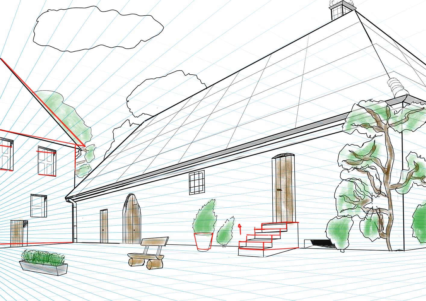 j'ai mis en rouge des traits de constructions qui mériteraient d'être déplacés (en général c'est uin problème de doser leur inclinaison). mais ce sont de petites corrections. Je trouve que de manière générale tu as bien compris le principe, et avec de la pratique et un peu plus de rigueur, tu devrais très bien t'en sortir. fais attention à bien placer ta ligne d'horizon et tes points de fuites, ce sont tes principaux repères et ils ne doivent pas bouger!