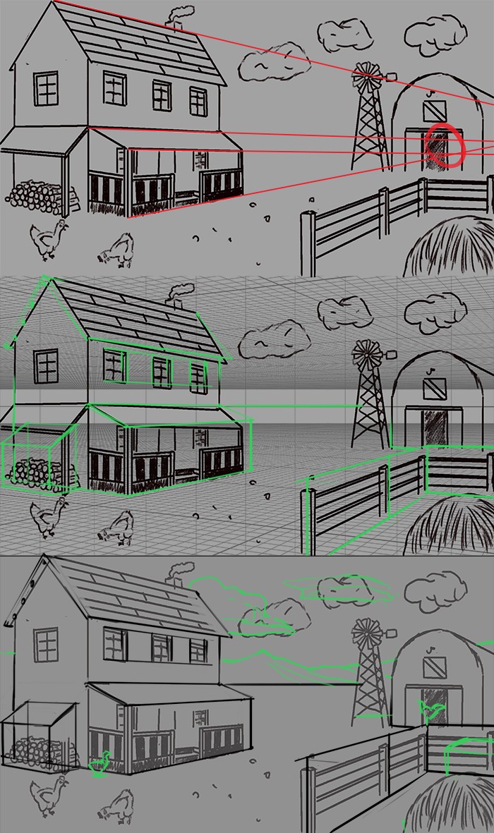 The other aspect is the composition: you made the effort to draw foreground elements such as the fence and the chickens, but your house, your barn, and the fence are all detached from each other. By partially overlapping them, you can make your image more lively and add more depth by "connecting" the different depth levels and making them interact.