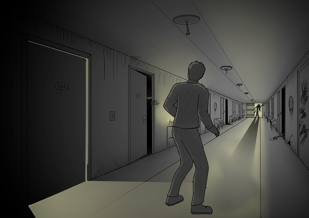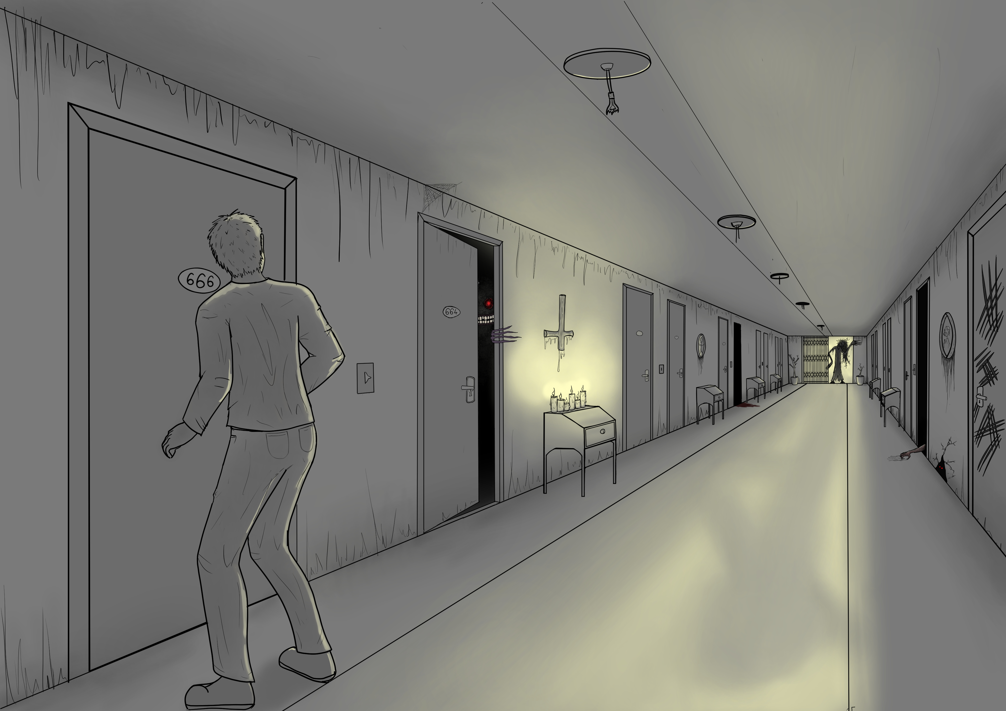 Now, for the composition: you brought the character to the edge because you were worried that the character would be in your way when drawing the hallway, but now he ends up off-center, whereas as the protagonist, he is important to your illustration: the image isn't as threatening if it's just the monsters, and no one in danger. I recommend moving him back towards the center of the image. Using a different layer for the character will allow you to hide it when you want to focus on the perspective and the setting. Finally, you can emphasize the shadows to make the atmosphere more oppressive and claustrophobic.