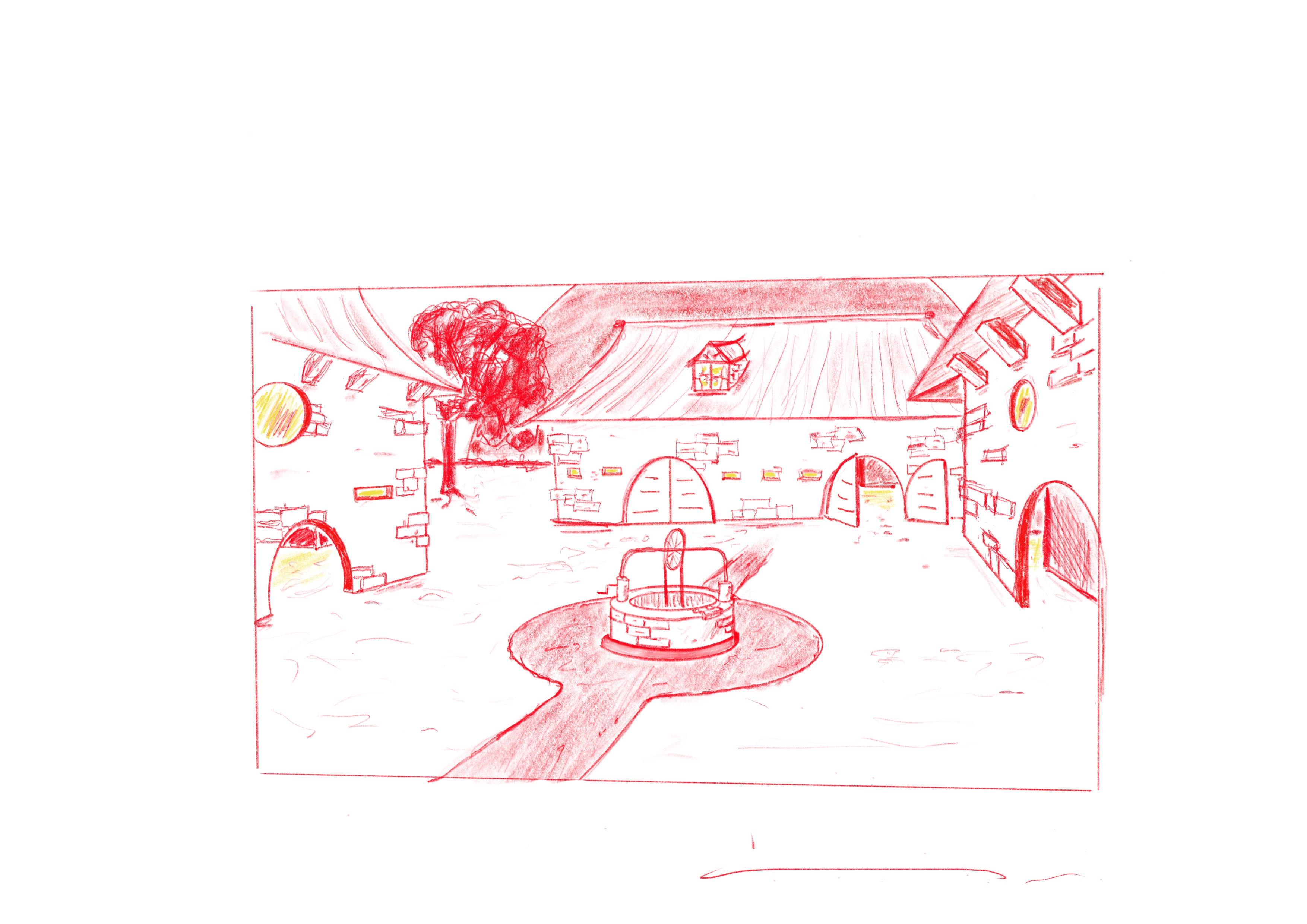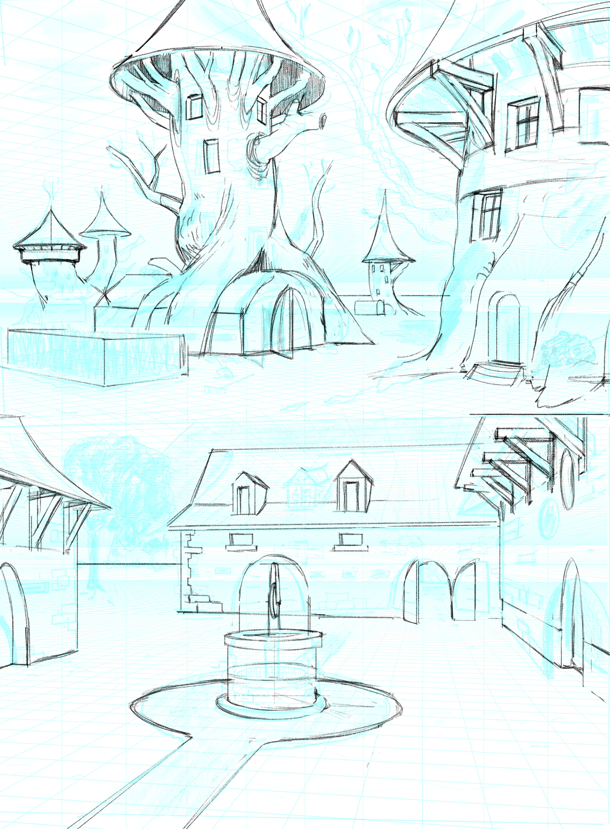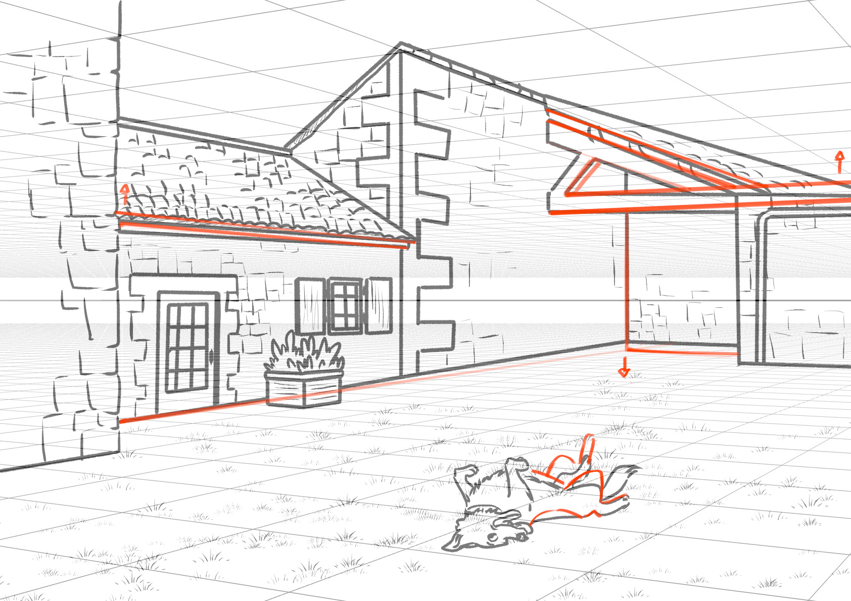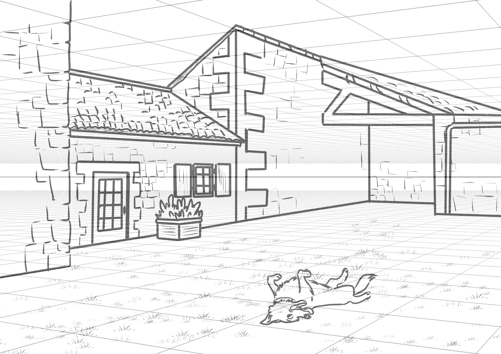 For your farm, the small issue you have is that your well is very flat, because it seems like you want to avoid stacking elements. However, stacking is one of the best ways to create a credible and rich perspective; also don’t forget that the walls of buildings, particularly on older buildings, are relatively thick, which should be visible around the doors and windows. The top of the doors of the central building aligns with the horizon line; if all these doors are the same size and at the same height, then all the other doors should also have their tops at the height of the horizon line. But otherwise, your drawing follows the grid quite well, which shows that you have understood the general principles; you just need to practice a bit more to gain confidence in your ability to think about an environment in three dimensions.