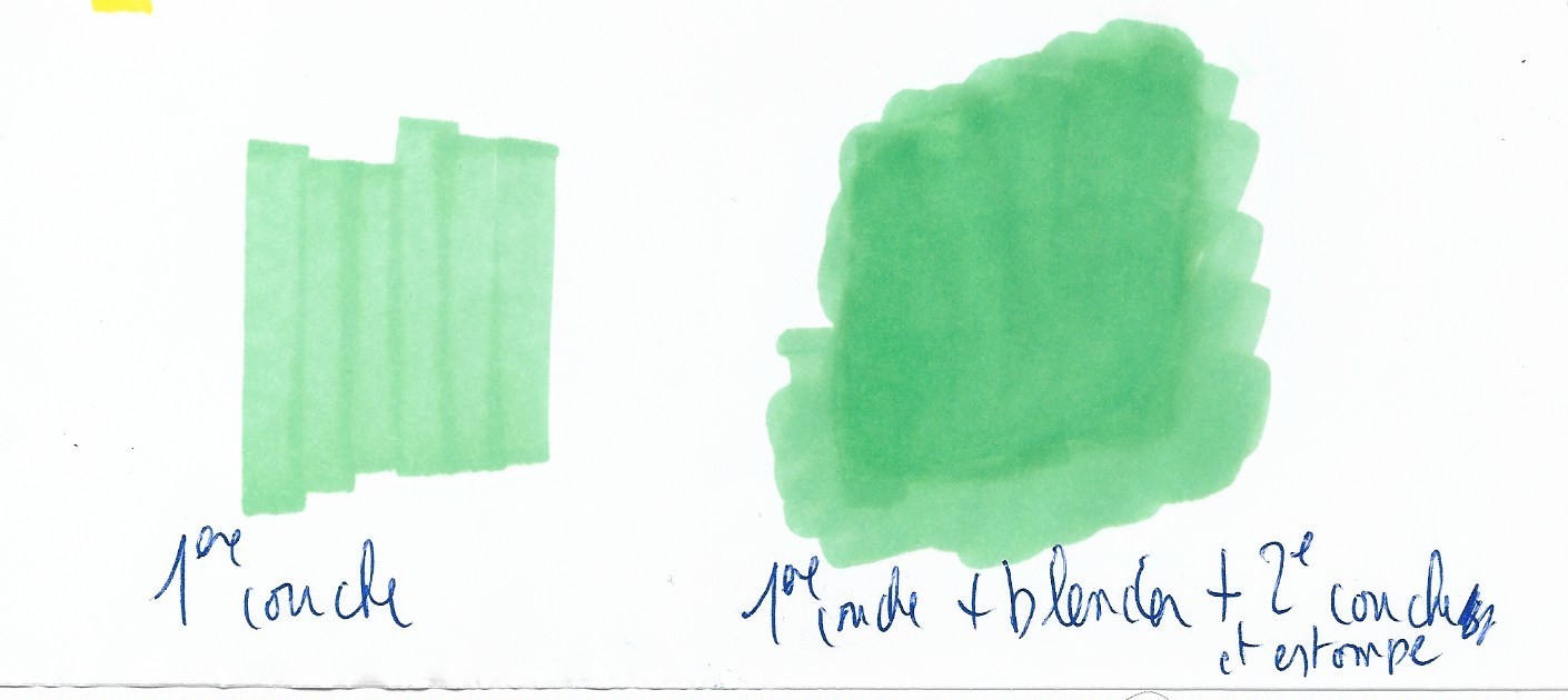 je crois que j'ai trouvé 1 solution. Il faut utiliser 1 feutre blender (mélangeur) graphit, ou pour moi, Winsor et Newton. Voila comment faire: 1. tu appliques ta couleur la plus claire par bandes régulières. 2. tu passes par dessus 1 couche de blender avec le bout large, et tu passes vite par dessus la 2eme couche de ta couleur, par petits cercles. 3. tu estompes éventuellement avec le bout de l'index, que tu protèges éventuellement avec 1 bout de film alimentaire (je me méfie du passage de l'alcool, des pigments et des solvants dans la peau à la longue...) et ça donne 1 fondu plus sombre que ce que tu avais au départ, mais fini les zones ! Attention à la qualité du papier, même le layout a tendance à faiblir avec l'alcool du blender, il faudra essayer du bristol pas trop fort en grammage, j'ai pas pu le faire, j'en ai pas , mais je vais en acheter. Tout ça est basé sur le même principe que pour les dégradés, que j'arrive enfin à faire ! Ah oui, mieux vaut acheter plusieurs blender, pour en avoir d'avance, j'en ai flingué 1 à force de faire des essais... voila, j'espère que cette solution te conviendra, mais pour moi c'est plié, je fais comme ça maintenant. Bonne journée.