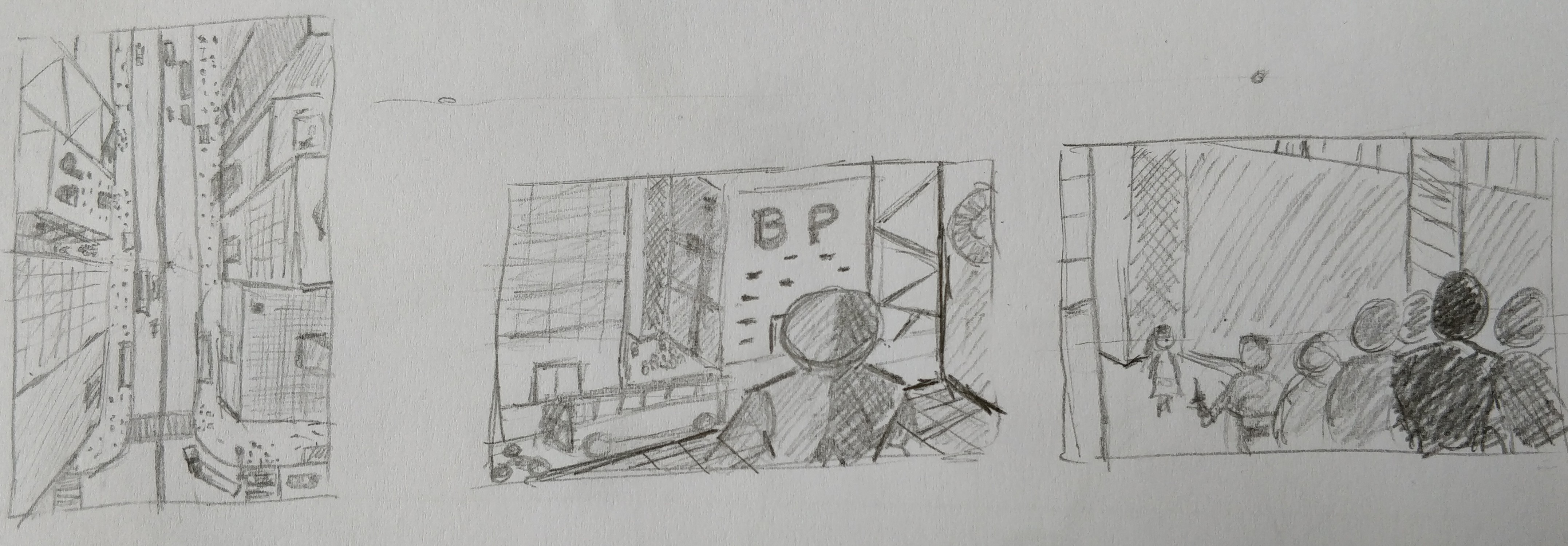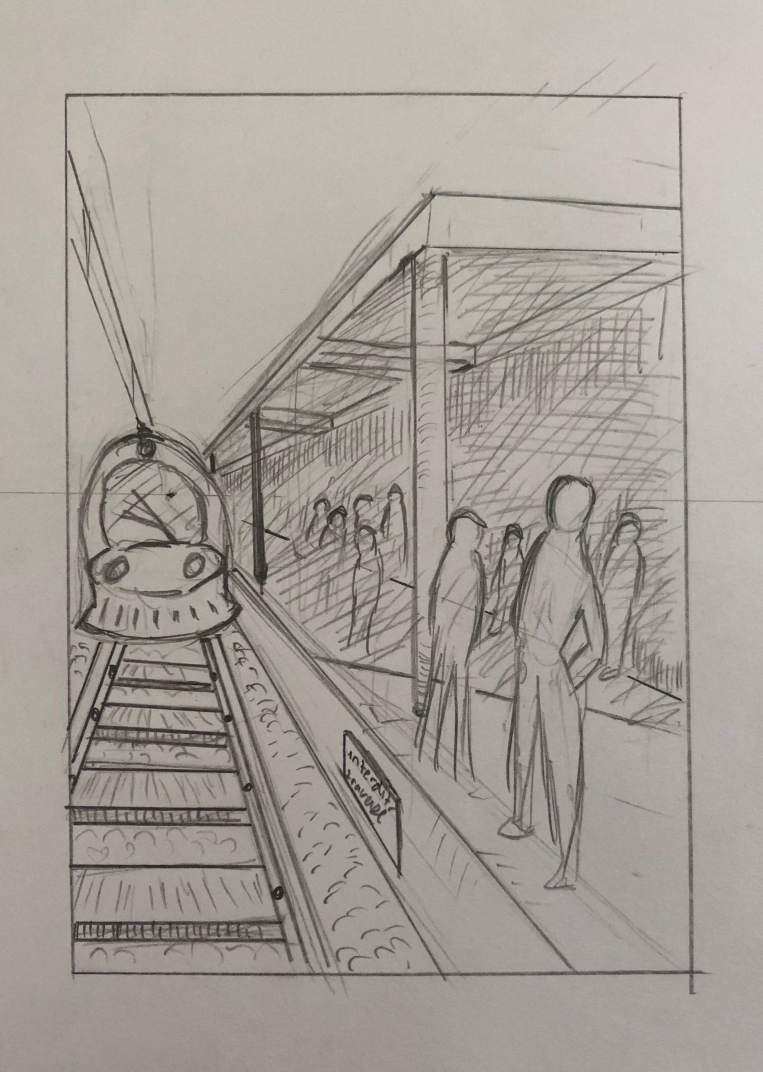 I made a rough sketch wanting to initially draw the eye to the train which breaks the rectangular shapes in the rest of the drawing and then to the 2 characters in the foreground who are outside the shadow caused by the marquee of the platform.