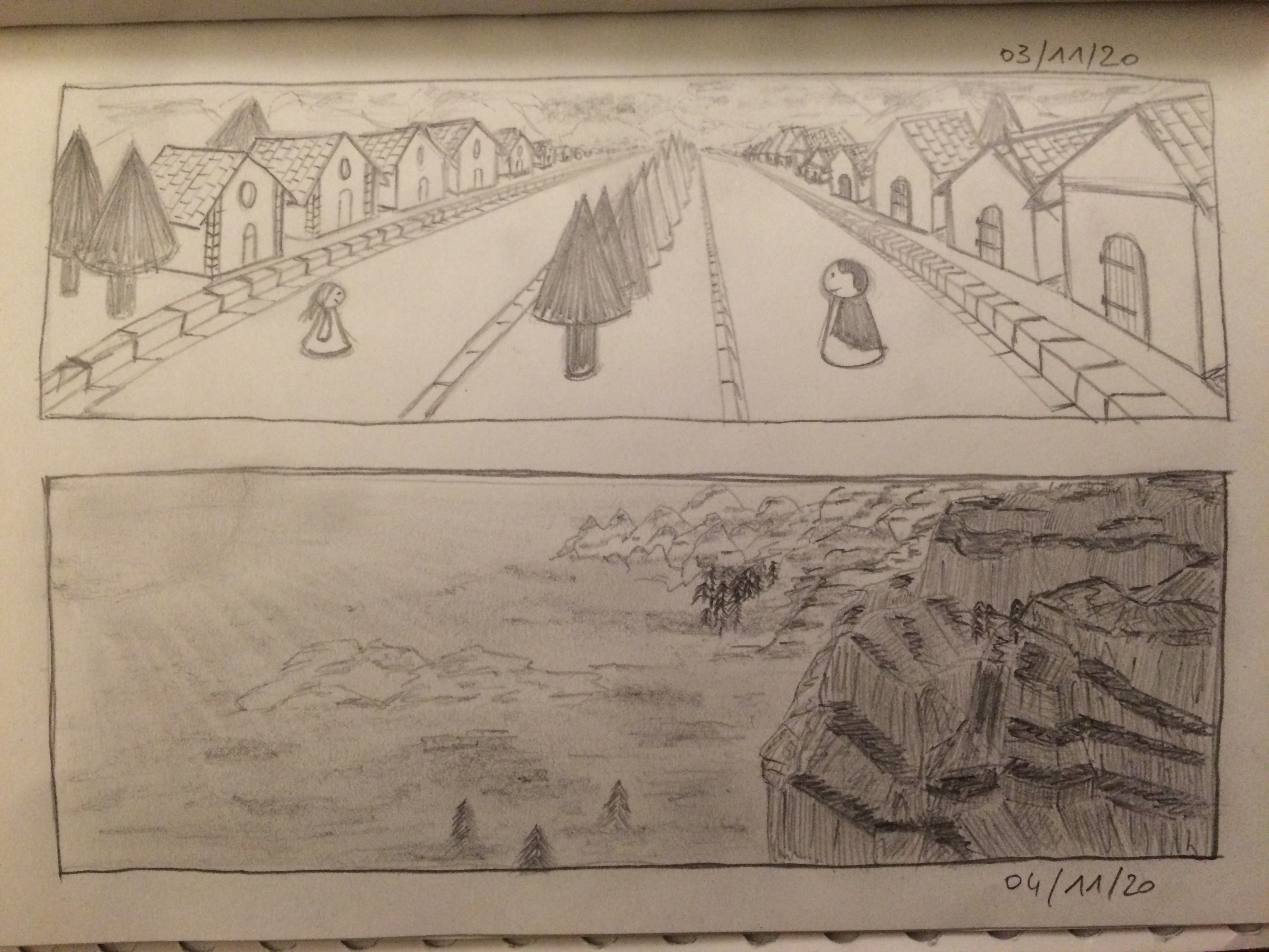 Le 3eme est vachement mieux d'un point de vue compo même s'il y a un souci de perspective. Le chemin conduit le regard vers la maison de manière assez évident mais ça fonctionne. Mais tu mélanges une vue de dessus avec une vue en perspective et ça fait buguer les yeux 😆 Je te joins 2 manières de représenter ta scène plus justes ^^ A gauche un point de vue plus narratif (en perspective) et à droite un point de vue plus global/aérien.