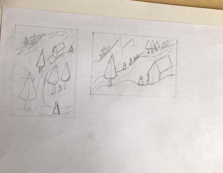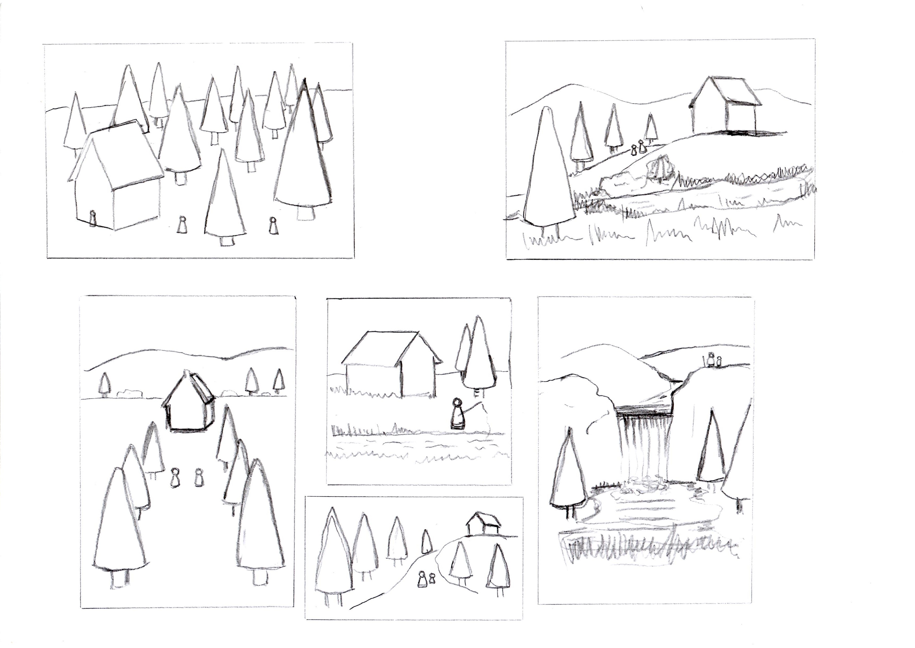 Your last composition is nice, here's how to easily improve it: add some volume to the house, shift the character slightly to the left to decentralize them from the image, and add a river that disappears into the distance to guide the eye and make the background less monotonous. Avoid symmetry with the clouds too :)