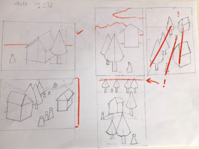 Donc, je te suggère de réessayer cet exercice avec moins d'éléments, et de hiérarchiser les éléments sur l'image : Point important, point secondaire, point peu important qui sert juste à mettre en valeur le reste.
